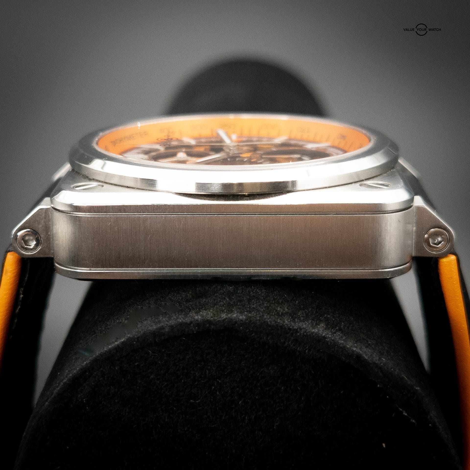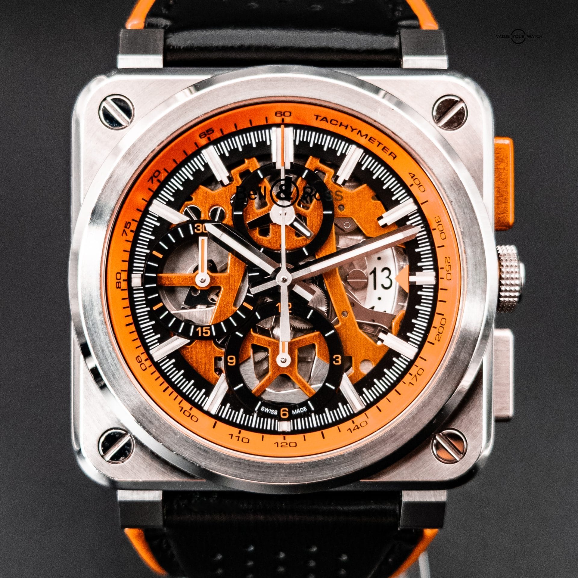 Bell & Ross Aero GT Orange Skeleton Steel Mens Watch BR0394. Limited Edition of only 500 watches. Automatic self-winding movement. Stainless steel square case 42.0 mm in diameter. Open balance on a case back. Stainless steel smooth bezel. Scratch resistant sapphire crystal. Orange skeleton dial with index hour markers. Date window at 3 o’clock position. Three chronograph sub-dials: 30 minute, 12 hours and 60 seconds. Black and orange leather strap with steel tang buckle.