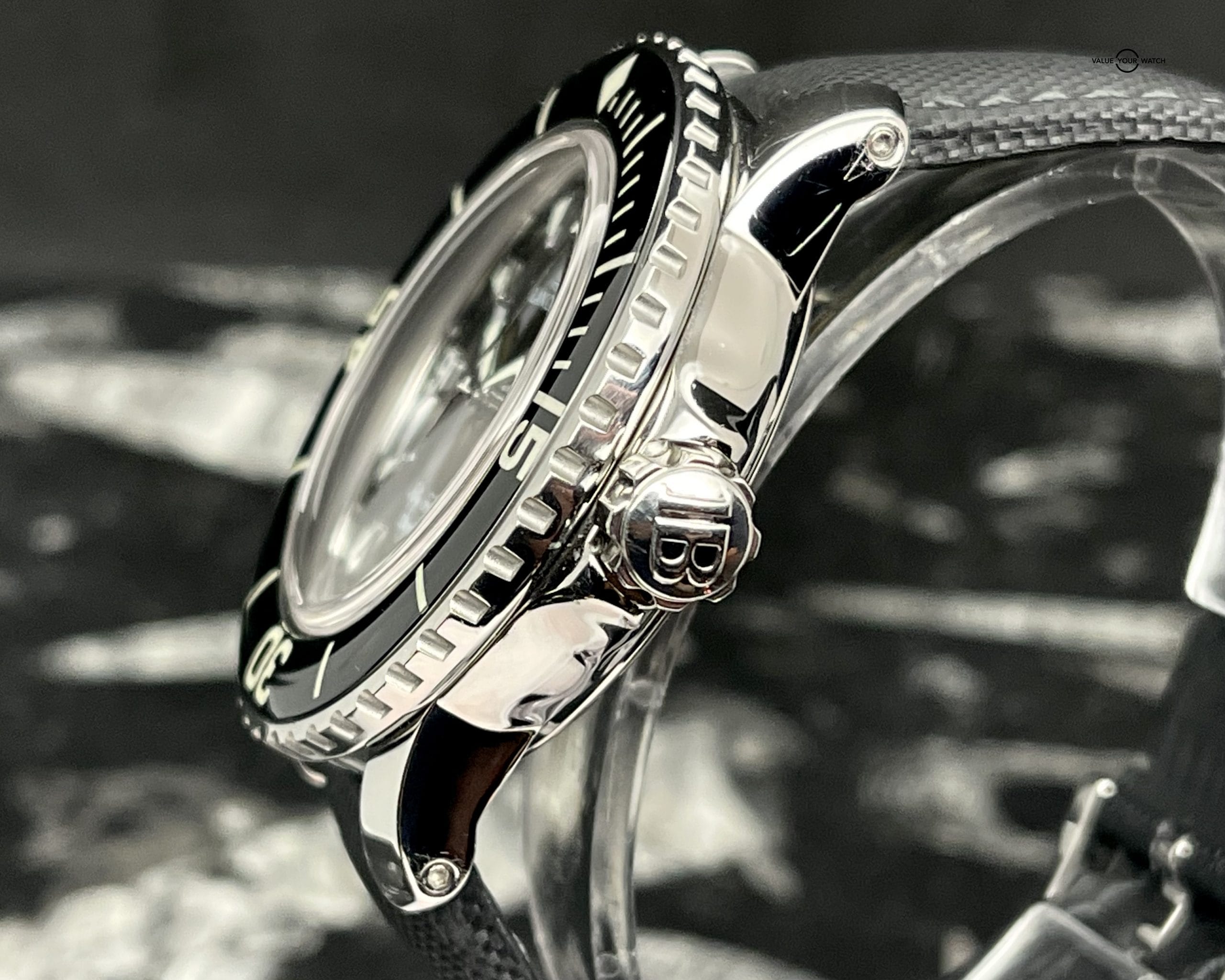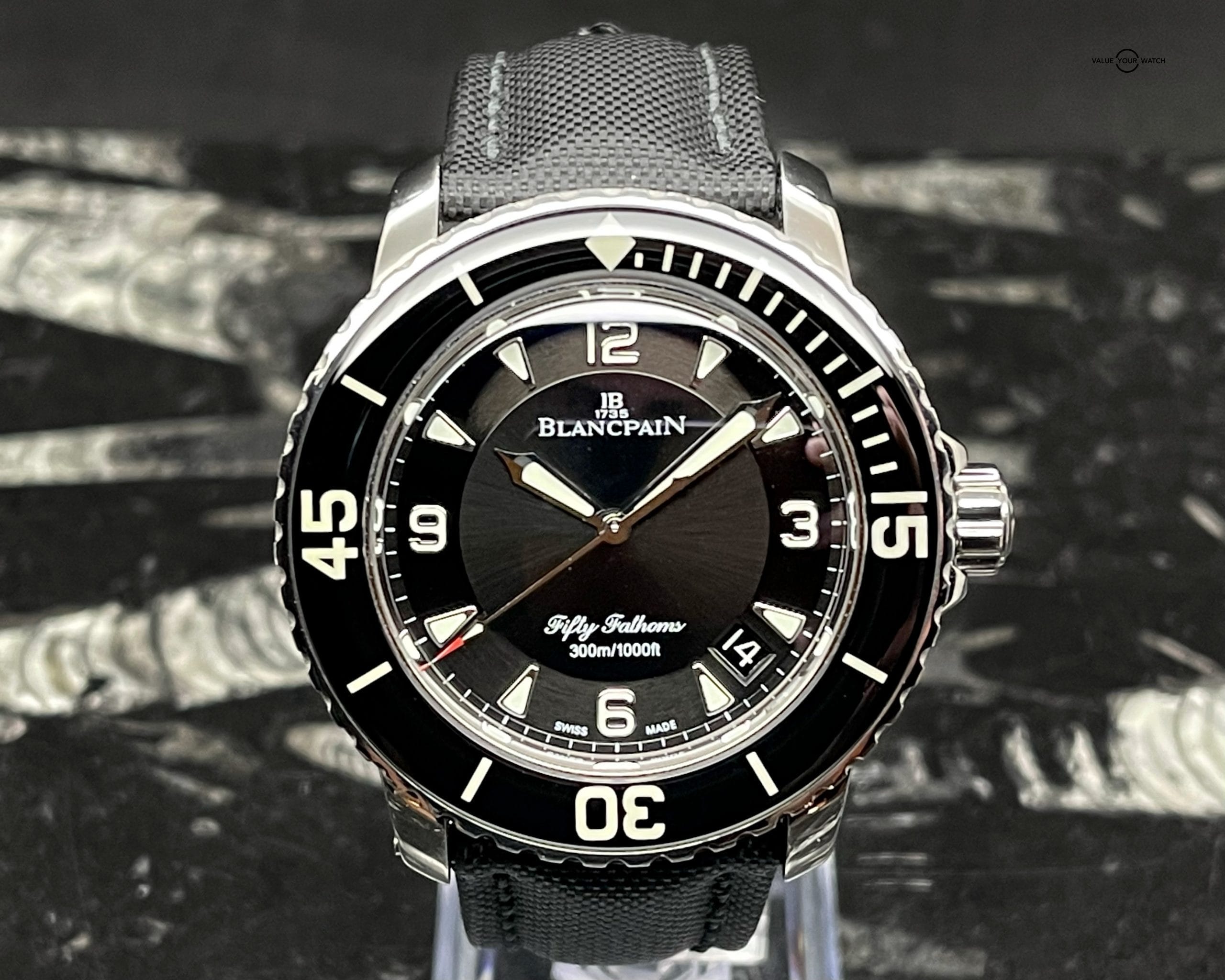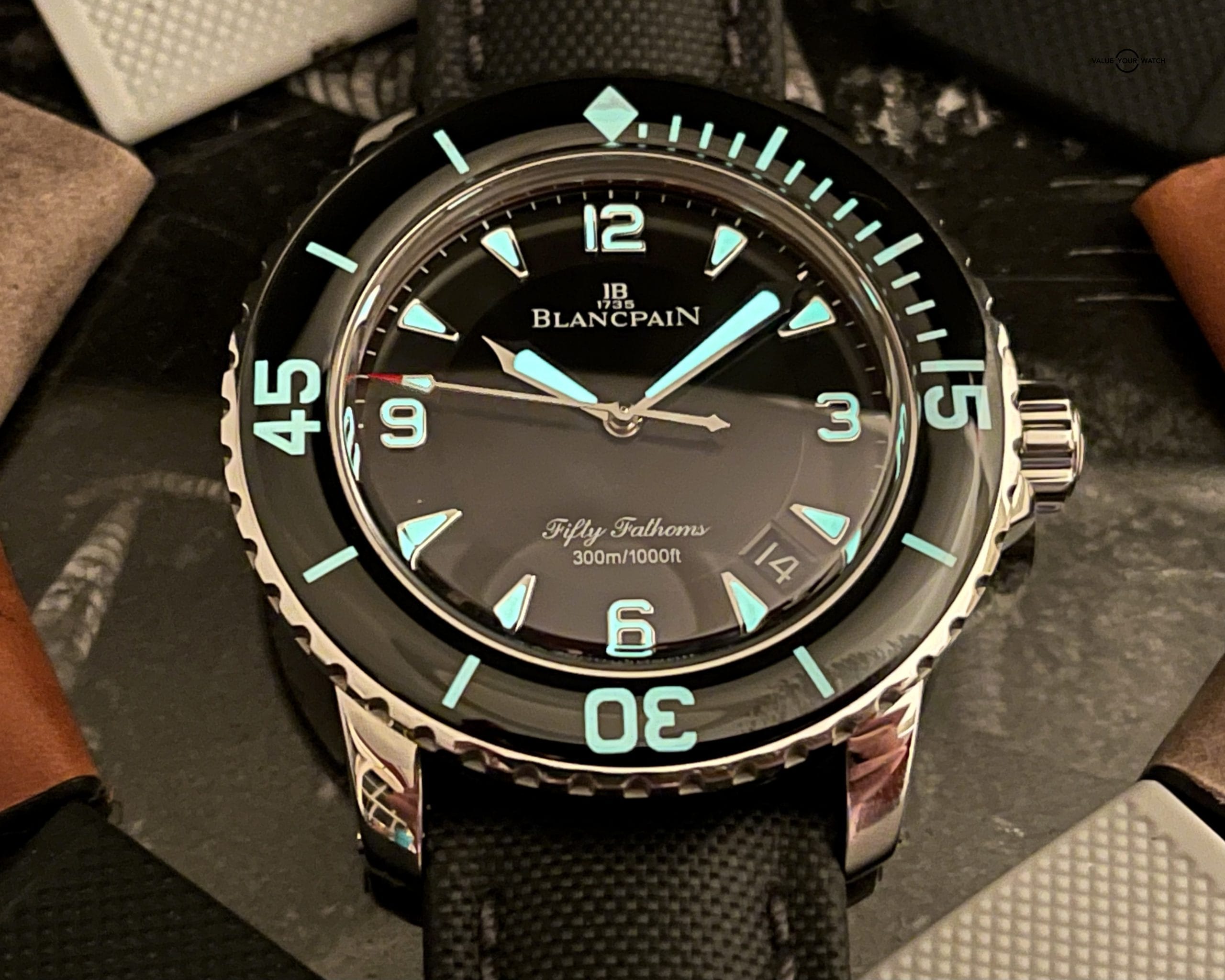 Up for sale is my striking Blancpain Fifty Fathoms with a domed sapphire crystal bezel allowing for complete luminescence, date indicator at 4:30, and 300m of water resistance. This particular model is one of the first 100 made! I love the history behind this watch as well as this brand. With this being the first civilian dive watch, also being issued to the French, US, Israeli, Spanish, and German Navy, on top of being from the oldest running watch manufacturer, there is a lot of history in this watch!