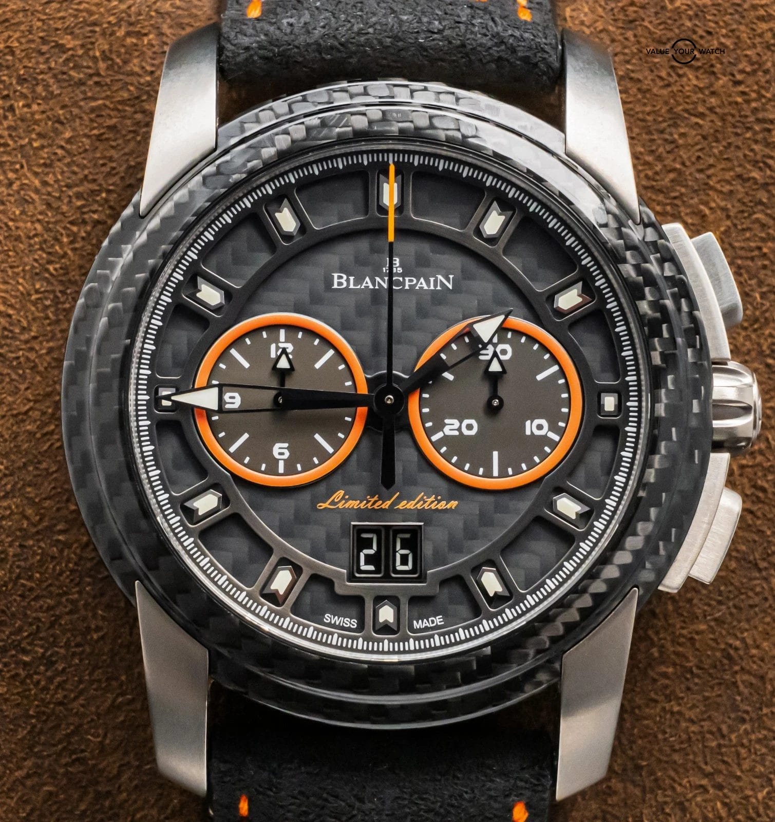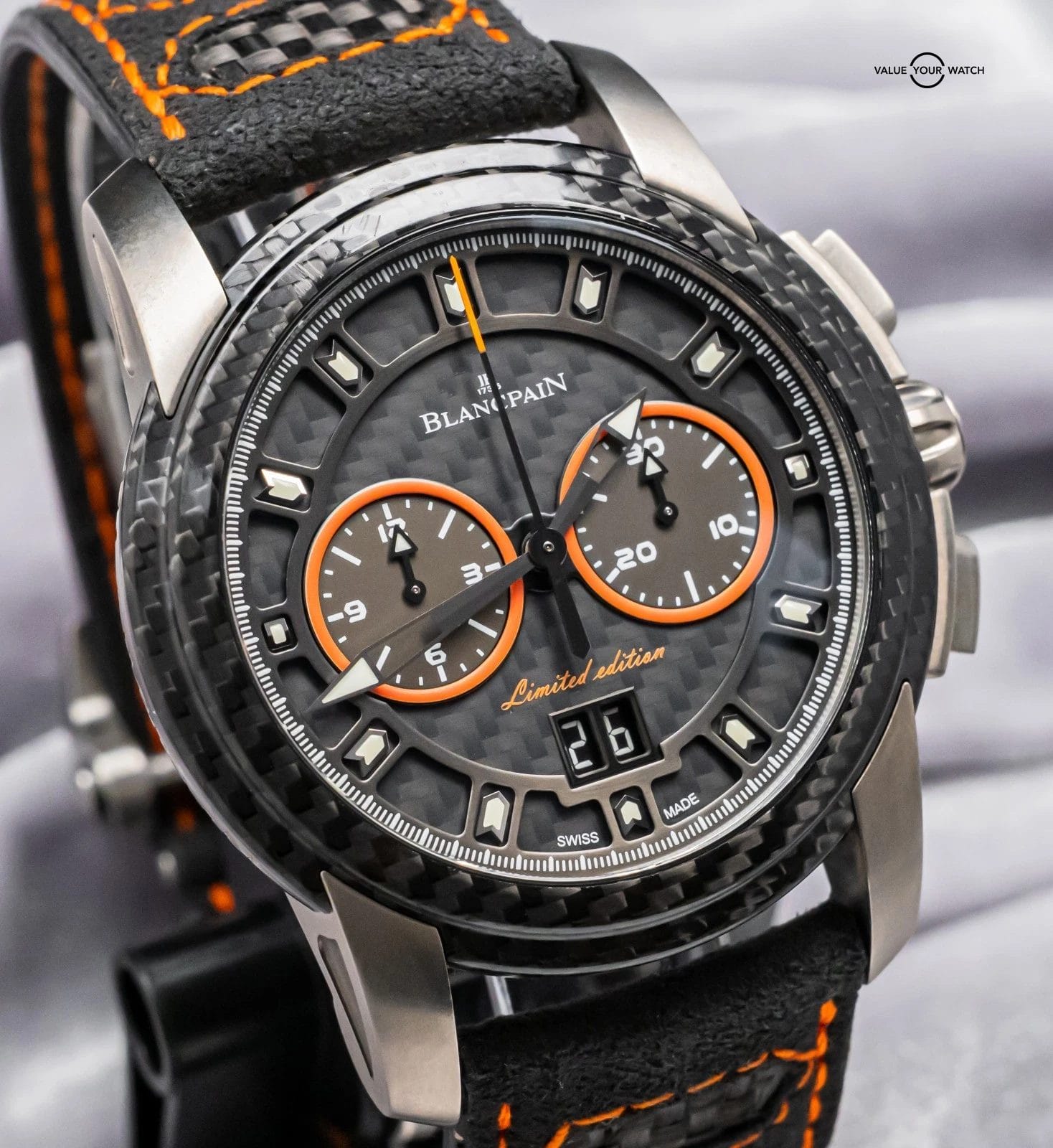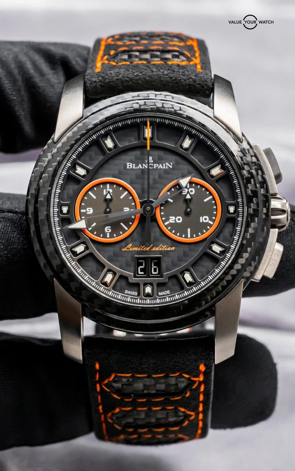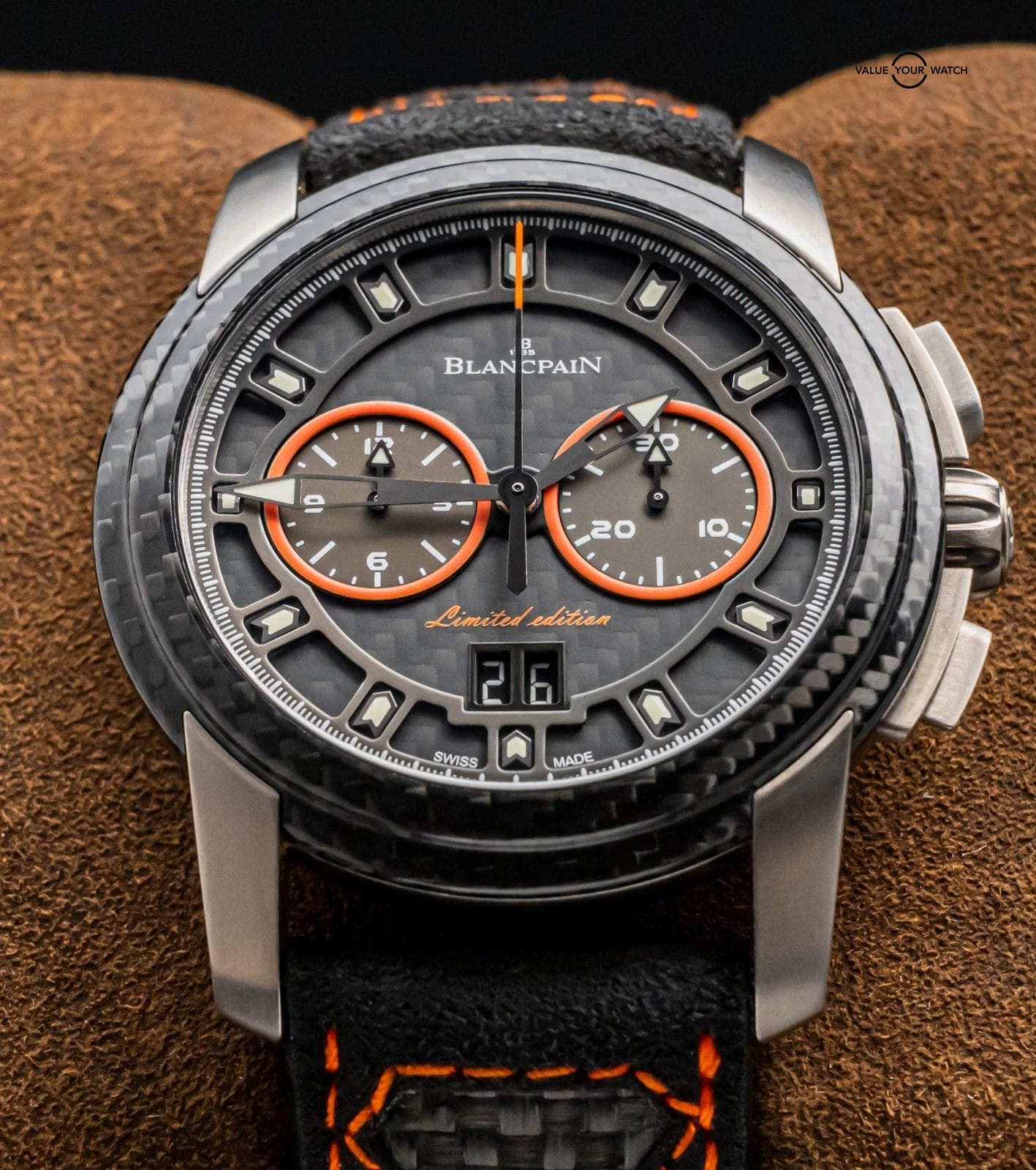 STRIKING Blancpain L-Evolution R Chronograph Flyback Grande Date Carbon Limited Edition of 88 in Titanium 43.5 mm with Carbon Fiber Bezel and Black & Orange Dial on matching Black & Orange Leather Blancpain Strap! Arrives as a complete set with original Blancpain special boxes and papers including the international warranty card. This is a VERY RARE find being Limited of only 88 Units, and at this time it’s the only one for sale in the country!
