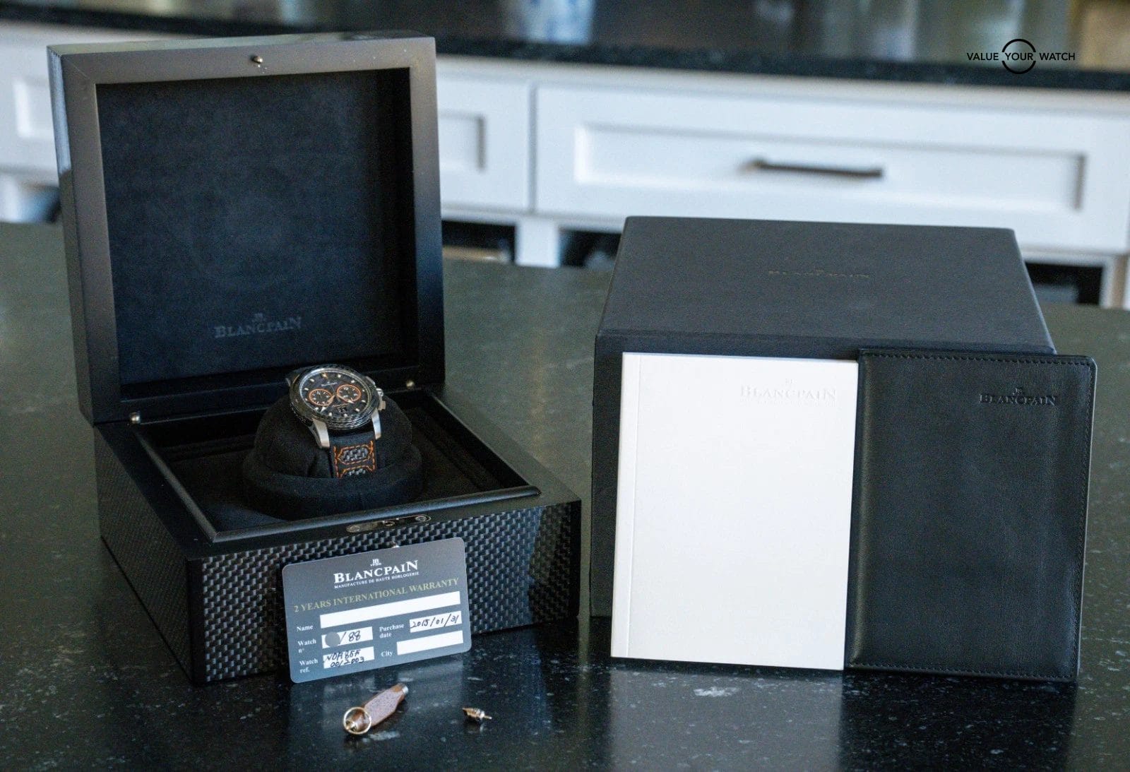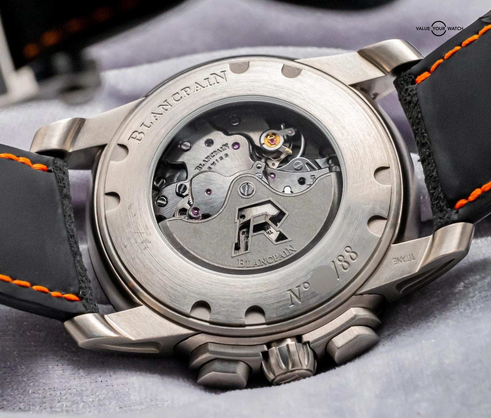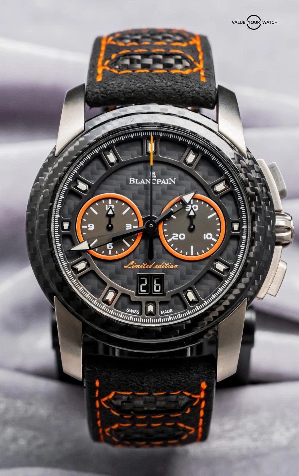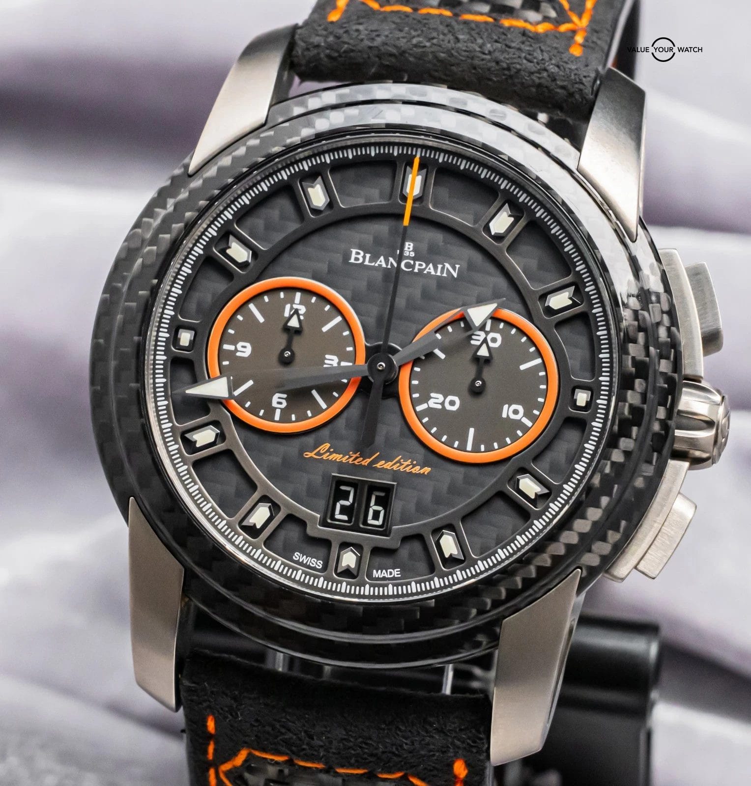 STRIKING Blancpain L-Evolution R Chronograph Flyback Grande Date Carbon Limited Edition of 88 in Titanium 43.5 mm with Carbon Fiber Bezel and Black & Orange Dial on matching Black & Orange Leather Blancpain Strap! Arrives as a complete set with original Blancpain special boxes and papers including the international warranty card. This is a VERY RARE find being Limited of only 88 Units, and at this time it’s the only one for sale in the country!