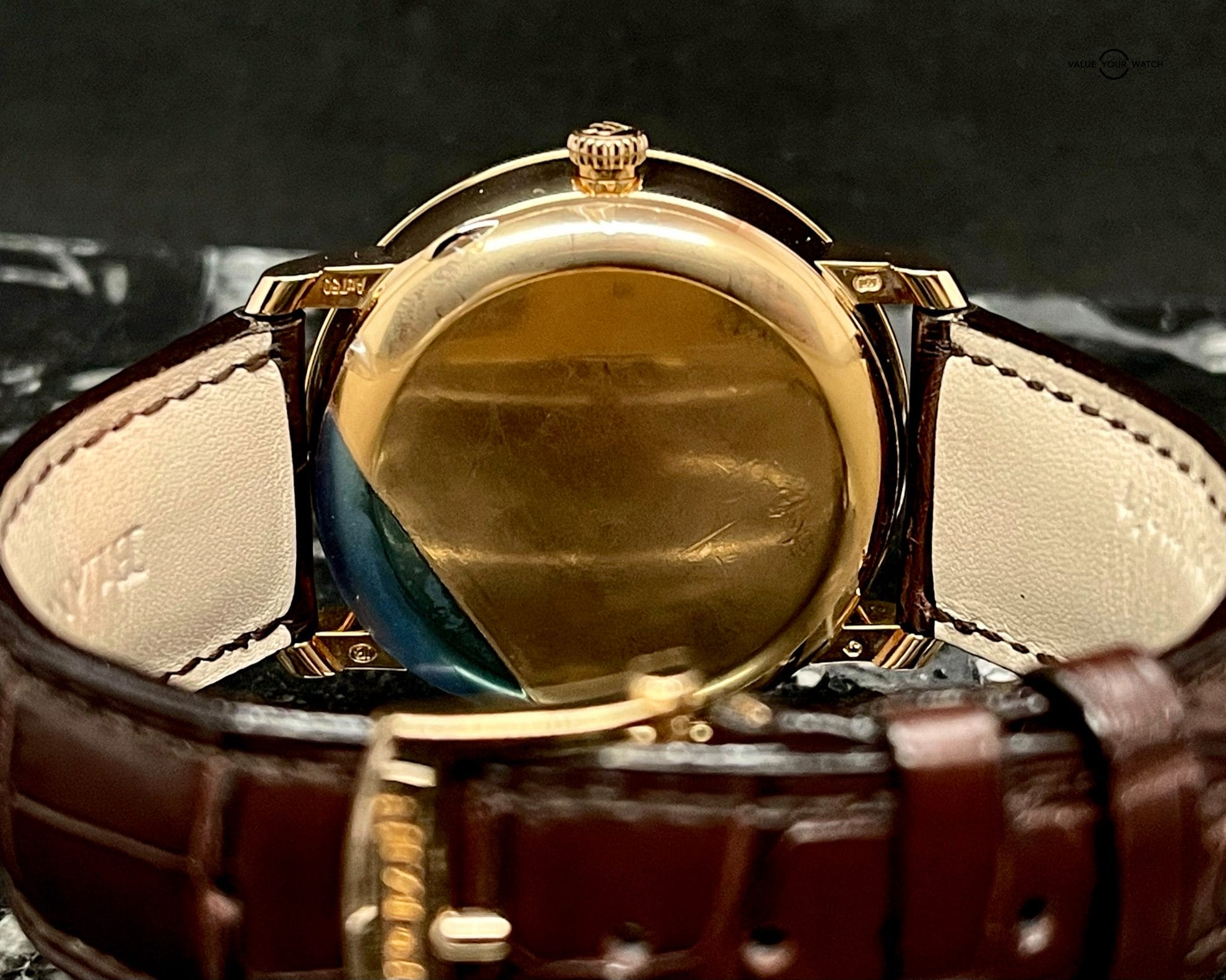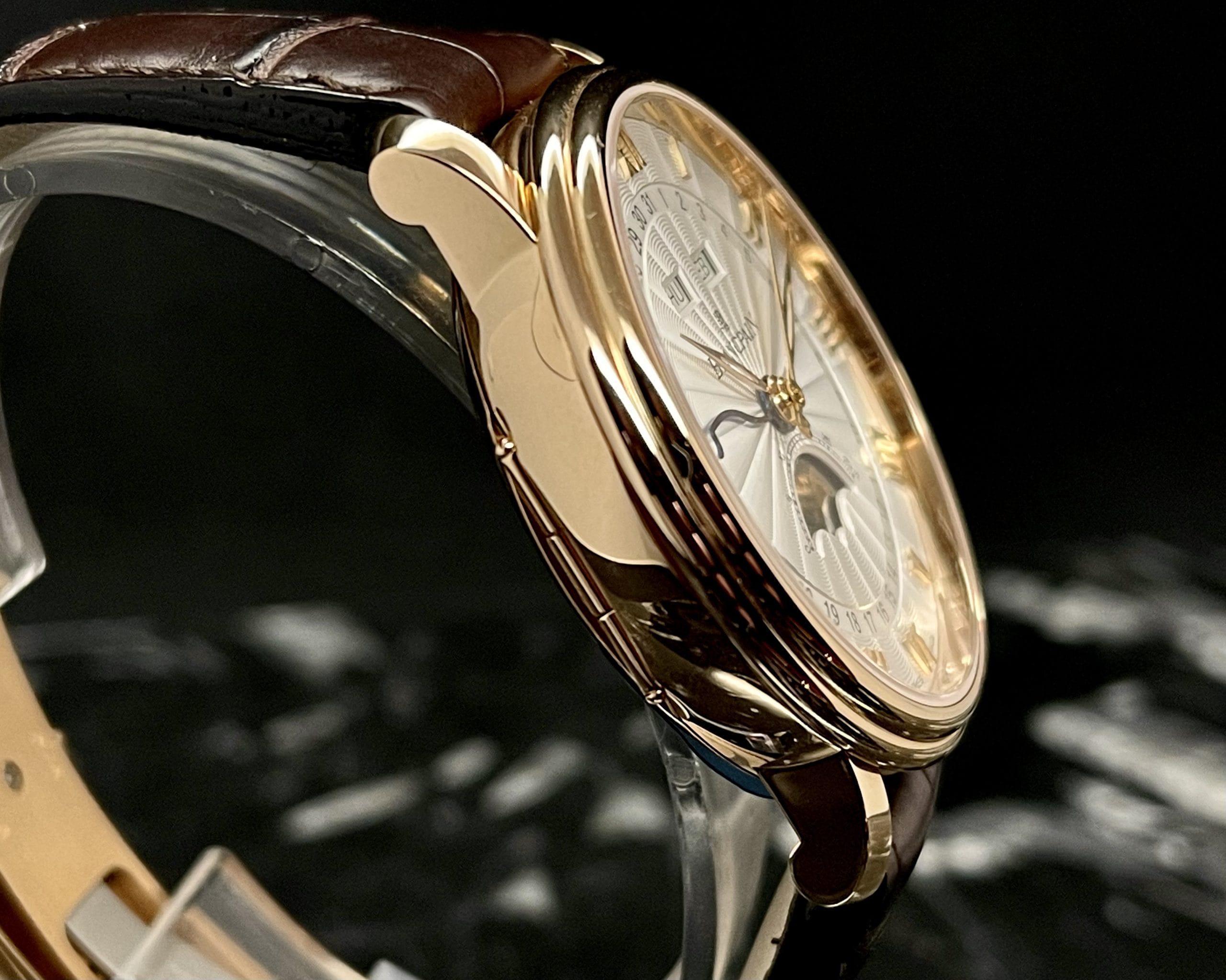 This striking sold rose gold Blancpain beautifully combines class and utility with its complete calendar moonphase. The hunter case back provides the best of both worlds. You aren’t shorted the gold like you would on a standard display back, but you also still have access to see the stunning movement.