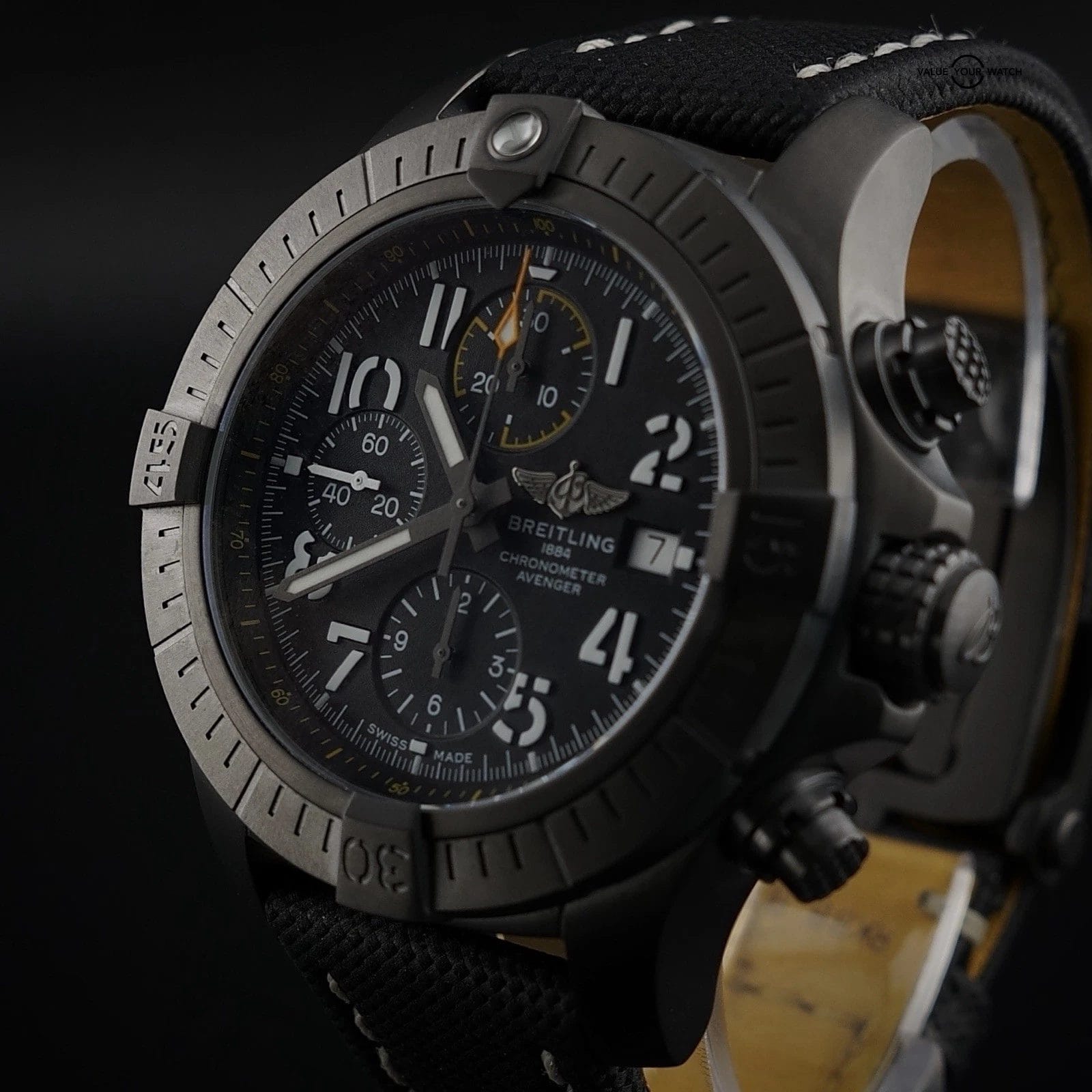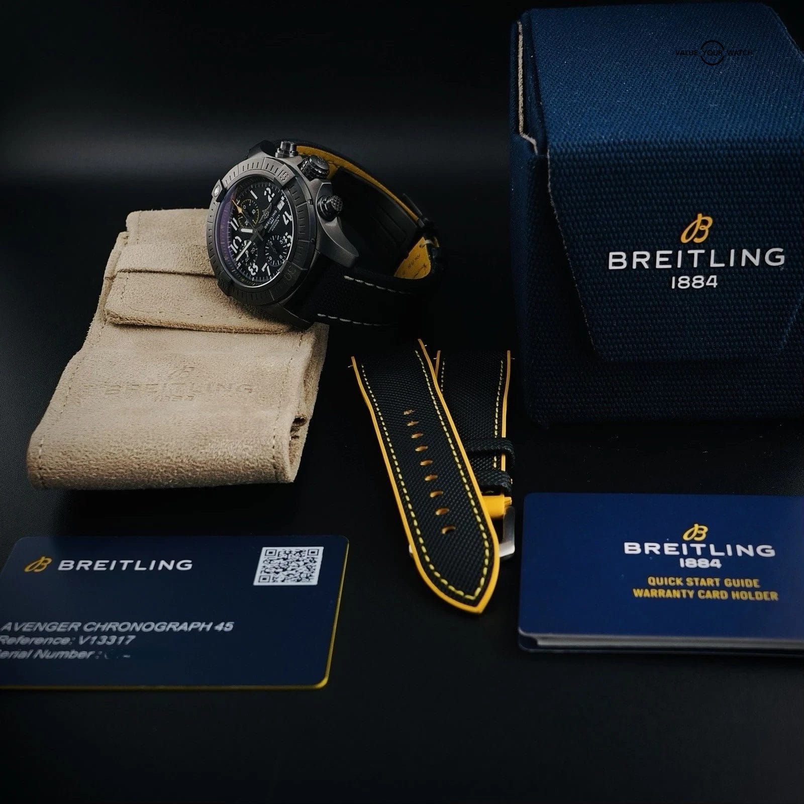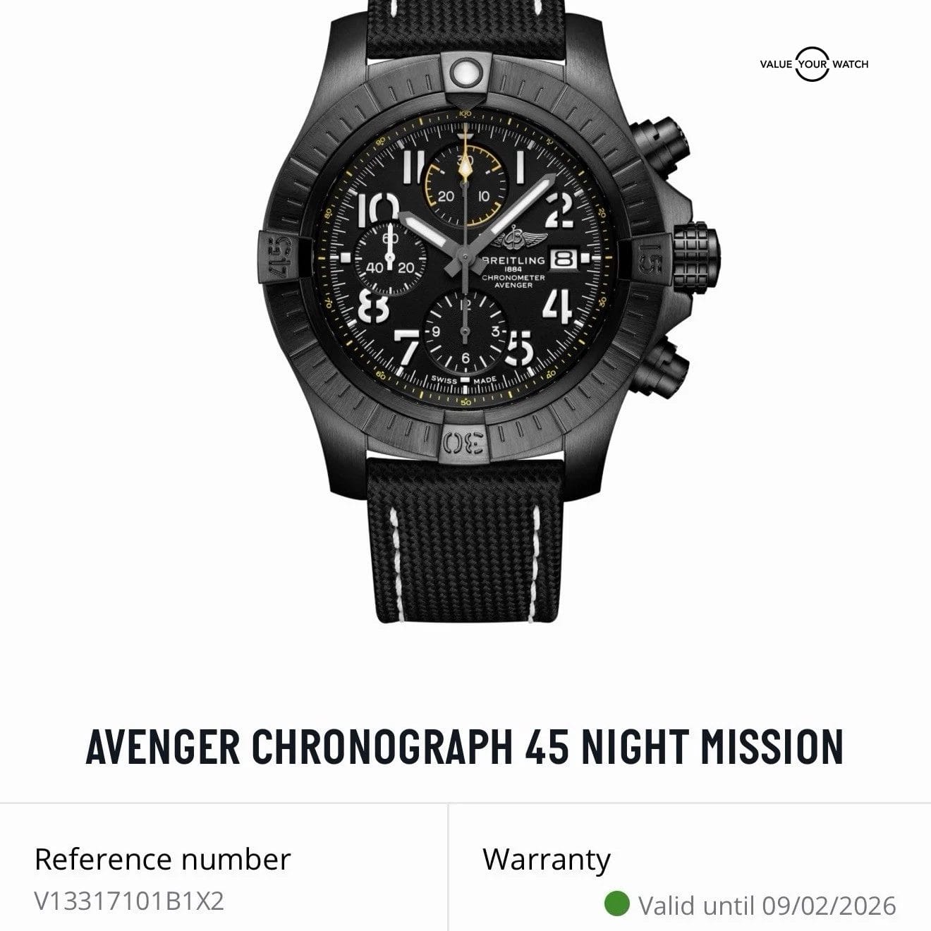 Specification: Breitling Avenger 45 Night Mission V13317 – Full Set, Extra Strap, Warranty