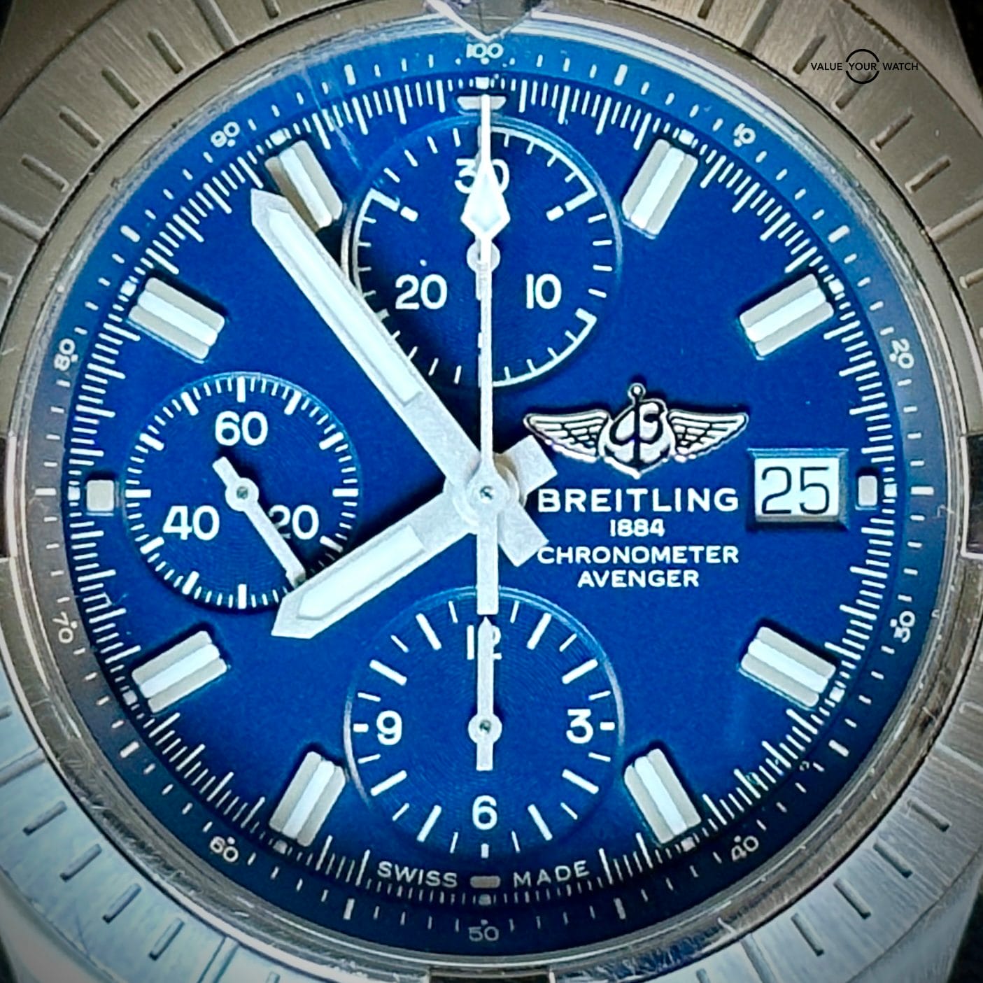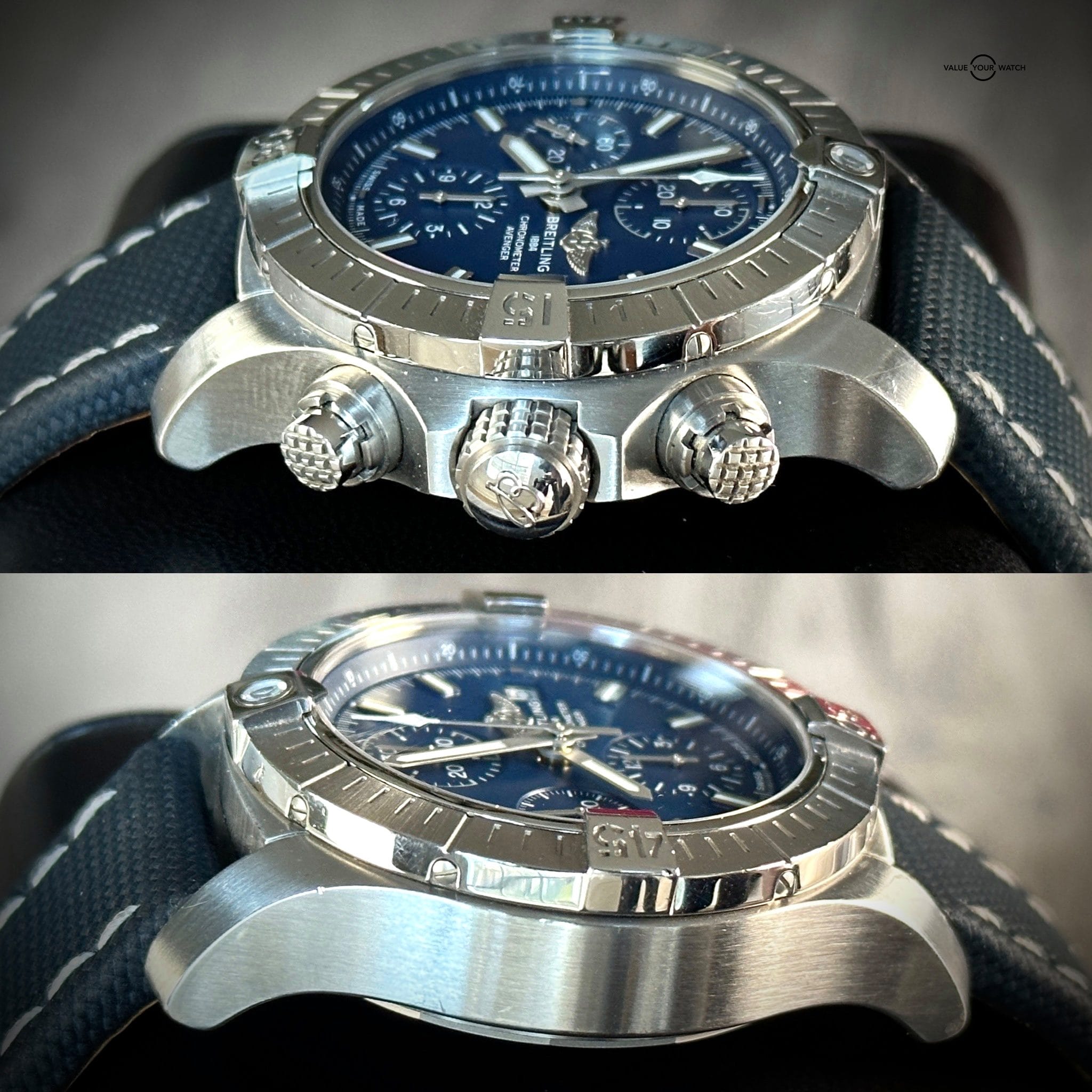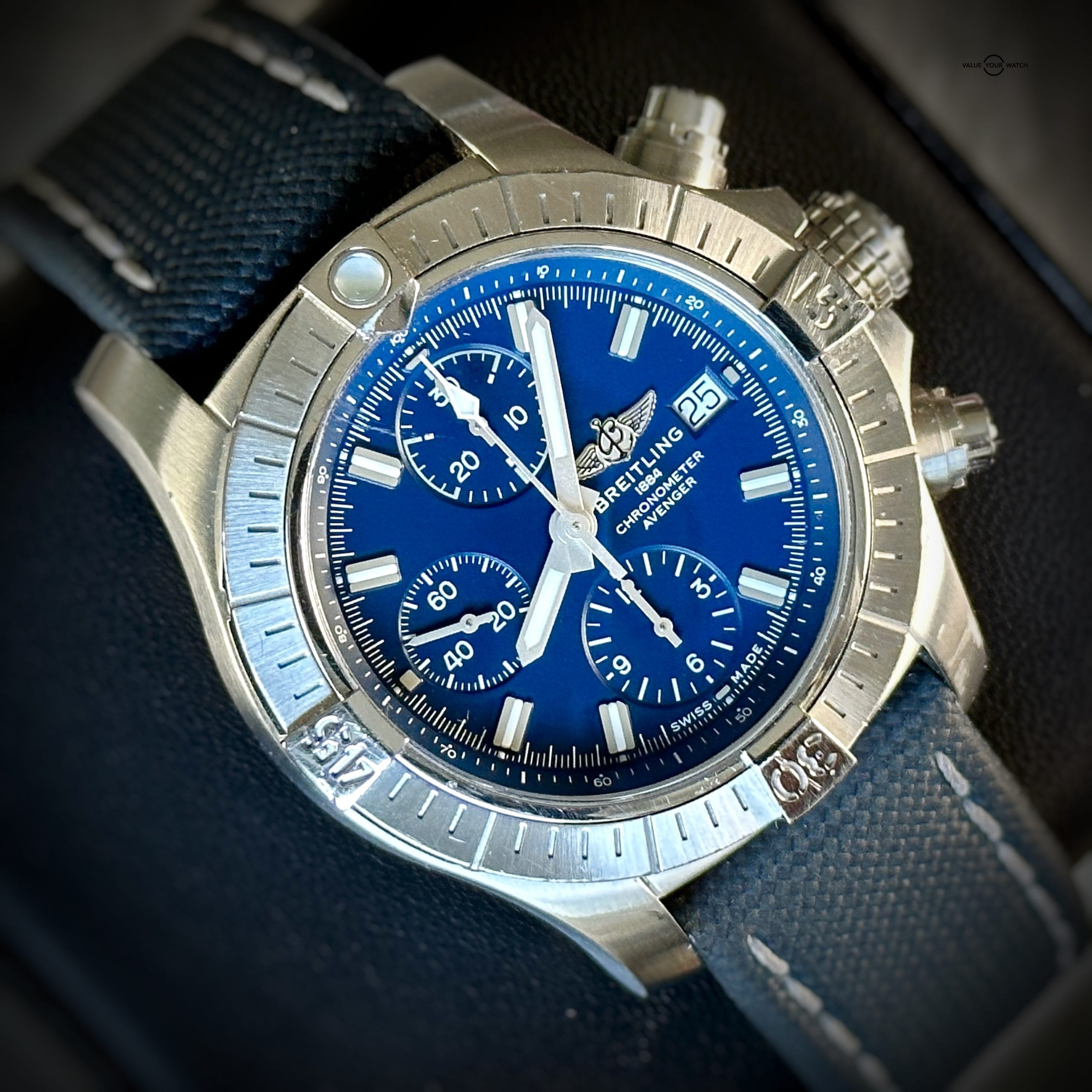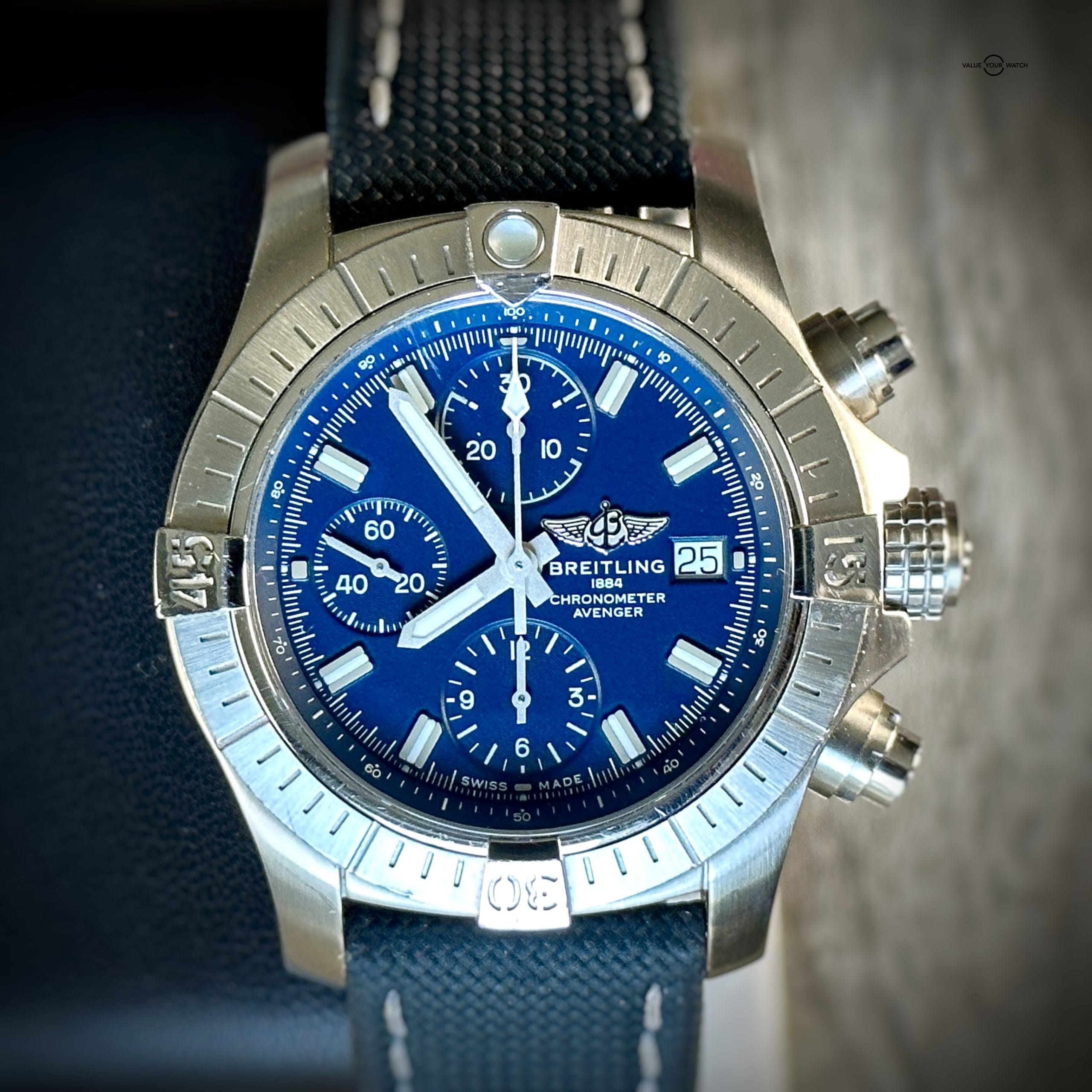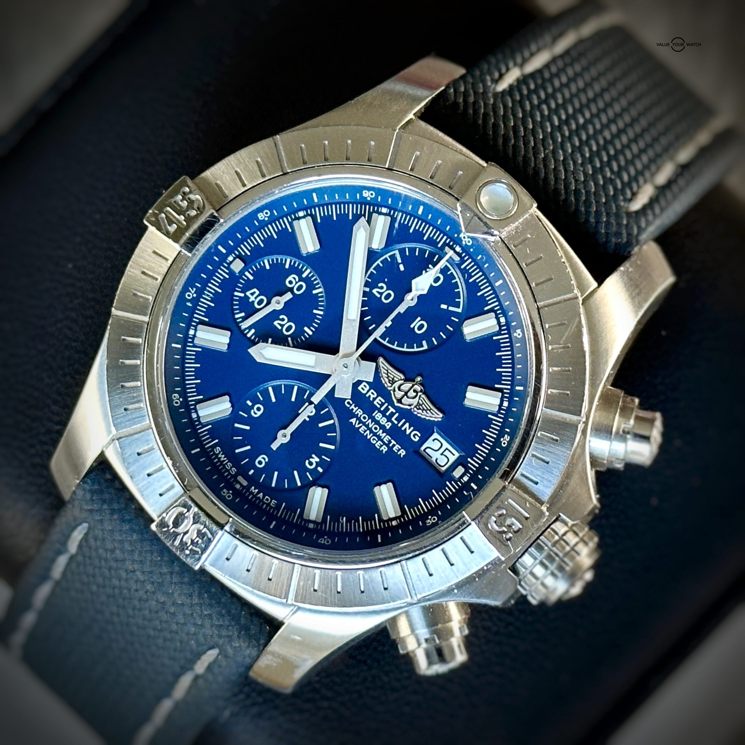 Up for sale: The Breitling Avenger Chronograph is a stunning piece with just the right amount of presence on the wrist. The Avenger embodies the bold and robust luxury Breitling is truly about. The blue dial pops just right in the light. This piece comes on Breitling OEM canvas/leather straps with a folding clasp. The straps are easily adjustable to any wrist size.