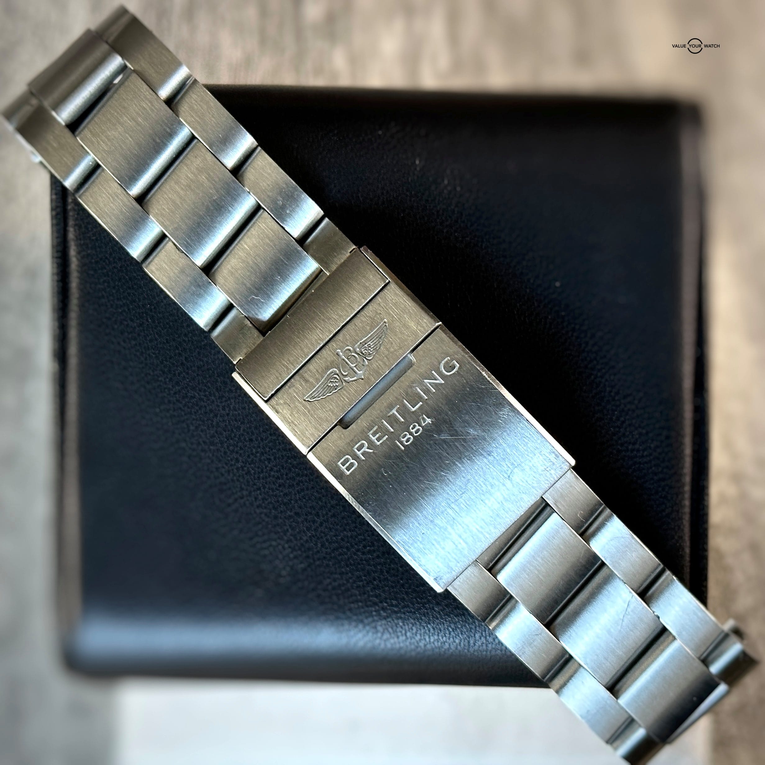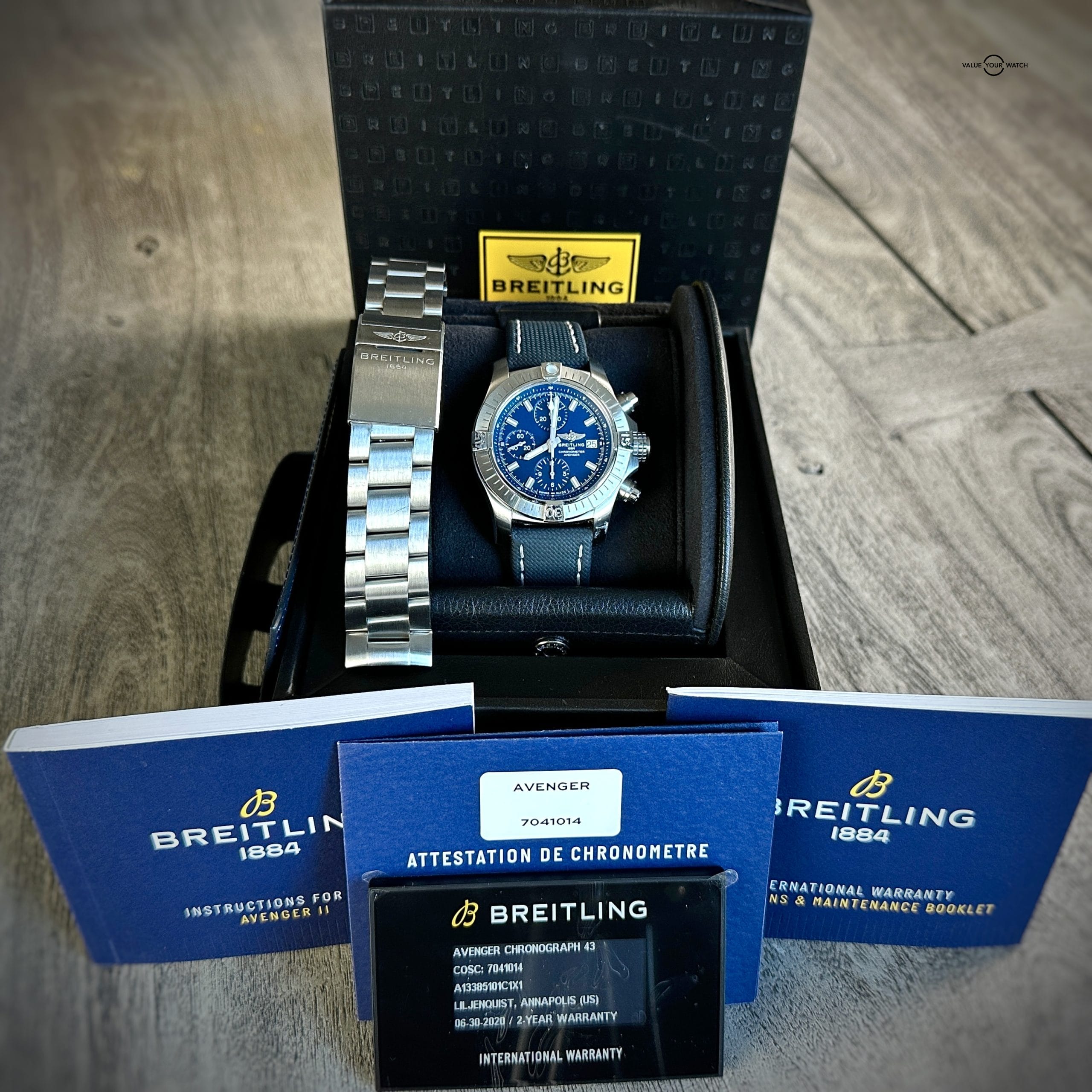 Set includes Breitling outer box/inner box, international warranty booklet, warranty card, attestation de chronometre, additional OEM stainless steel bracelet ($500+ value), and Breitling hang tag.