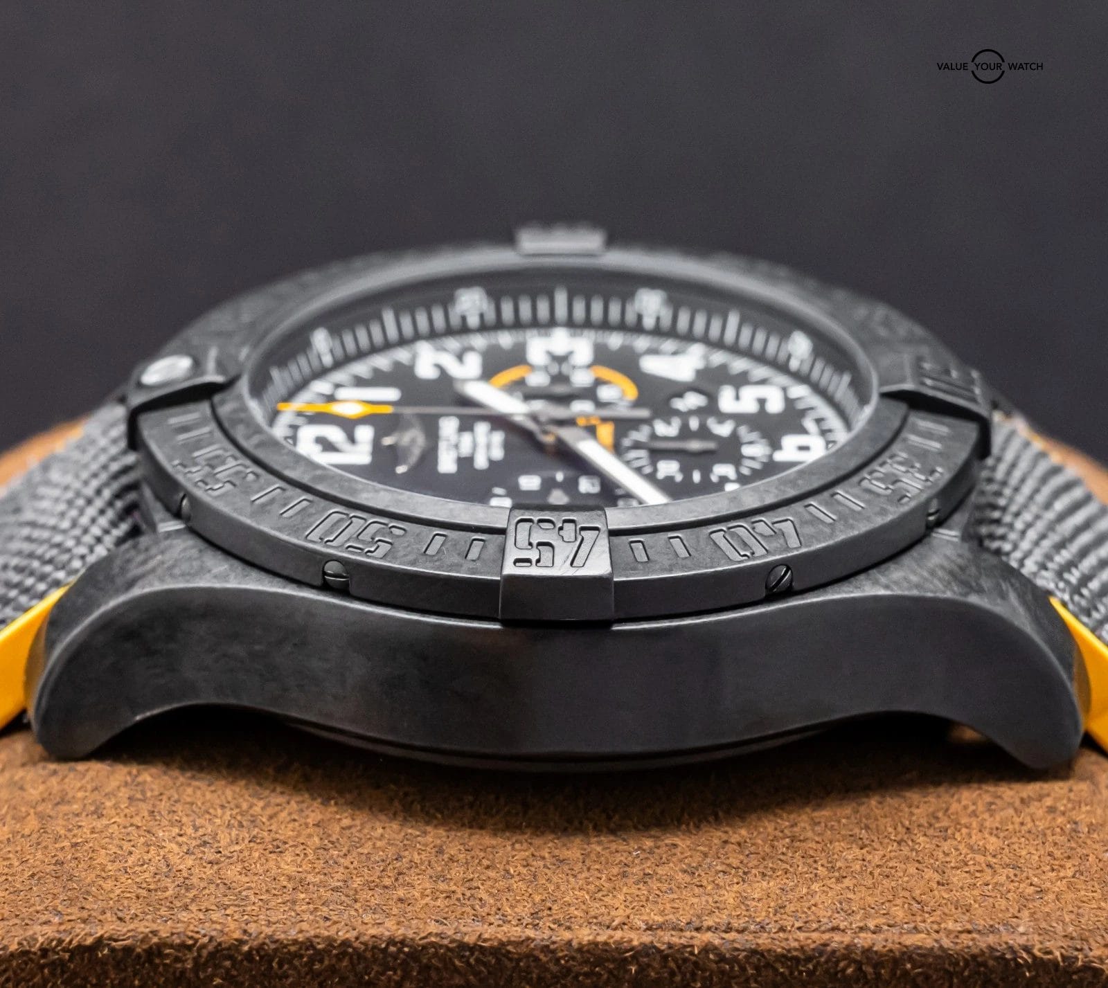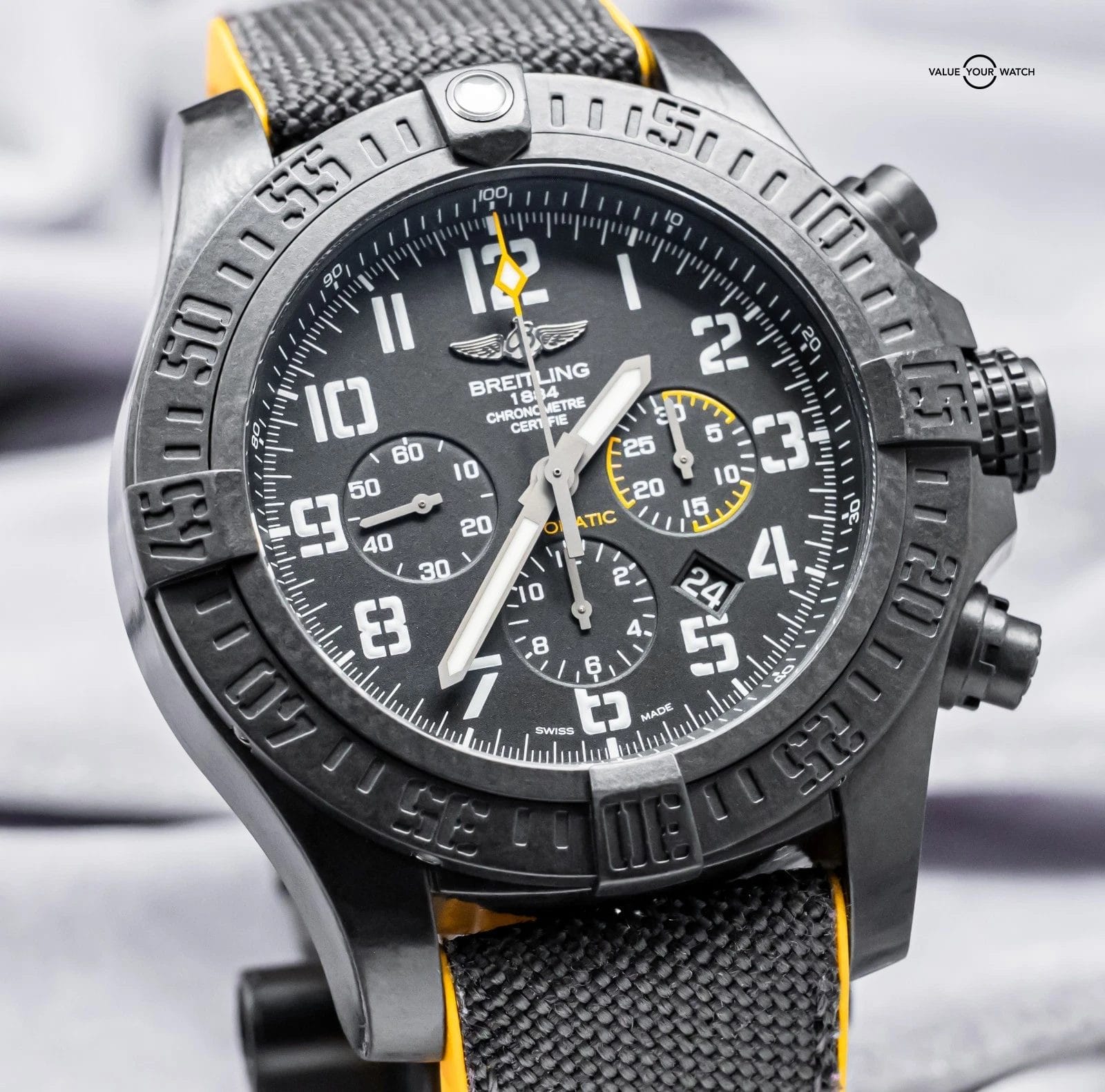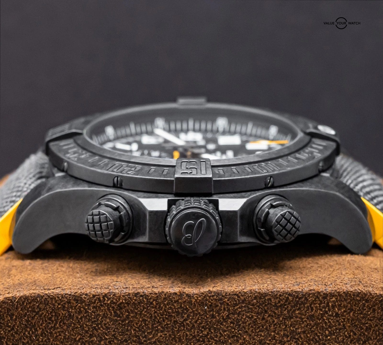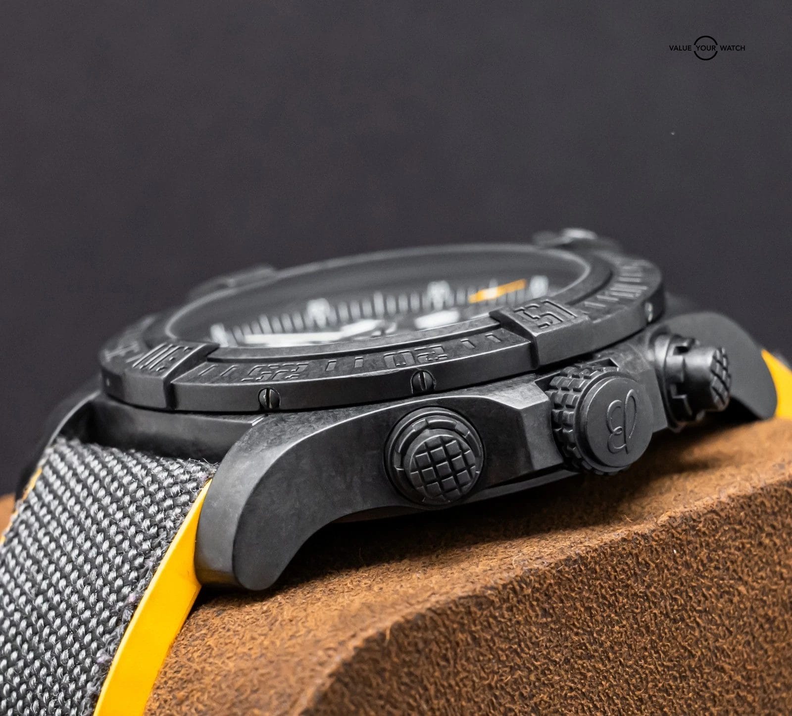 STUNNING Breitling Avenger Hurricane 50 mm in Breitlight with 12H Volcano Black Dial on Breitling Grey Military Canvas & Yellow Rubber Strap! On *DESIRABLE* Breitlight Deploy Clasp that is very desirable as it costs $1,100 to purchase from Breitling alone, making it a much more attractive pickup on the secondary market already on the watch due to the value & comfort. Arrives with original Breitling boxes, manual, and serialized COSC certificate. Great Breitling you can wear everyday and enjoy with the same classiness of the In-House B01 Movement and innovativeness of the Breitlight Case!