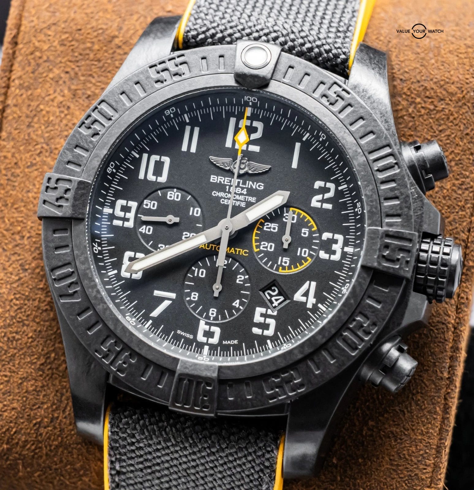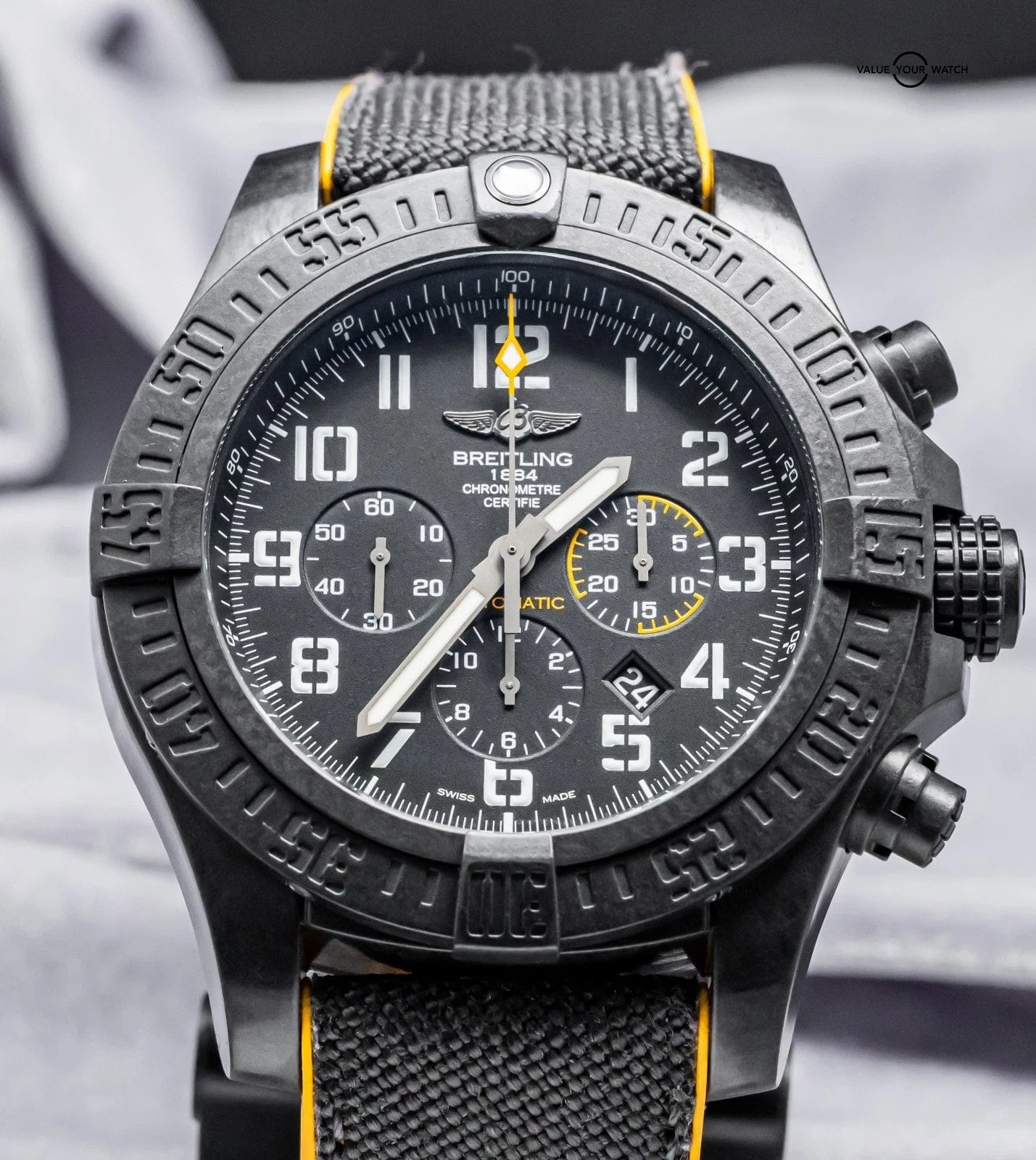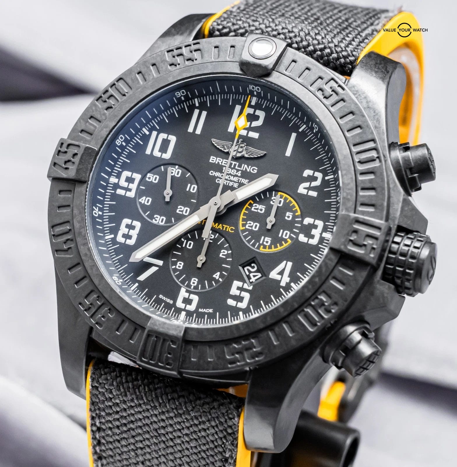 STUNNING Breitling Avenger Hurricane 50 mm in Breitlight with 12H Volcano Black Dial on Breitling Grey Military Canvas & Yellow Rubber Strap! On *DESIRABLE* Breitlight Deploy Clasp that is very desirable as it costs $1,100 to purchase from Breitling alone, making it a much more attractive pickup on the secondary market already on the watch due to the value & comfort. Arrives with original Breitling boxes, manual, and serialized COSC certificate. Great Breitling you can wear everyday and enjoy with the same classiness of the In-House B01 Movement and innovativeness of the Breitlight Case!