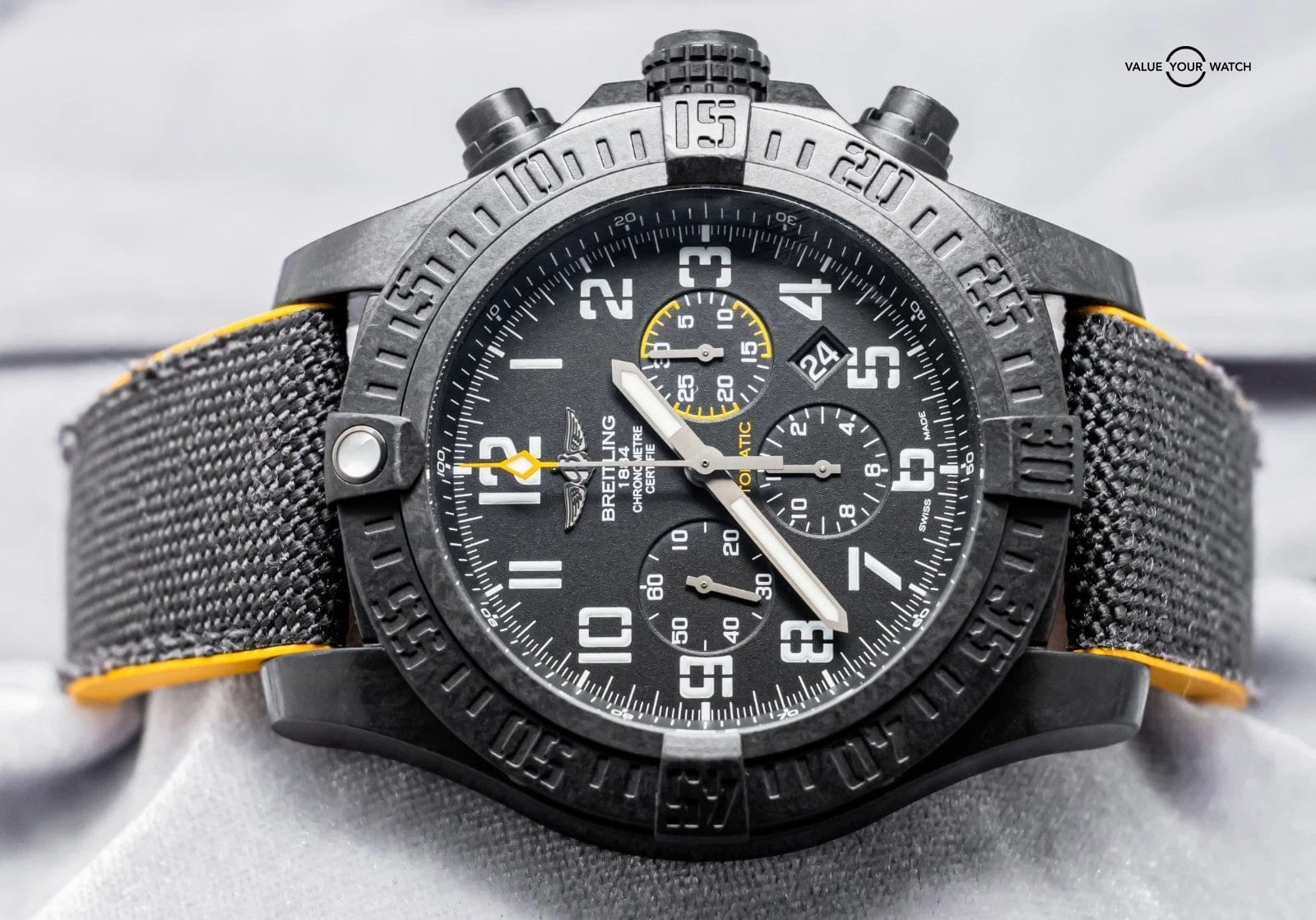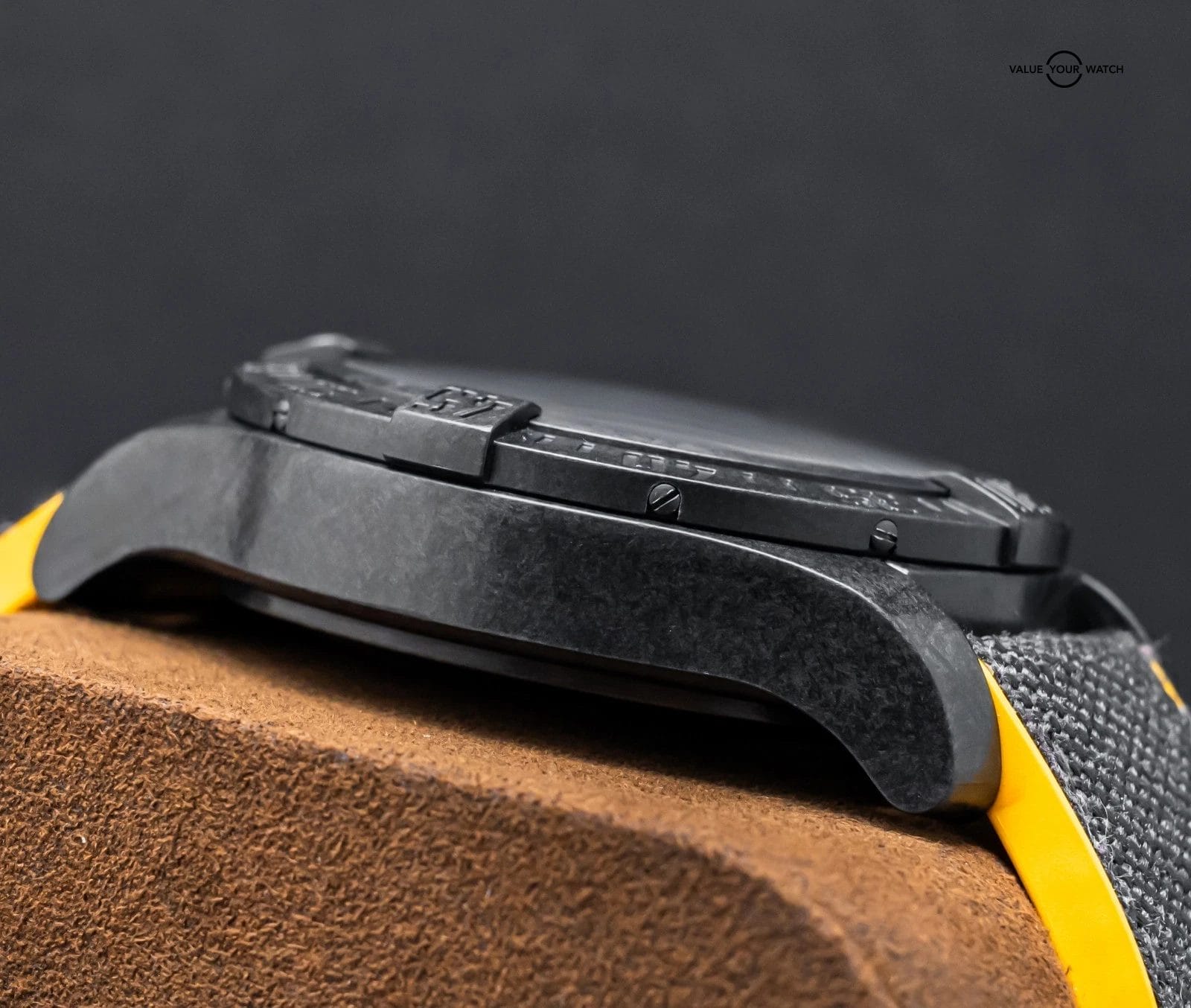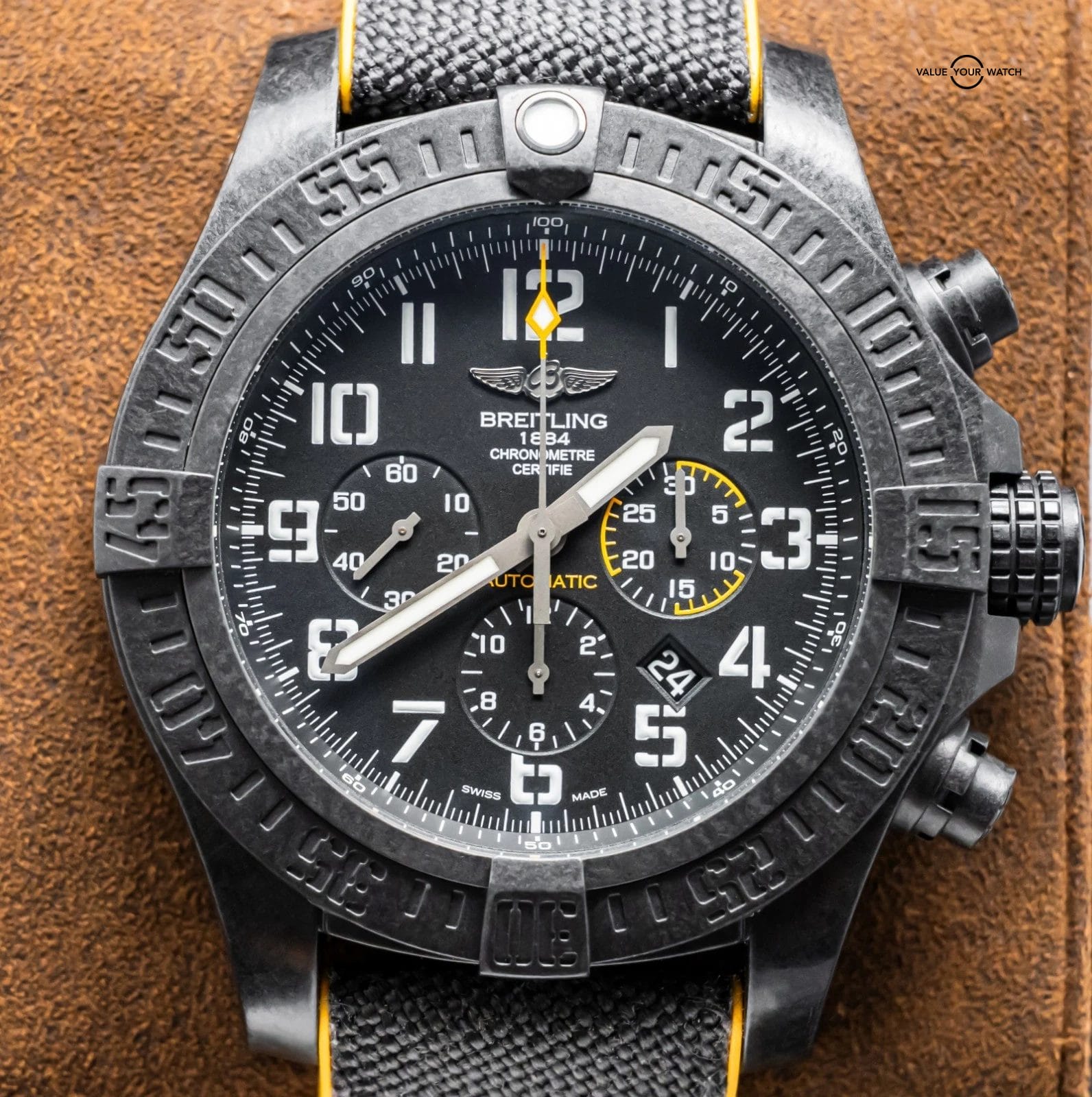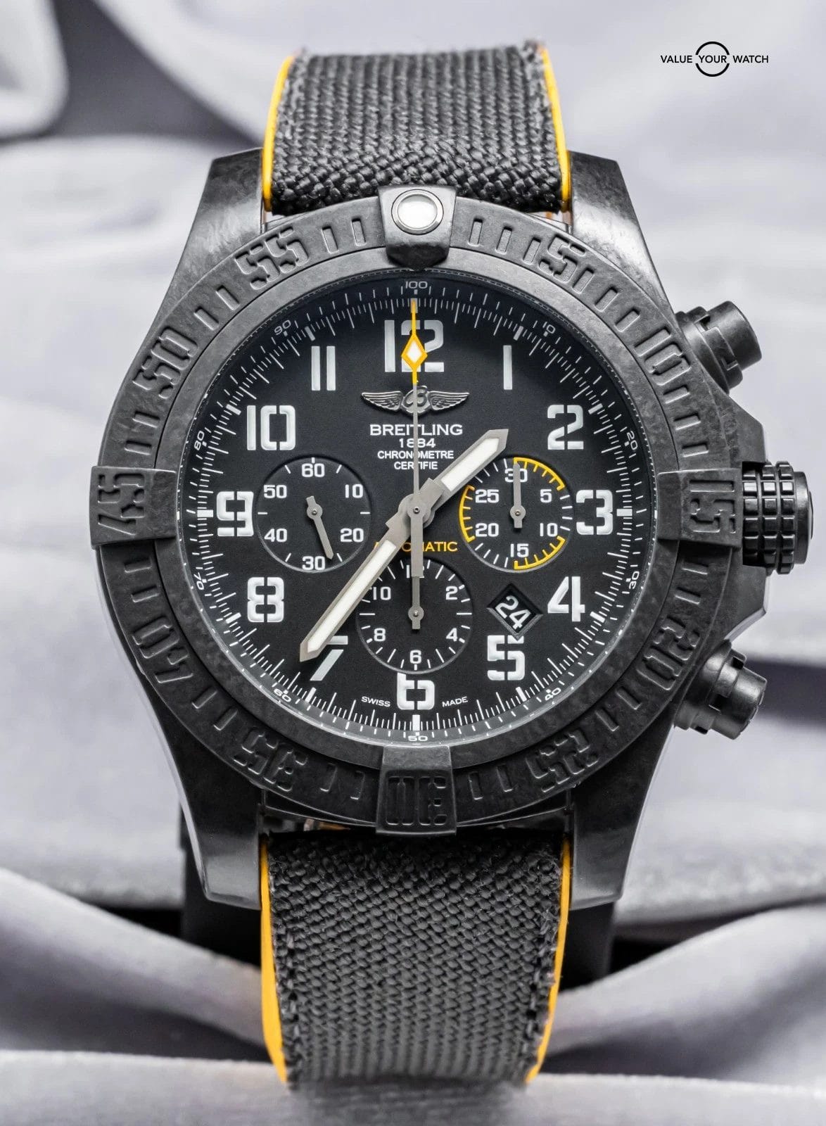 STUNNING Breitling Avenger Hurricane 50 mm in Breitlight with 12H Volcano Black Dial on Breitling Grey Military Canvas & Yellow Rubber Strap! On *DESIRABLE* Breitlight Deploy Clasp that is very desirable as it costs $1,100 to purchase from Breitling alone, making it a much more attractive pickup on the secondary market already on the watch due to the value & comfort. Arrives with original Breitling boxes, manual, and serialized COSC certificate. Great Breitling you can wear everyday and enjoy with the same classiness of the In-House B01 Movement and innovativeness of the Breitlight Case!