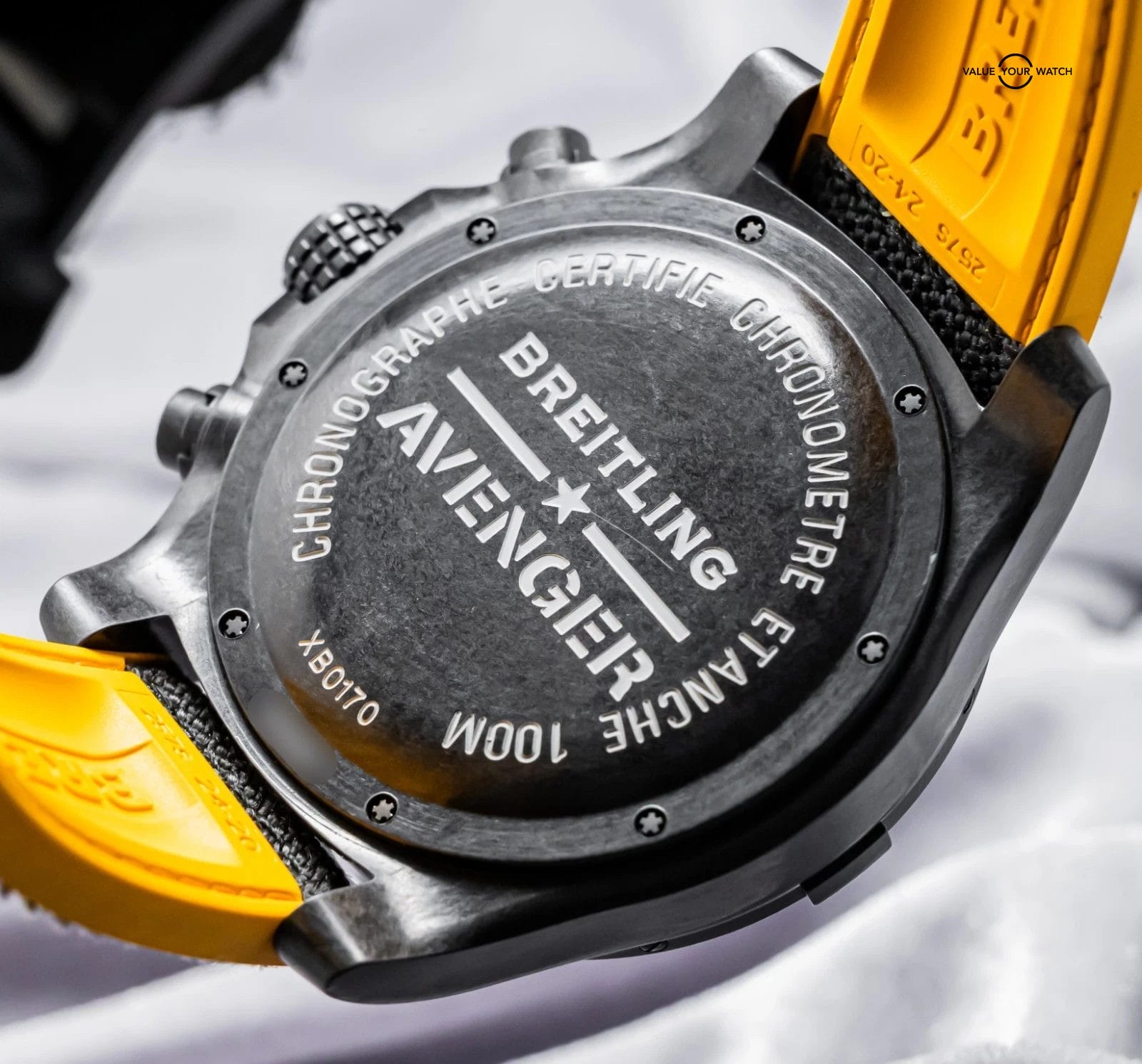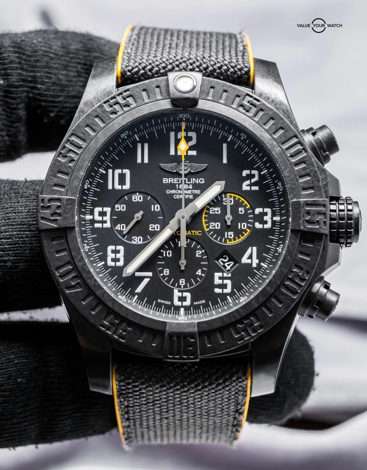 “A standout 50 mm diameter, an ultra-rugged, ultra-light case in Breitlight®, Manufacture Breitling Caliber 01: the Avenger Hurricane 12H resolutely targets performance. The technical and powerful black dial is distinguished by its aviation-inspired white stencil-type. The pushpieces and crown are fitted with a non-slip grip ensuring optimal handling, even with gloves. Avenger Hurricane: beyond superlatives.”