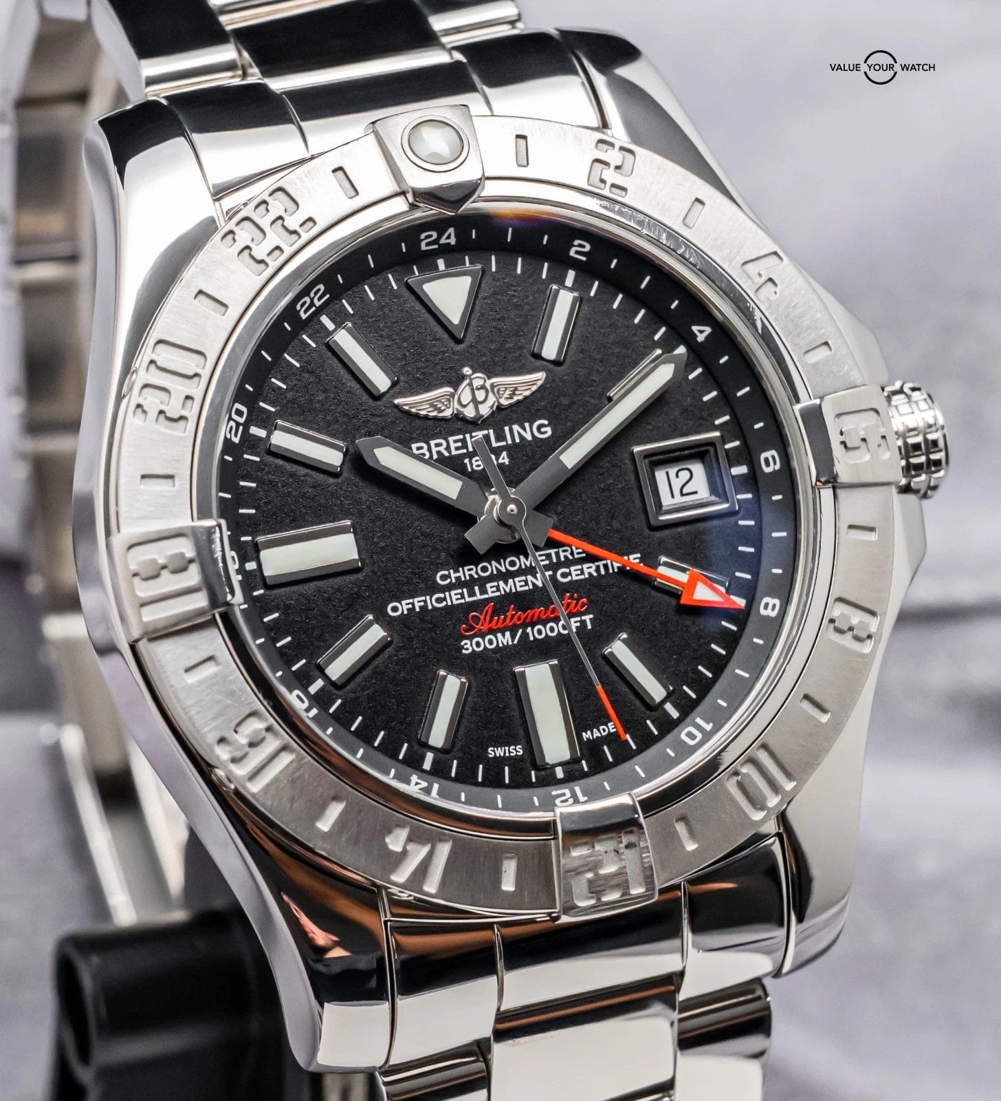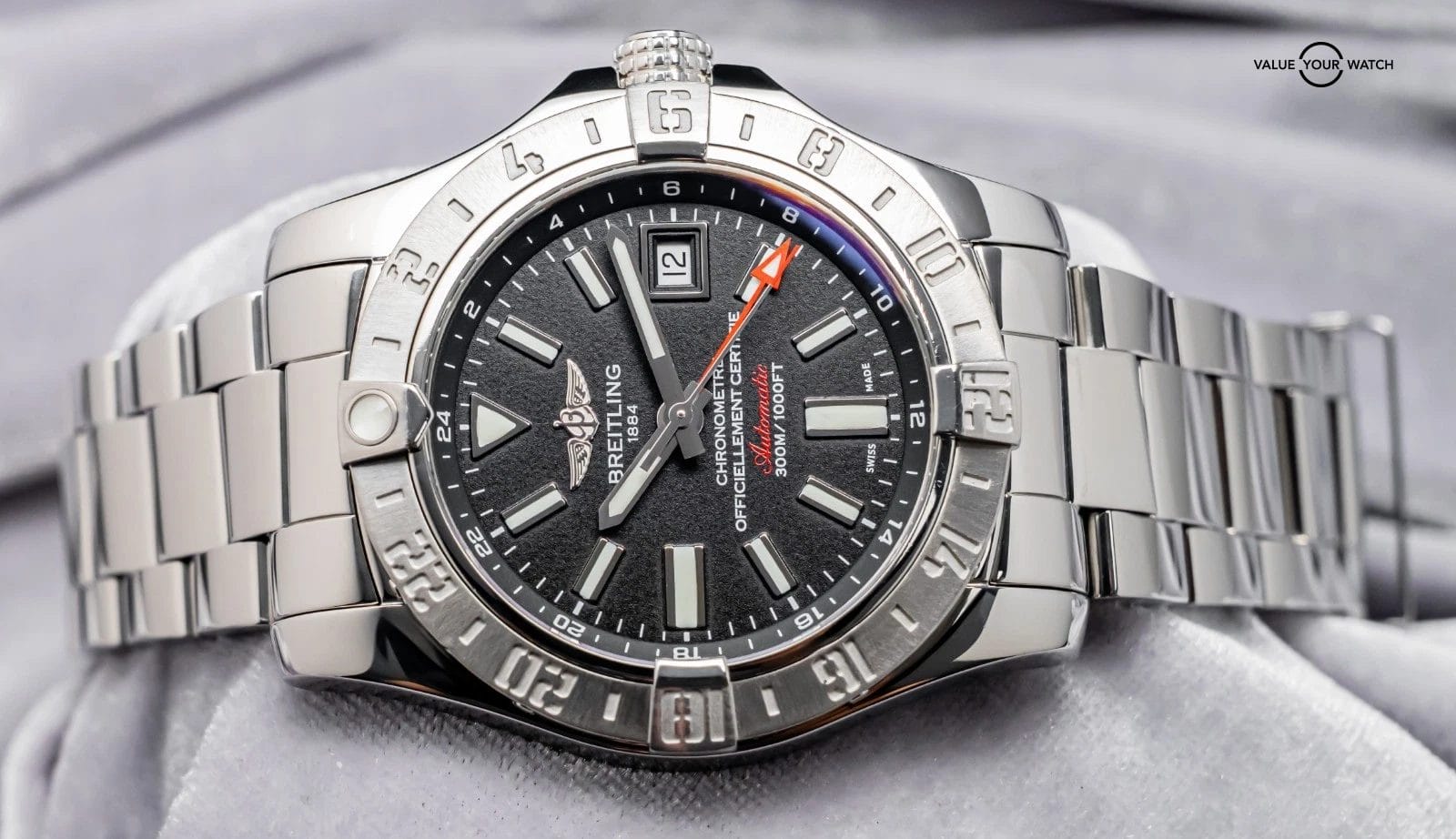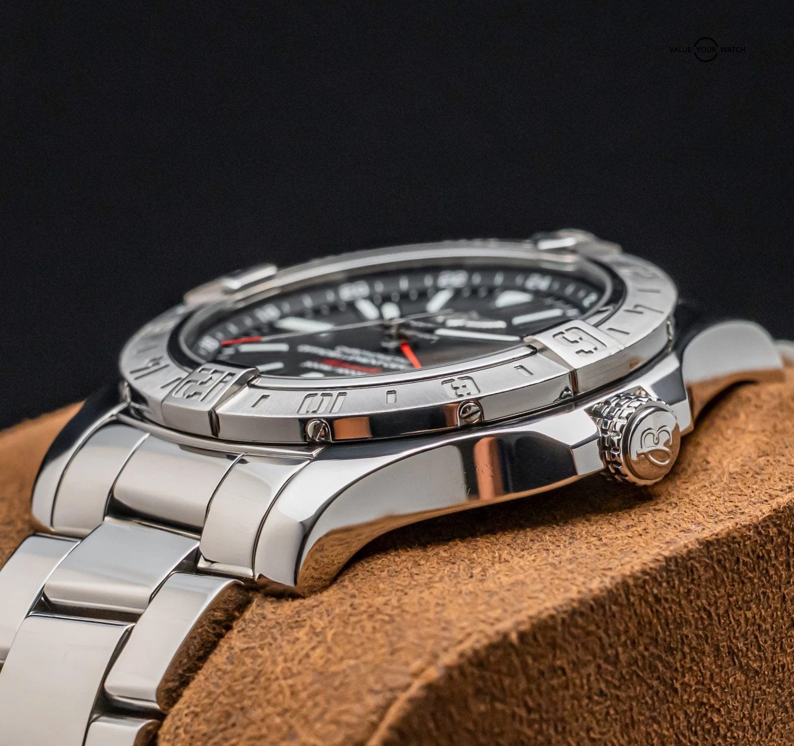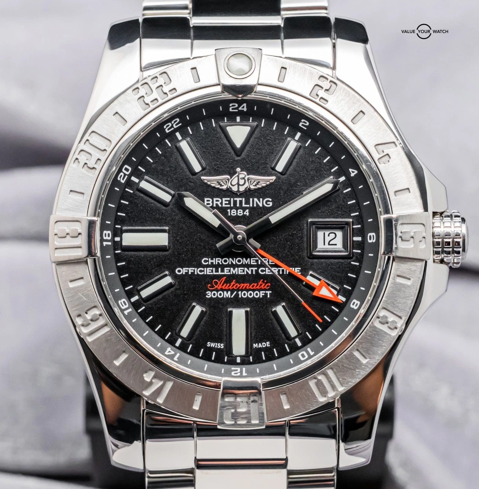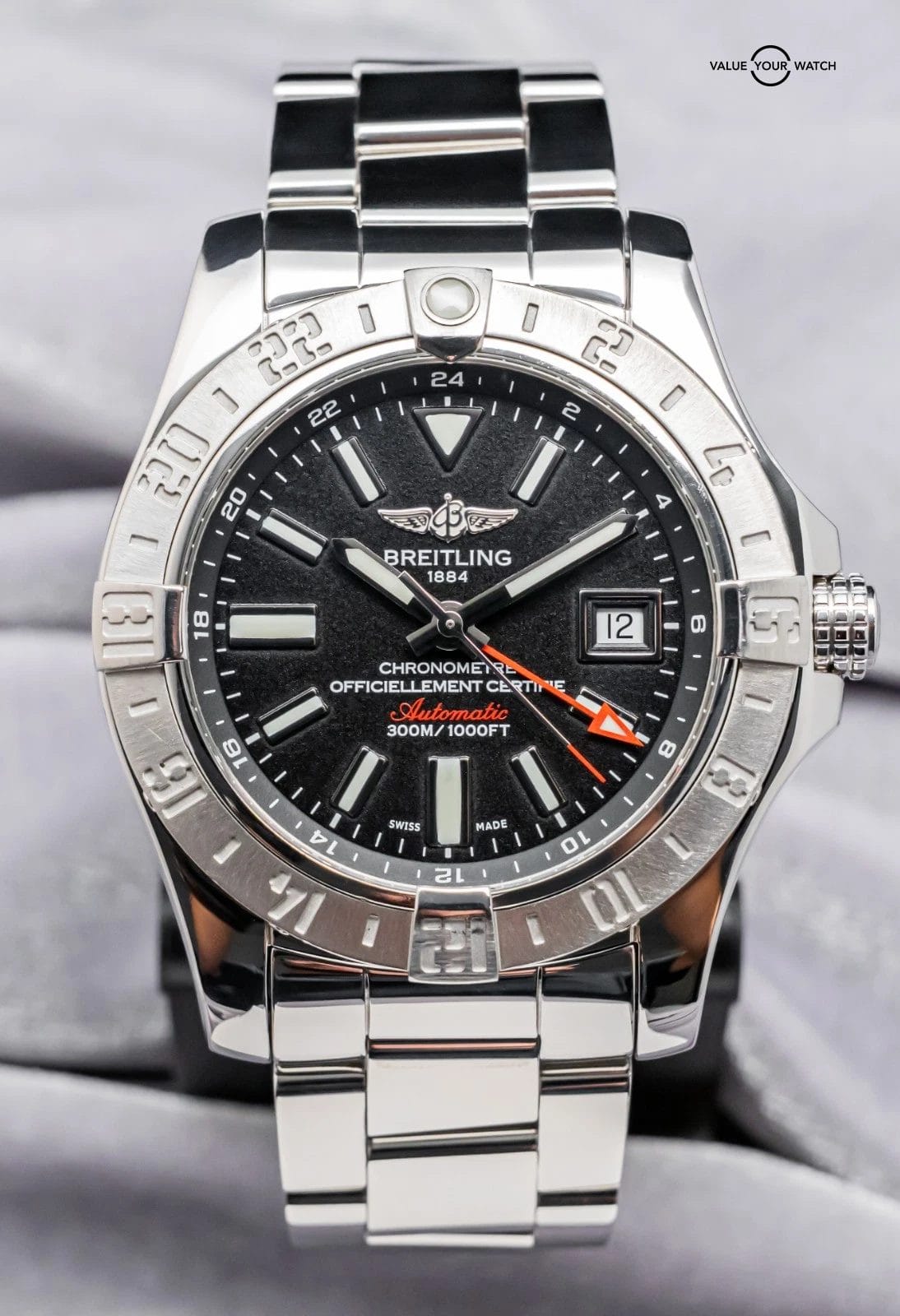 STUNNING Breitling Avenger II GMT 43 mm with Volcano Black Dial on Polished Stainless Steel Professional III Breitling Bracelet! Arrives as watch only and is a fantastic value on the secondary market. Super clean look and a very versatile all around piece, tons of bang for your buck with the Avenger II GMT!