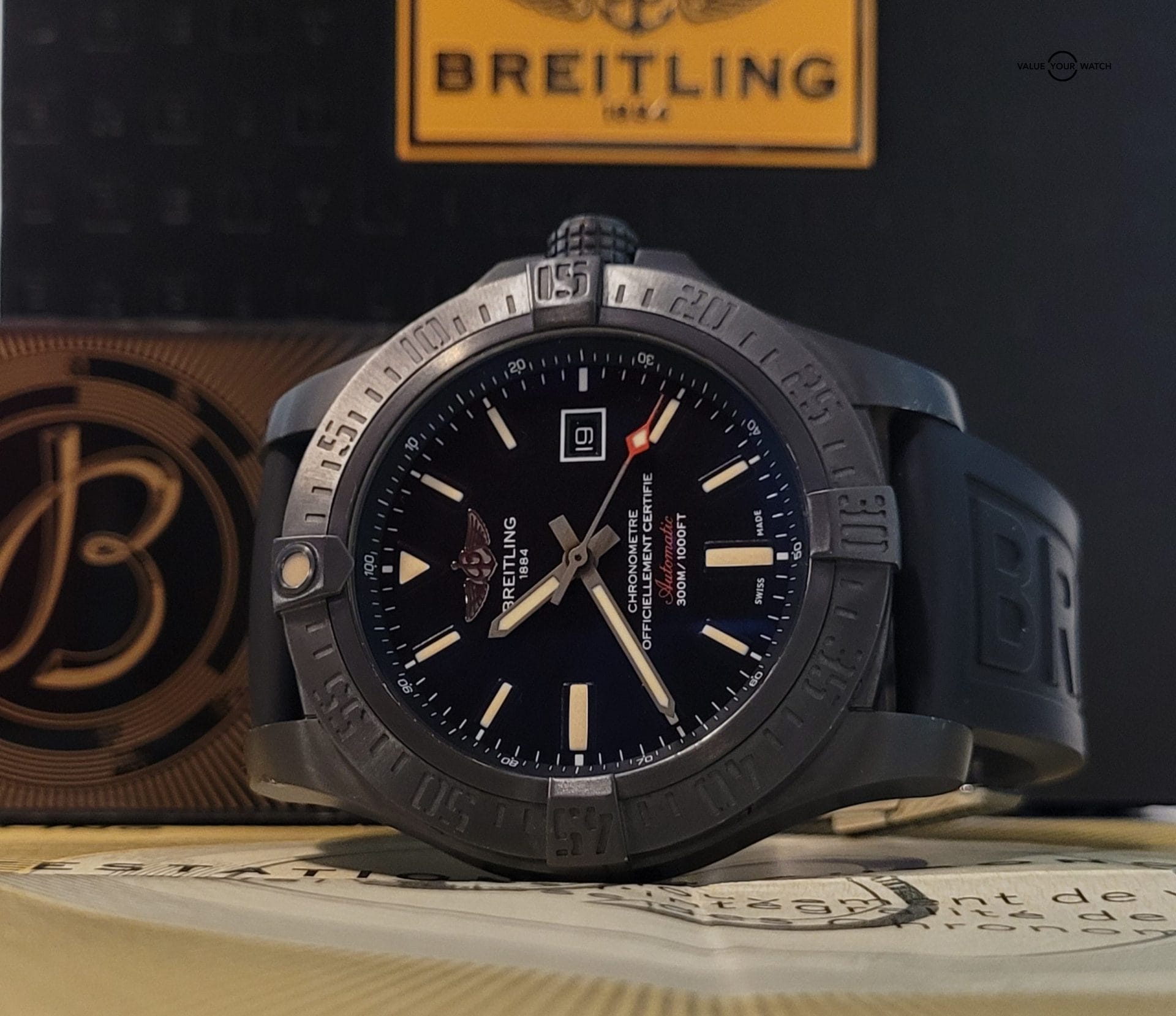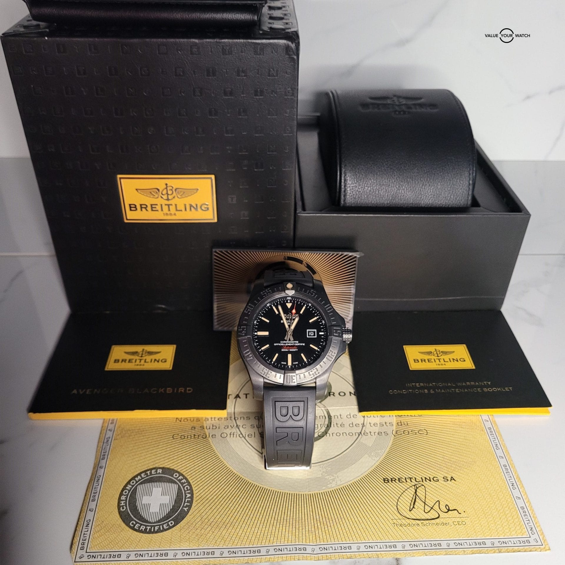 Breitling Avenger Blackbird V1731010/BD12 men’s watch is a Special edition. Features a brushed black titanium case and black Diver Pro III rubber strap. Brushed black unidirectional rotating titanium bezel with 60-minute scale. Volcano black dial with luminescent hands and index hour markers. Date displayed in dial aperture at 3 o’clock. Powered by the Breitling Caliber 17 self-winding automatic COSC Chronometer certified movement which boasts a 38-hour power reserve, beats at 28,800 vph and contains 25 jewels. A cambered, scratch resistant sapphire crystal that is glare proofed on both sides protects the dial. The case is round, 48mm in diameter, weighs 99.10g and is 14.20mm thick. Inlet size: 24mm. Screw-locked crown with 2 gaskets. Screw down case back. Stainless steel deployment buckle. Water resistant to 300 meters / 1000 feet. Functions: hours, minutes, seconds, date. Swiss Made Sport watch