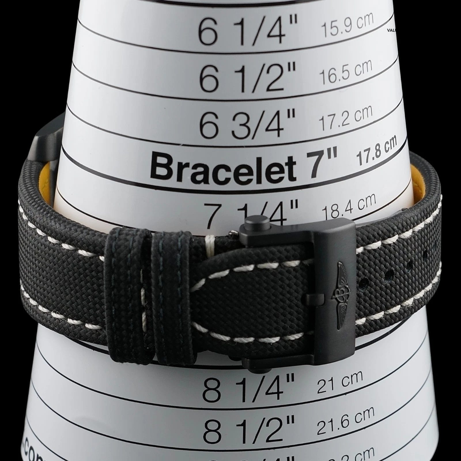 - Comes with three straps: yellow leather canvas hybrid, blue canvas, and blue Breitling rubber.