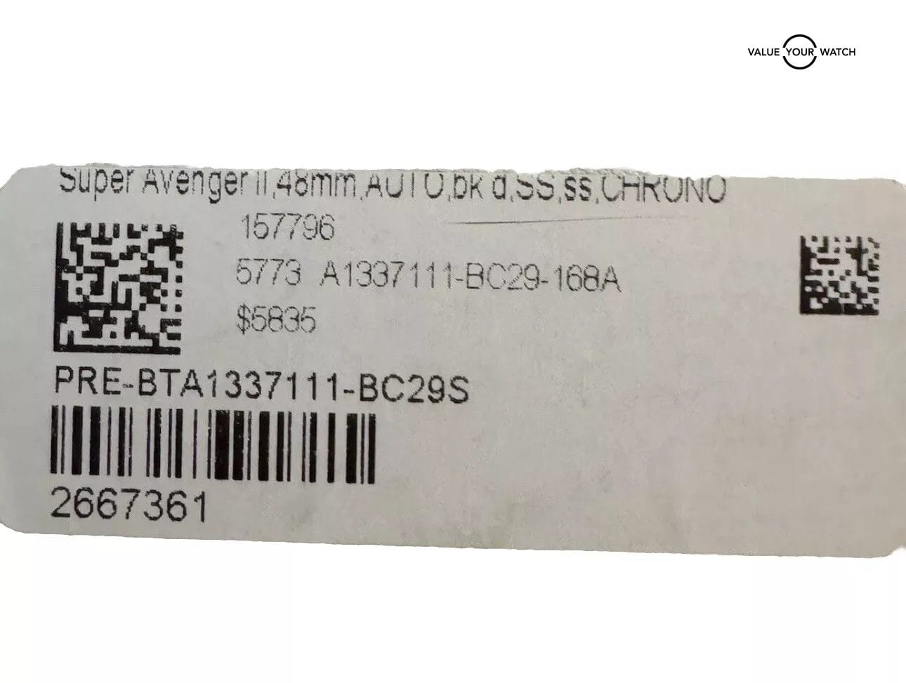 This Breitling Avenger II wristwatch is a stunning piece for any man’s collection. The black dial and 48mm case size make it a sleek and modern choice. The watch is mechanical (automatic) and features a bracelet strap. It is not customized and does not come with papers or service records.
