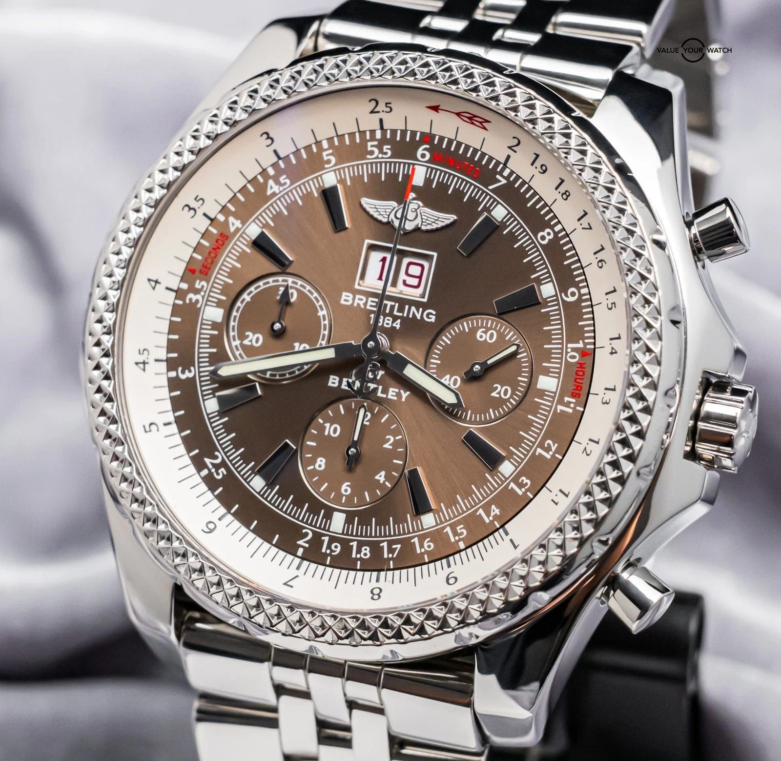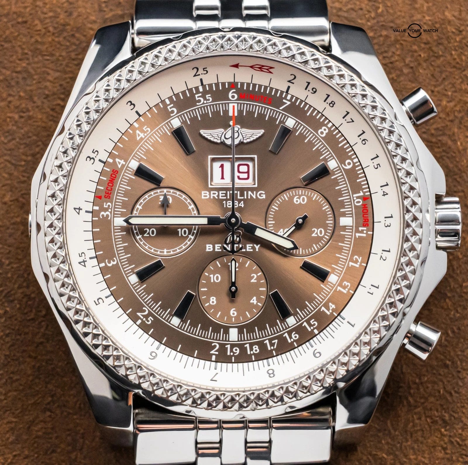 STRIKING Breitling Bentley 6.75 in Stainless Steel 49 mm with Brown Dial on Stainless Steel Breitling Bentley Bracelet! Comes with original Breitling boxes and was SERVICED at Breitling in February 2026 for $1,236.46. Have peace of mind, this piece is WARRANTIED through Breitling until February 2027, a huge value-add!