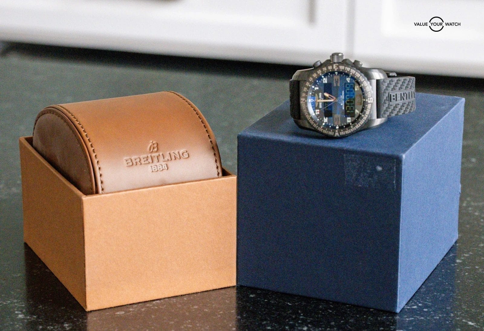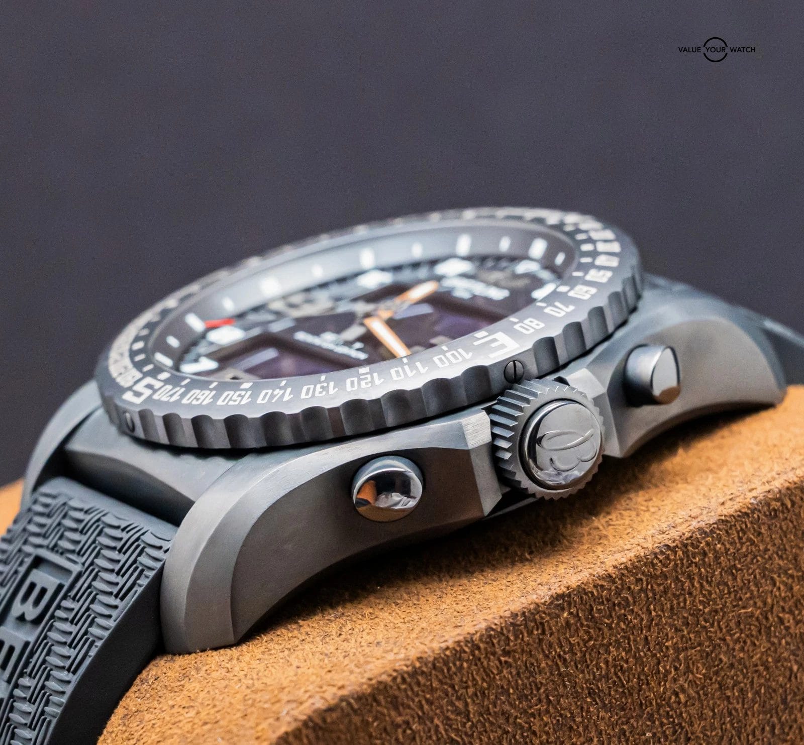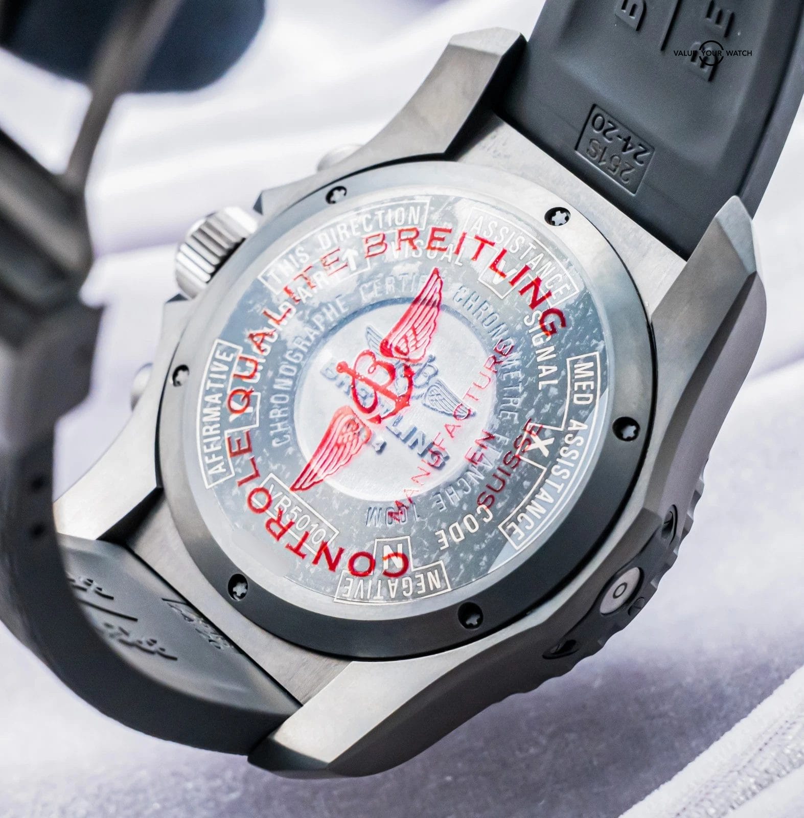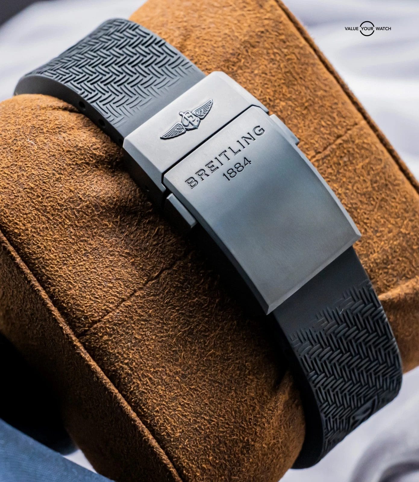Do not hesitate to contact me with any questions. I sell over 800 watches per year, have fantastic reviews online, and thousands of references; I seek a very simple and pleasant buying experience for my clients through fostering relationships in the watch community. The serials have been blurred for privacy. The rubber strap can accommodate a 7.4 inch wrist at maximum as all Breitling rubber straps are cut to fit when new. In the event you have a larger wrist, Breitling does sell other Breitling rubber straps on their website for $85.
