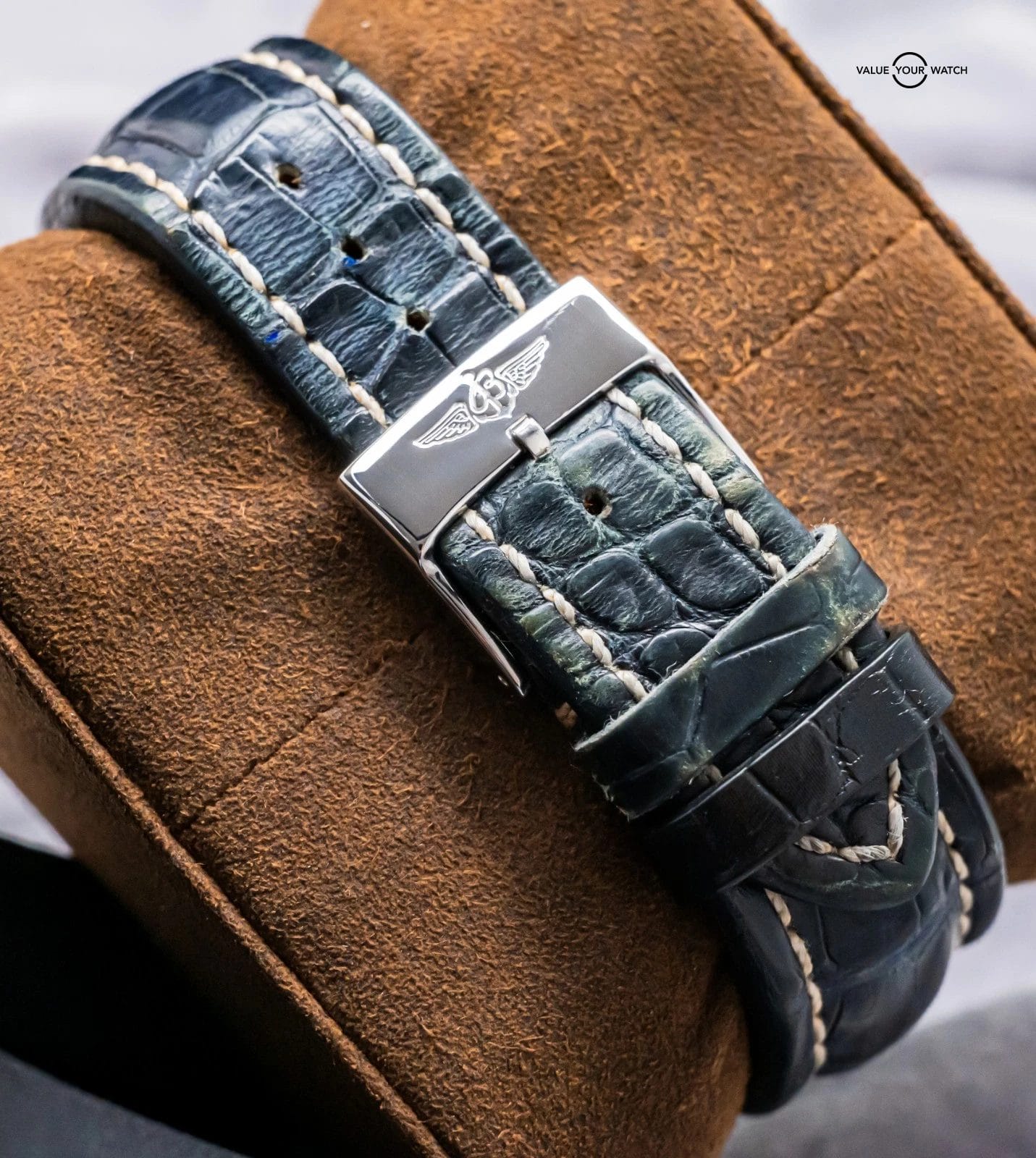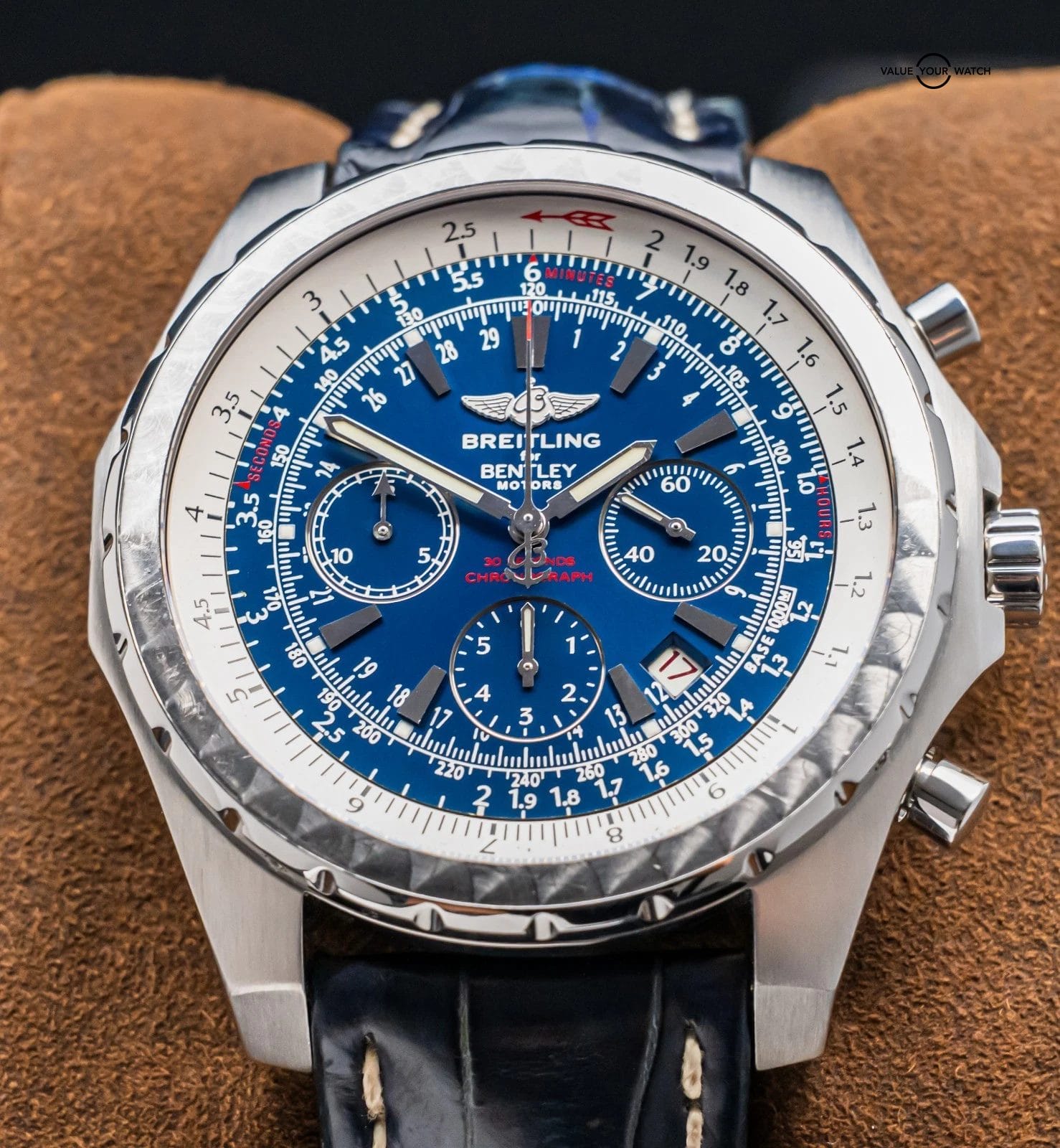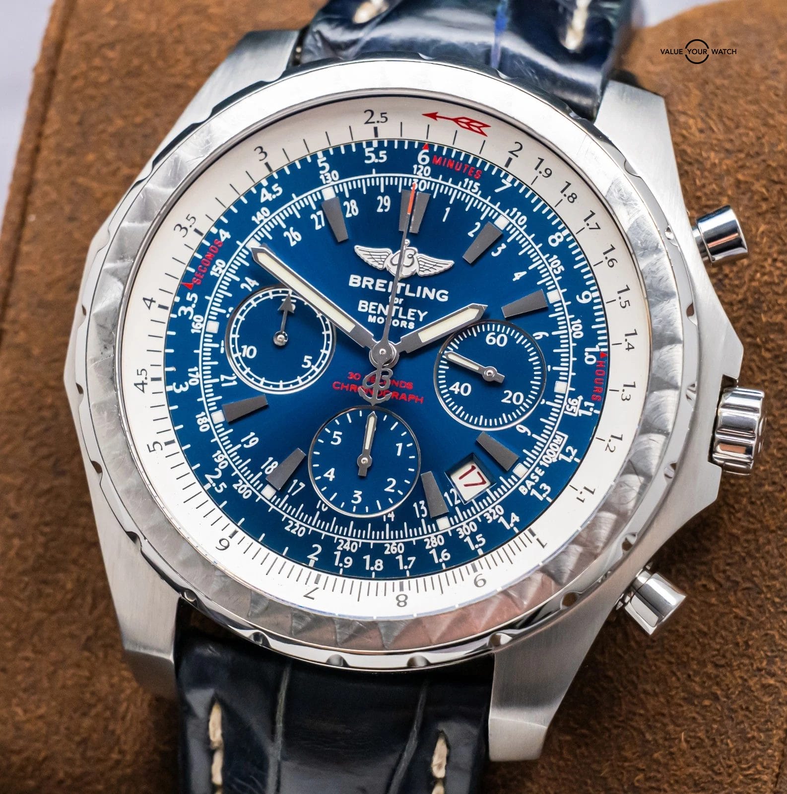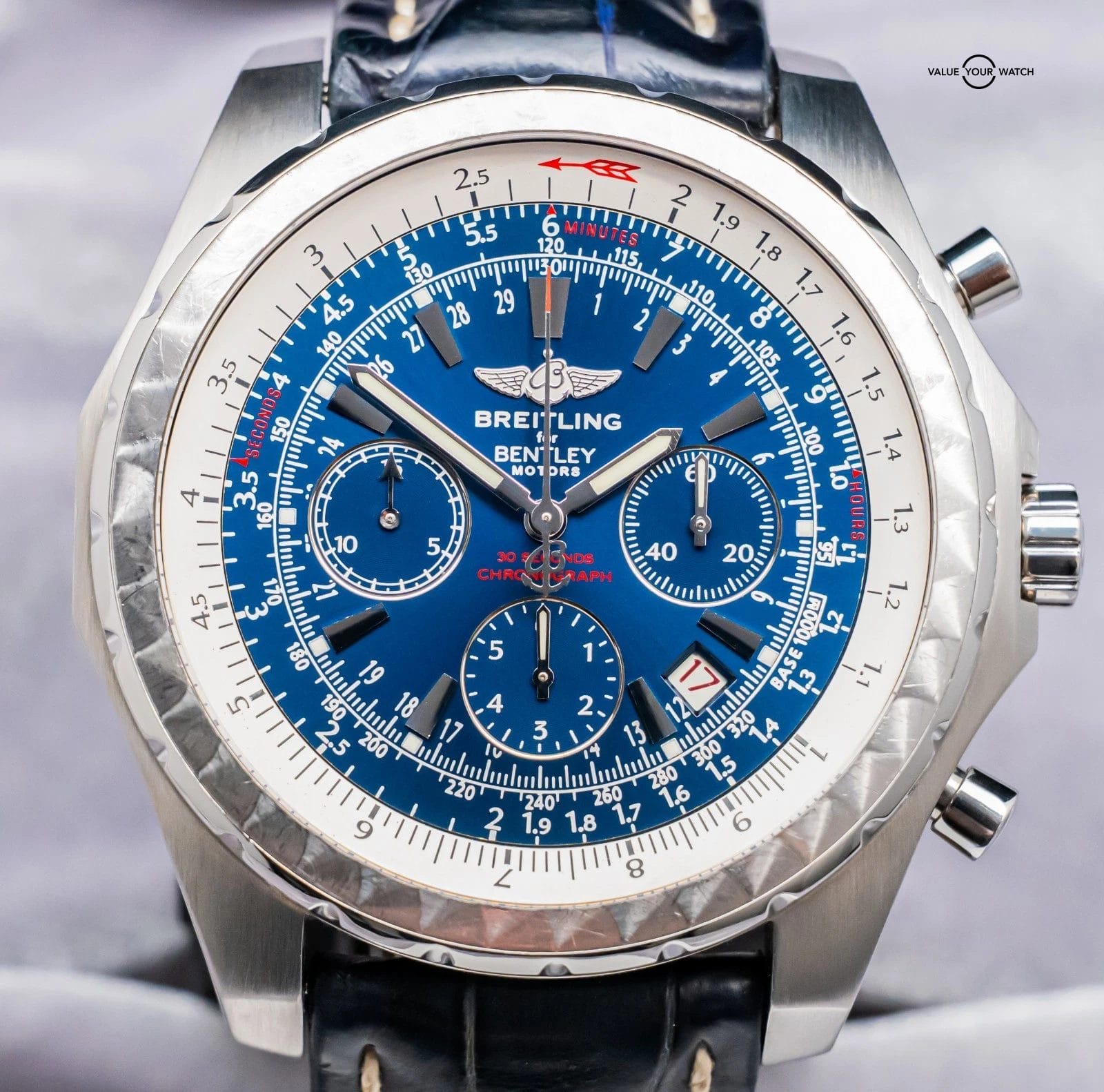 STRIKING Breitling Bentley Motors T 49 mm in Stainless Steel with the *RARE* Blue Dial on Blue Breitling Croco! Arrives with original modern Breitling box and was FULLY SERVICED at my watchmaker in January 2026, a huge value-add. The Chronograph is a 30-Second Chronograph function, incredibly rare to find in the world of fine timepieces. Whether you’re simply looking for a unique piece, love blue watches, or you love this piece’s ties to Bentley, this is the watch you’ve been looking for- a phenomenal conversation piece. Super stunning piece and not an easy find with the Blue Dial!