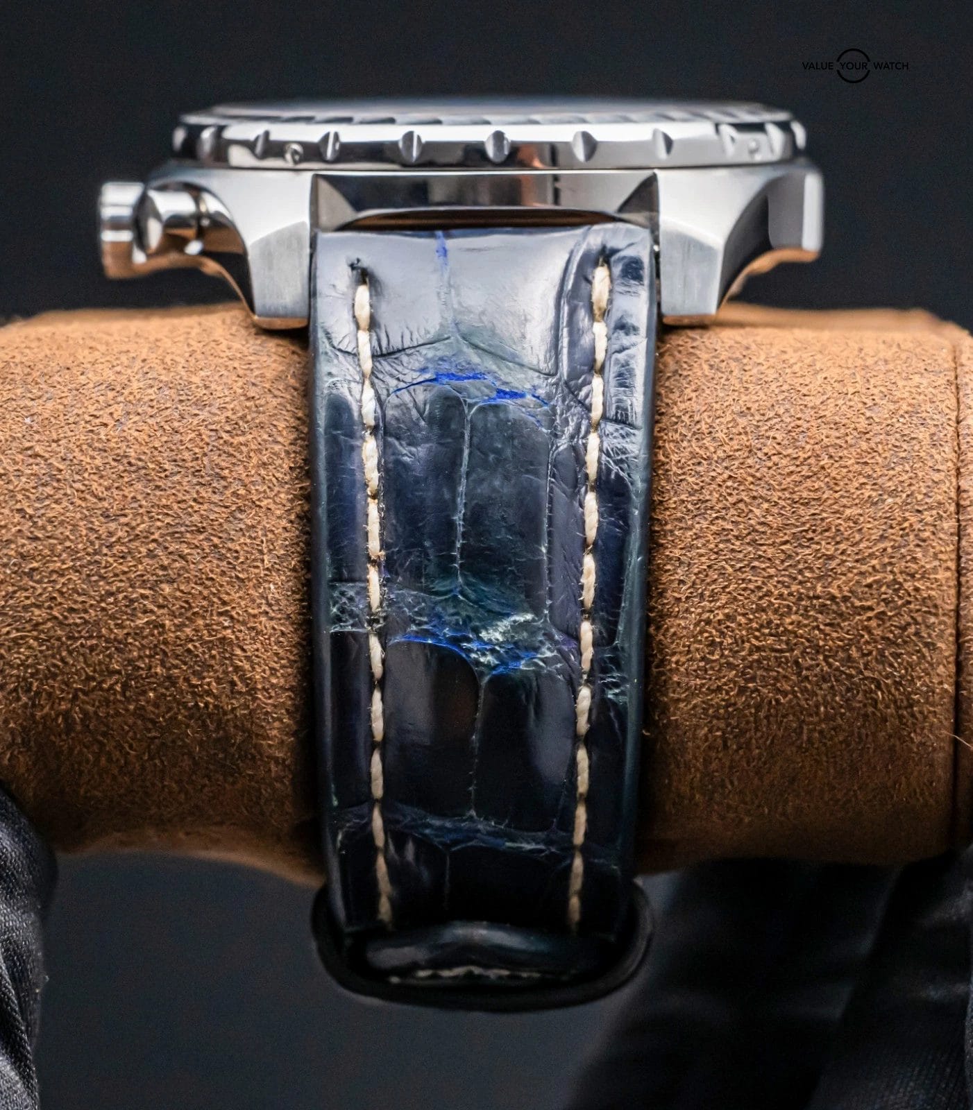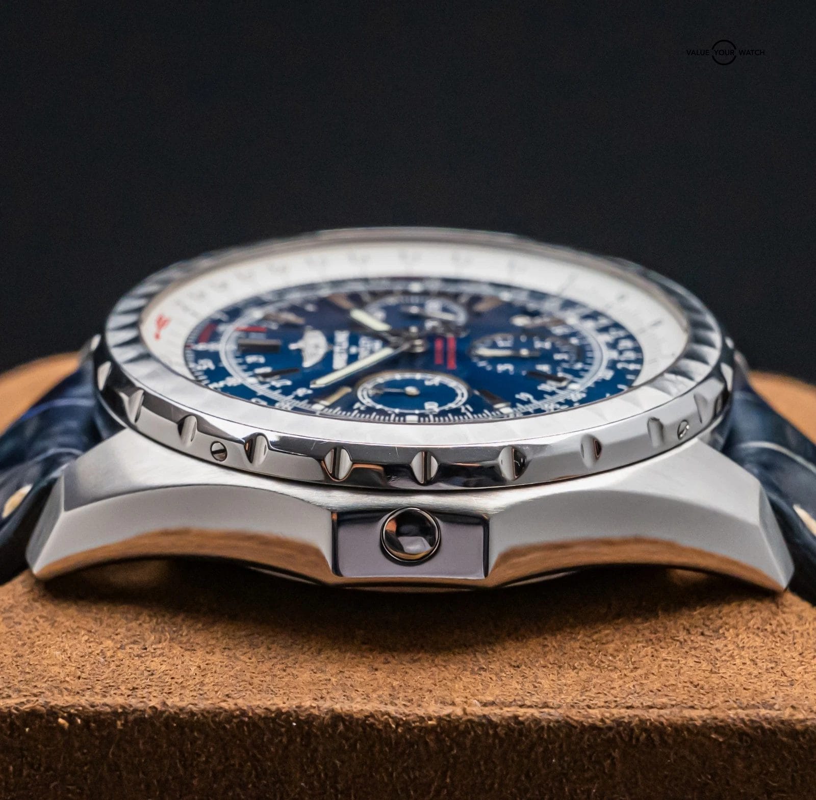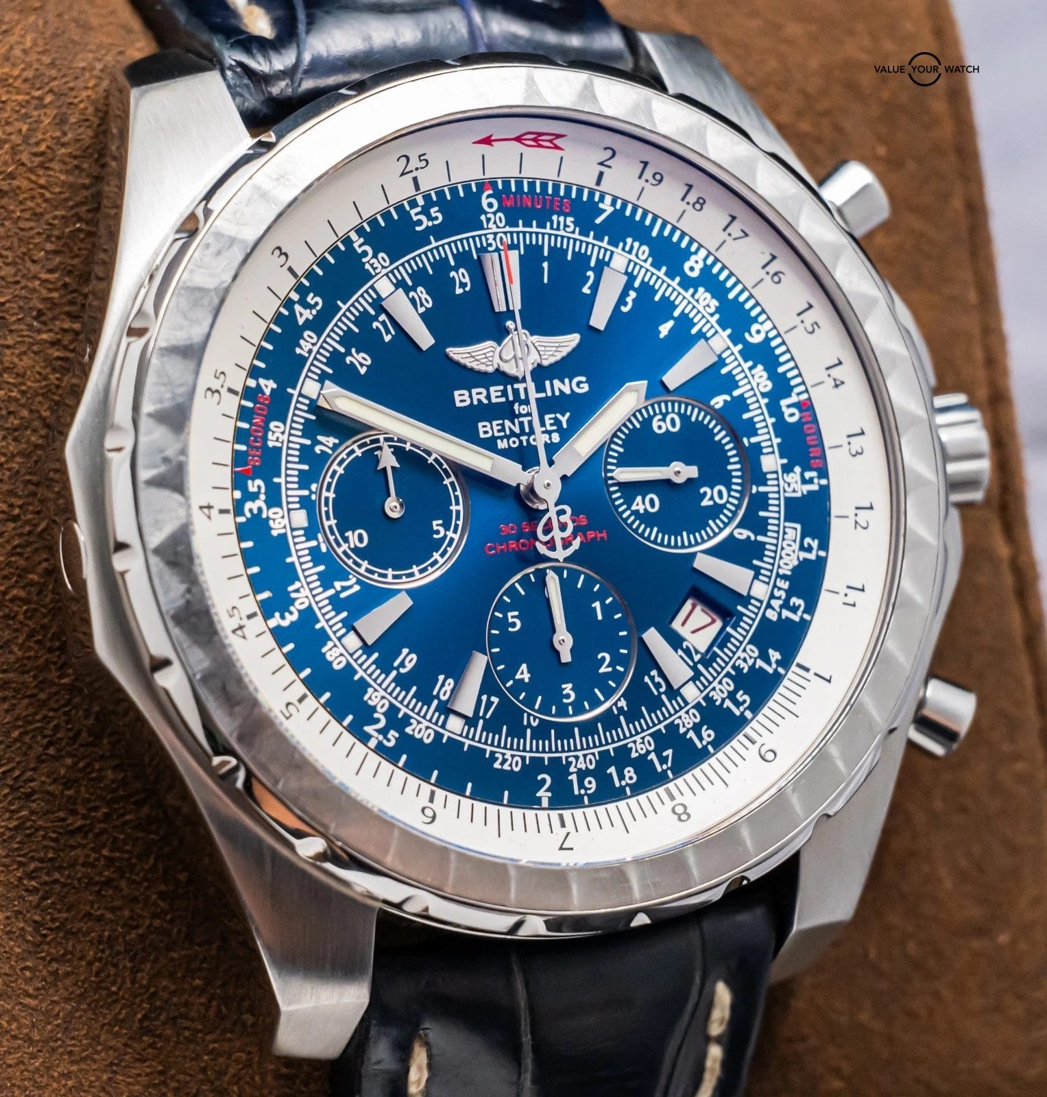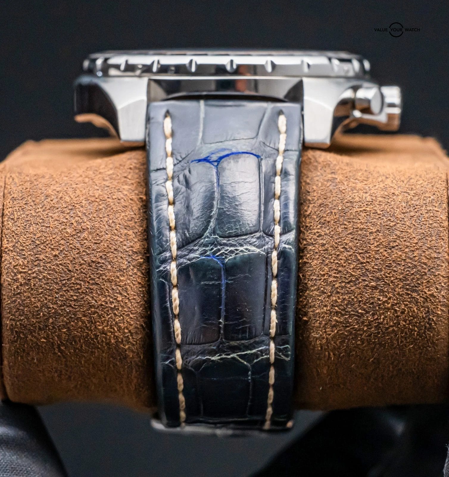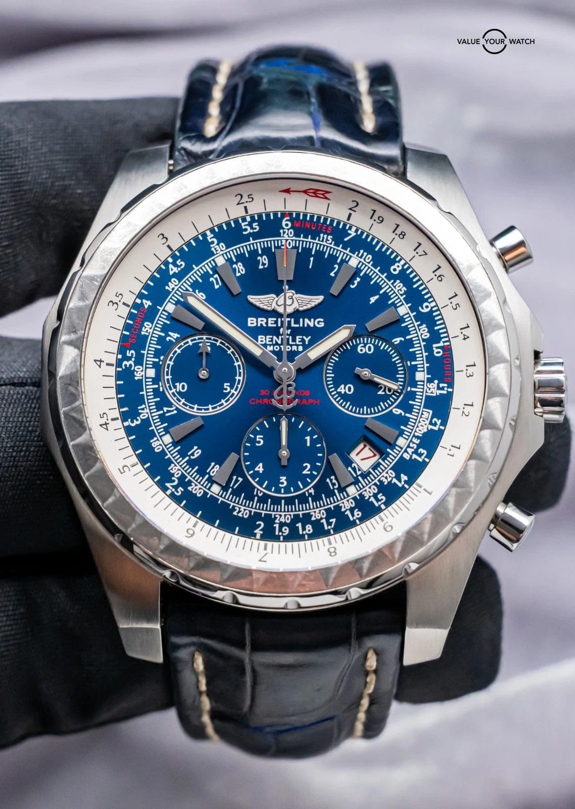 STRIKING Breitling Bentley Motors T 49 mm in Stainless Steel with the *RARE* Blue Dial on Blue Breitling Croco! Arrives with original modern Breitling box and was FULLY SERVICED at my watchmaker in January 2026, a huge value-add. The Chronograph is a 30-Second Chronograph function, incredibly rare to find in the world of fine timepieces. Whether you’re simply looking for a unique piece, love blue watches, or you love this piece’s ties to Bentley, this is the watch you’ve been looking for- a phenomenal conversation piece. Super stunning piece and not an easy find with the Blue Dial!