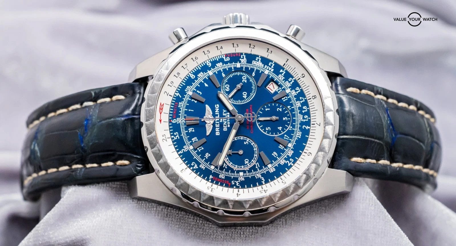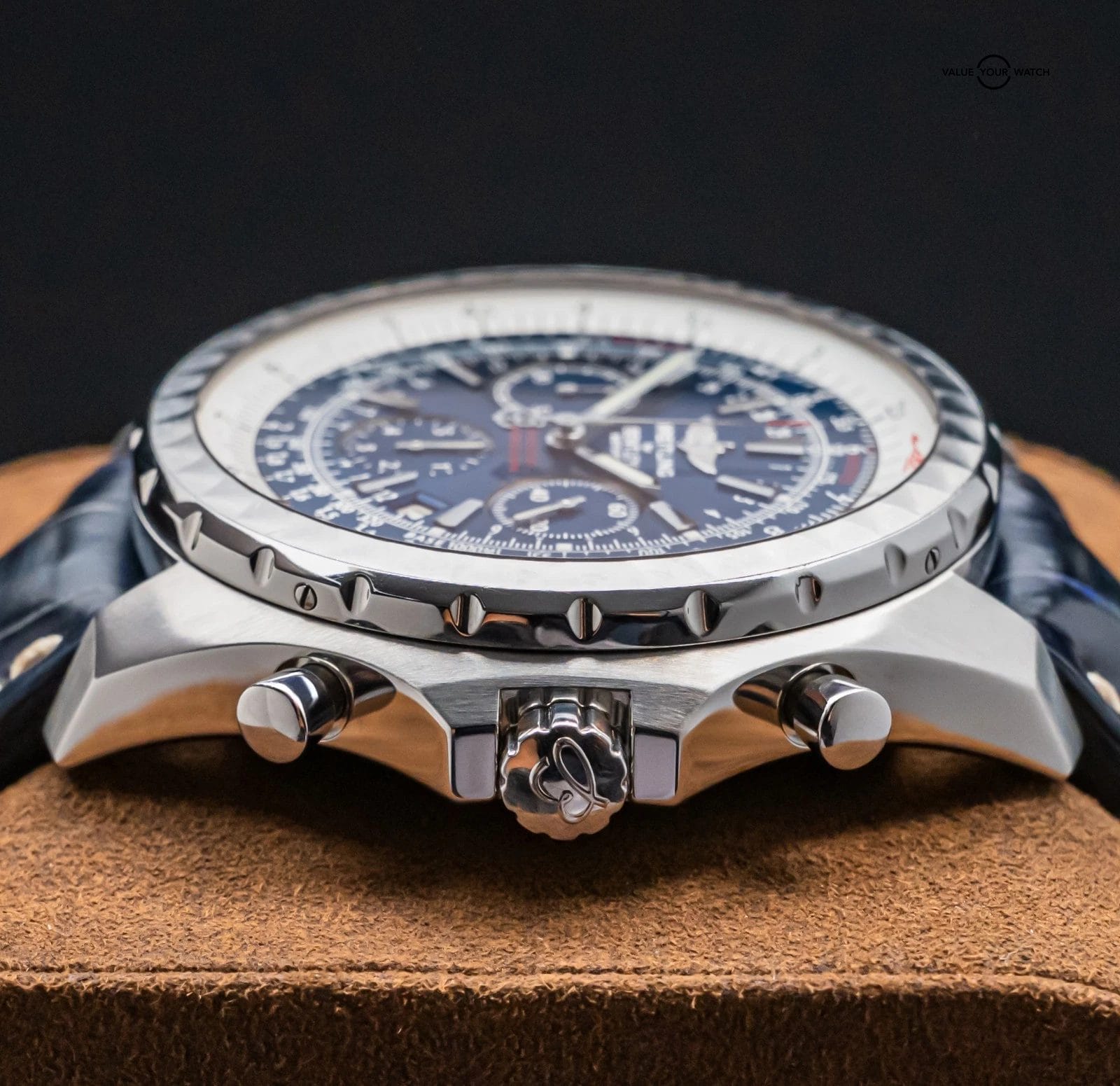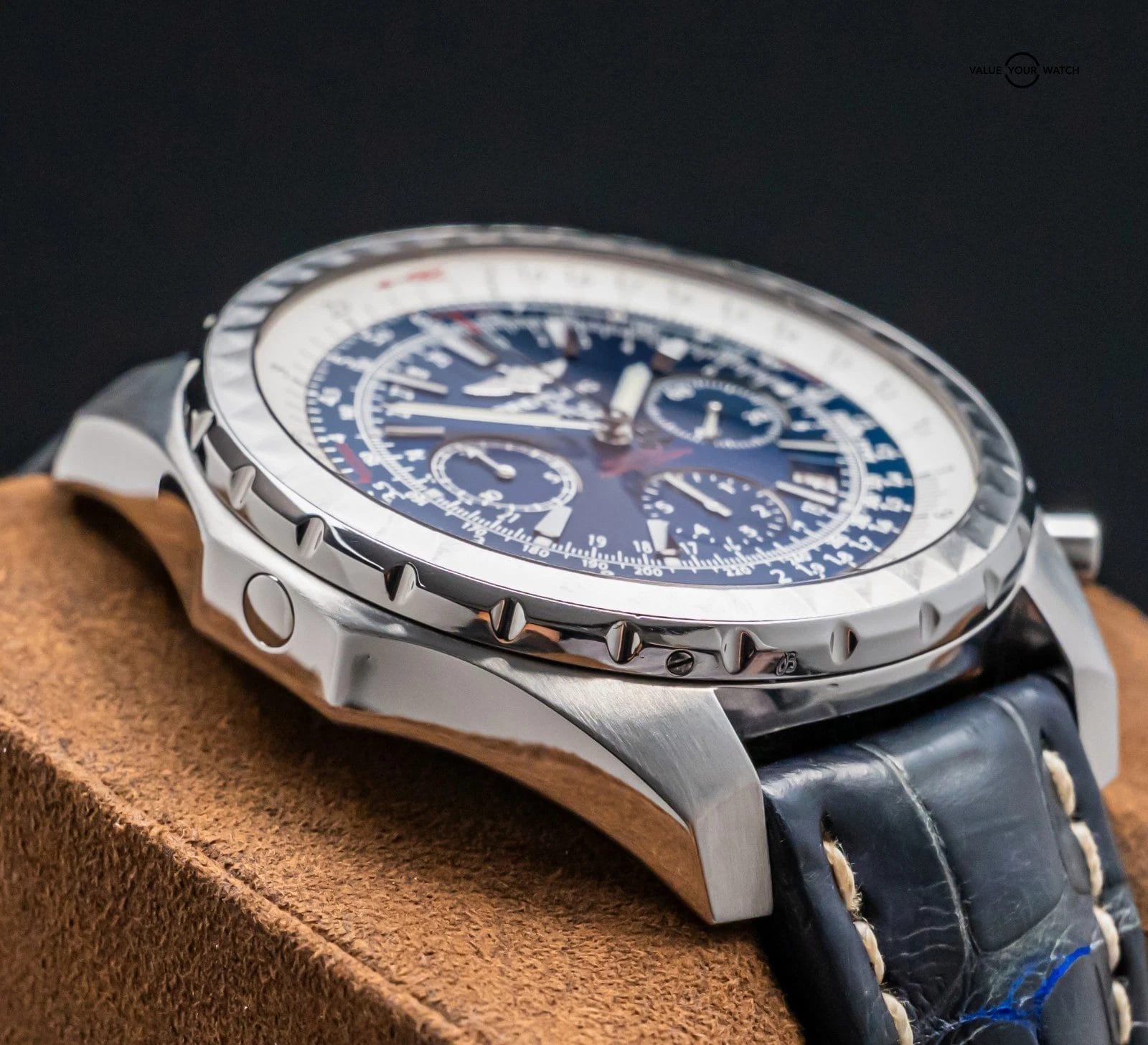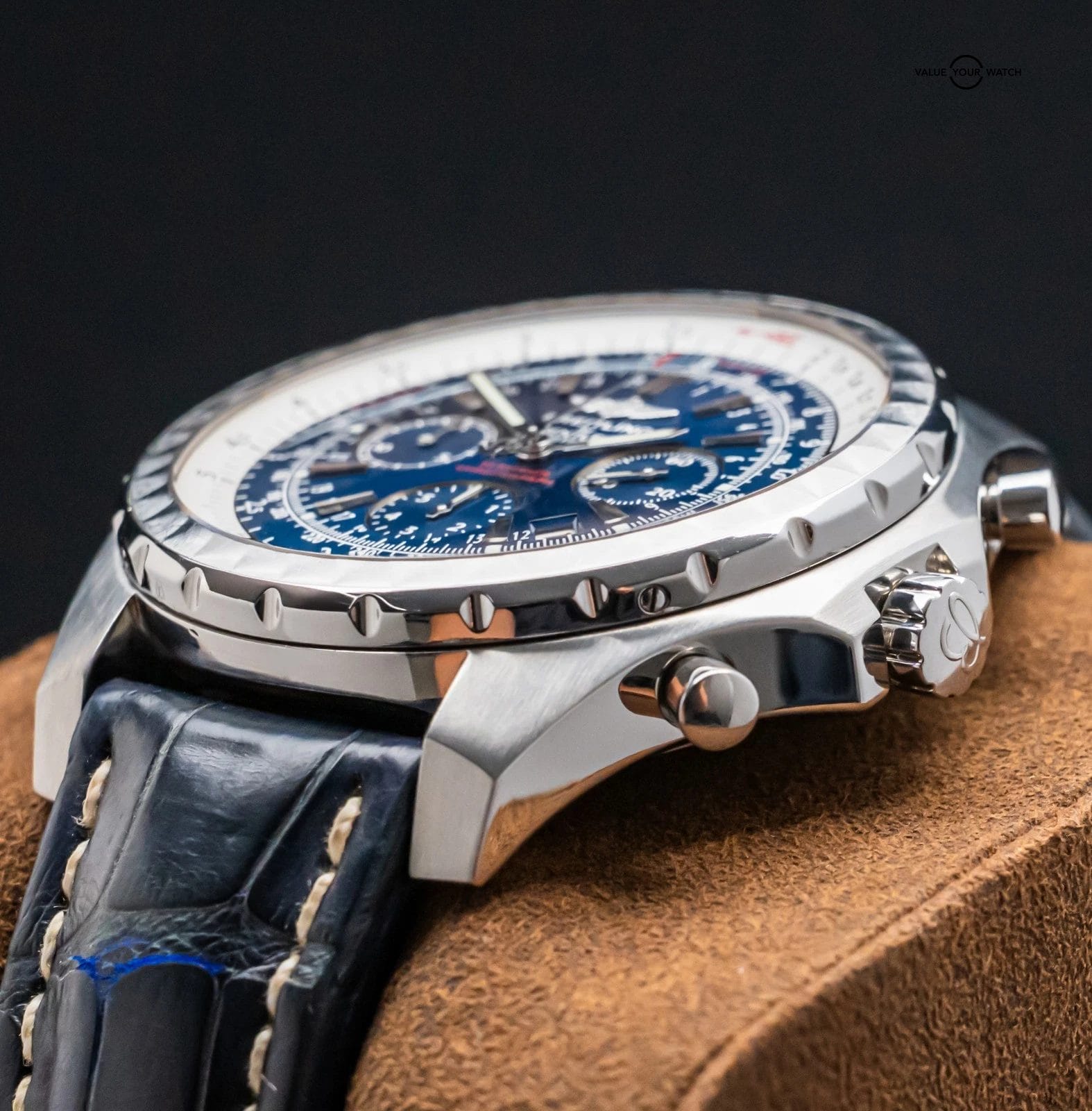 STRIKING Breitling Bentley Motors T 49 mm in Stainless Steel with the *RARE* Blue Dial on Blue Breitling Croco! Arrives with original modern Breitling box and was FULLY SERVICED at my watchmaker in January 2026, a huge value-add. The Chronograph is a 30-Second Chronograph function, incredibly rare to find in the world of fine timepieces. Whether you’re simply looking for a unique piece, love blue watches, or you love this piece’s ties to Bentley, this is the watch you’ve been looking for- a phenomenal conversation piece. Super stunning piece and not an easy find with the Blue Dial!