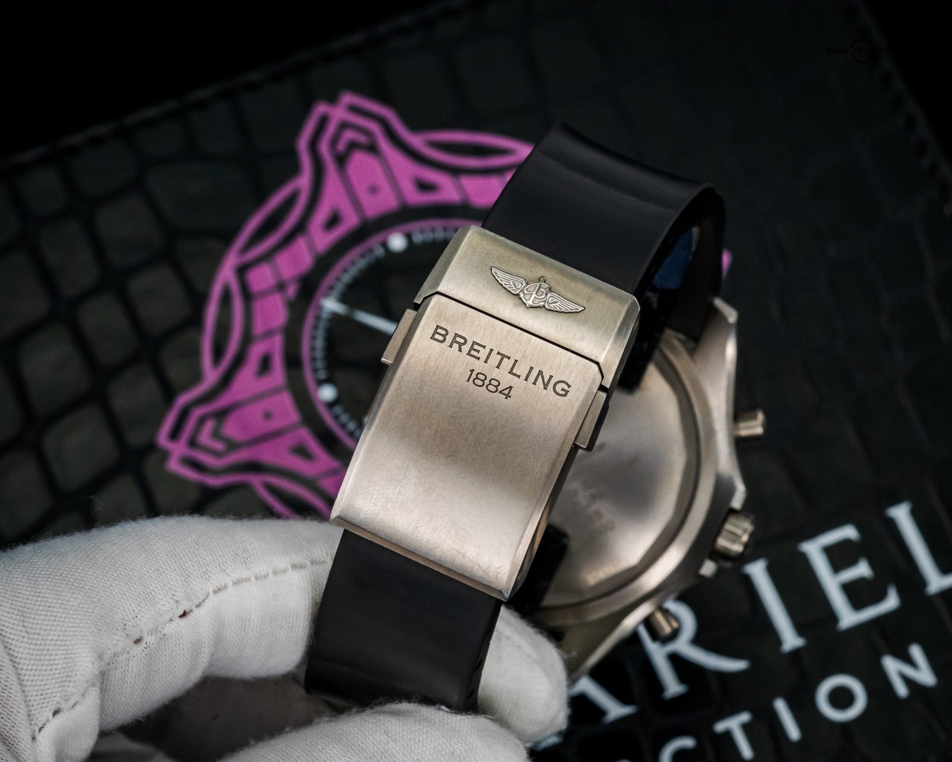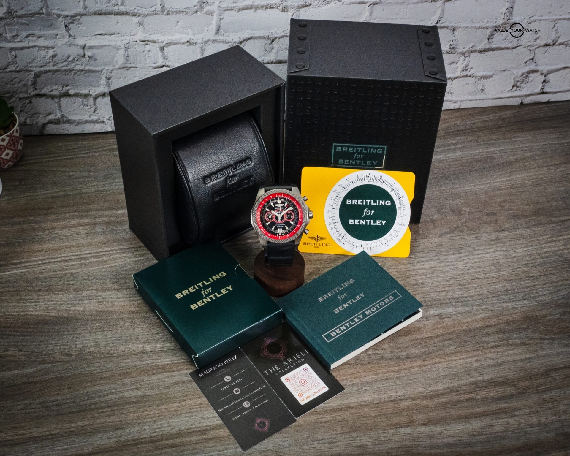 This watch comes with the box, travel roll, manual, slide rule, and document box. (Please note: no warranty booklet or certificates included. Pictured with generic Breitling for Bentley manual but correct manual will be included or sent separately).