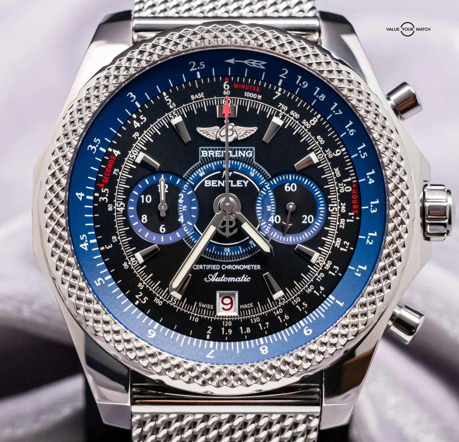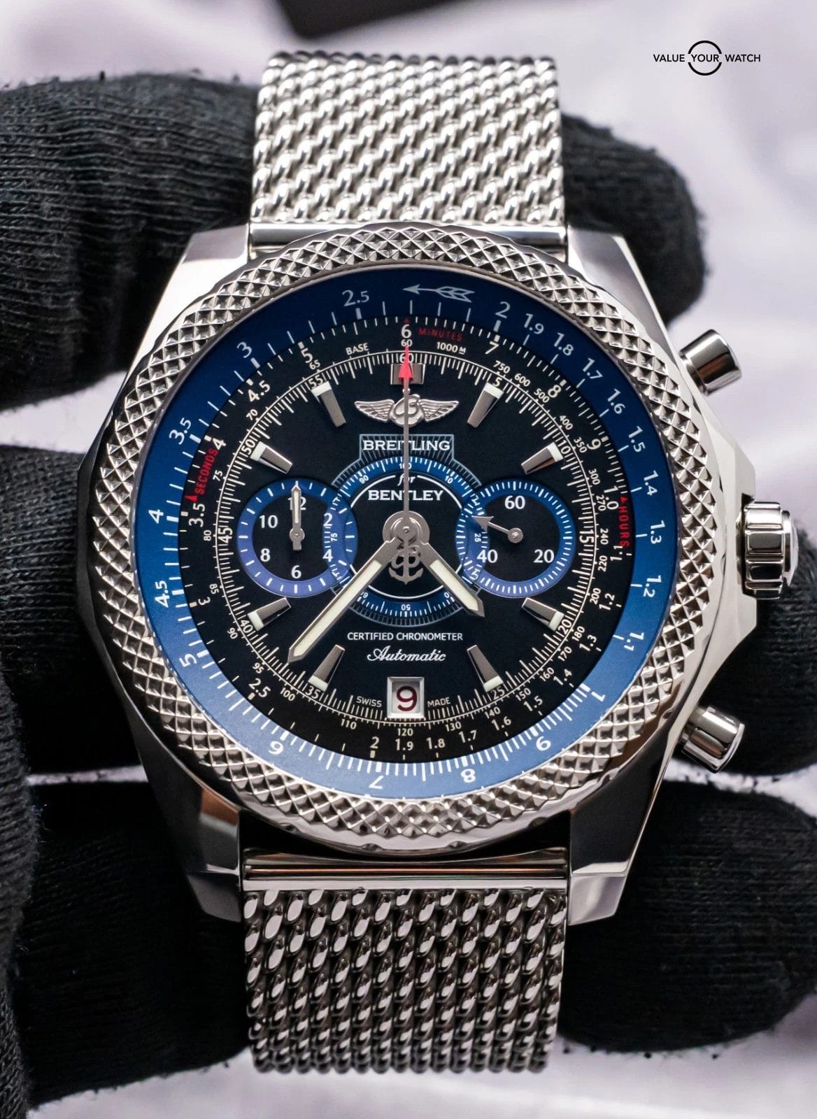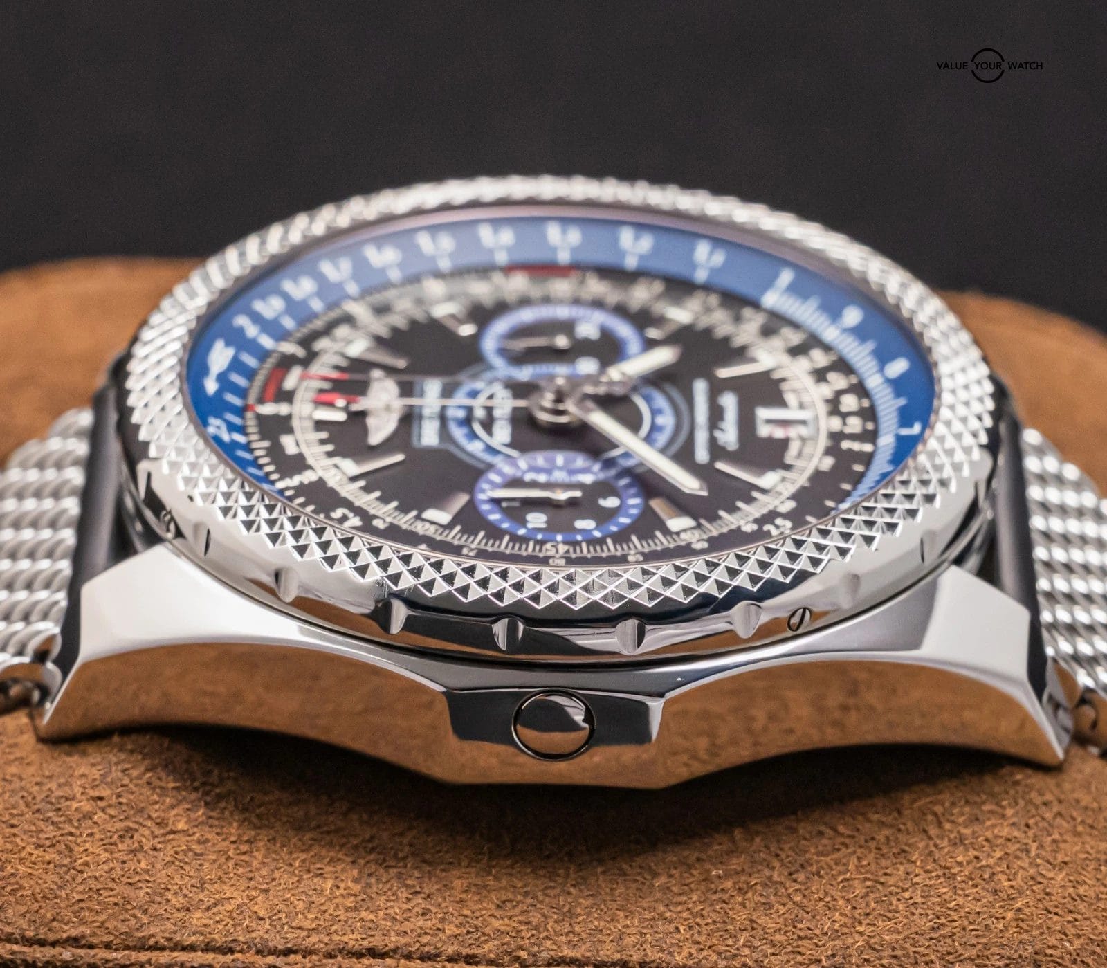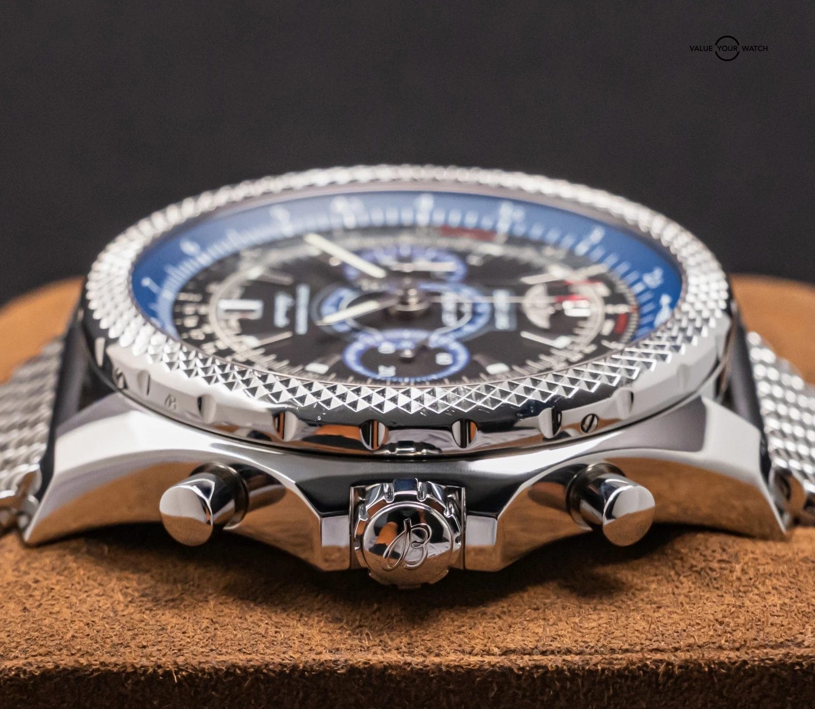STRIKING Breitling Bentley Supersports Limited Edition of 1000 in Stainless Steel 49 mm with *RARE* Black & Blue Dial on Stainless Steel Breitling Mesh! Comes with original Breitling boxes and is a very rare find on the secondary market, the Dial is insanely cool in person. In general, the Bentley Supersports Limited Edition is not an easy find; in fact, at the time of listing, there is only Black & Blue Dial for sale globally. It is ready to be on wrist!