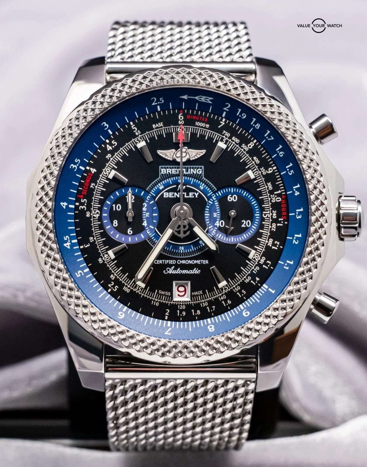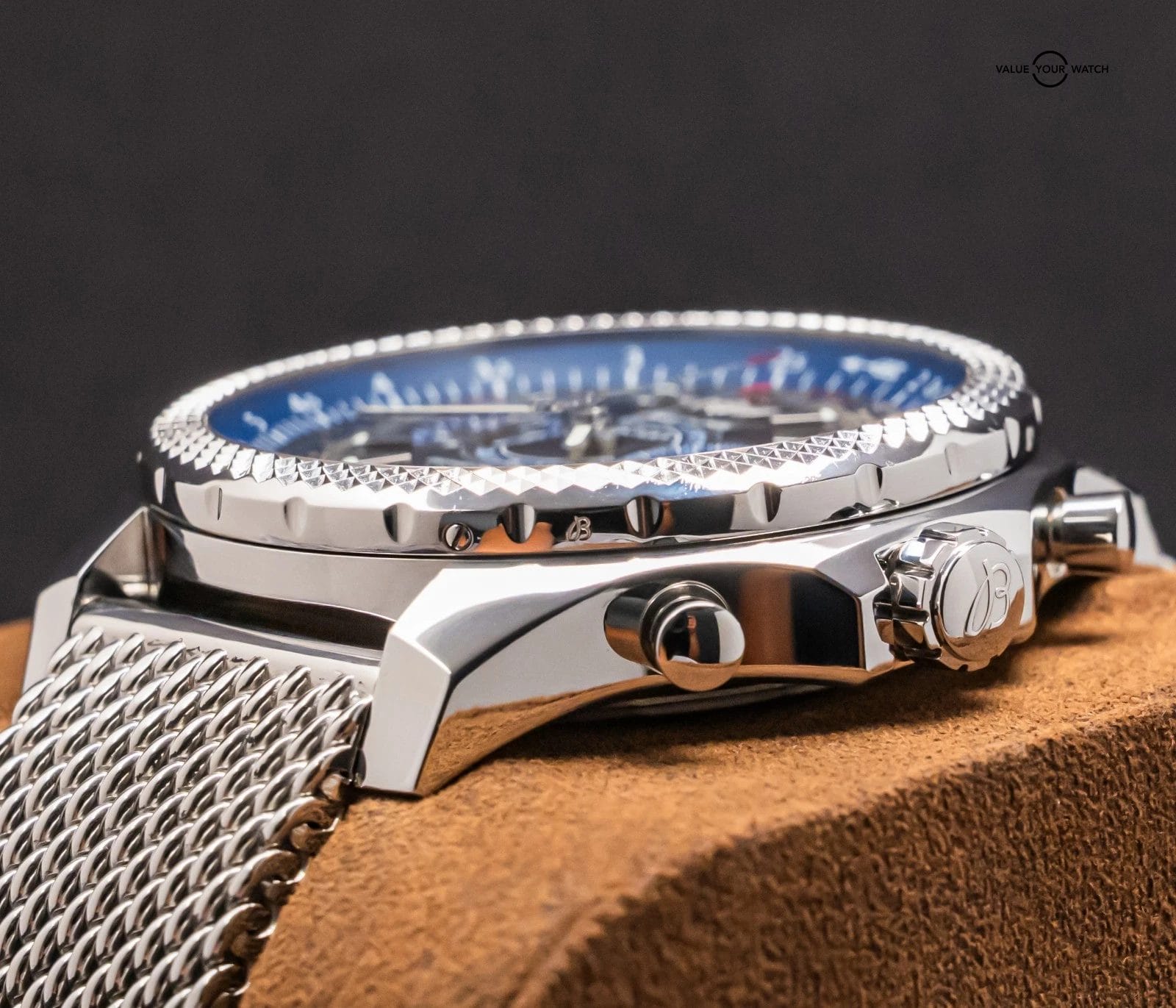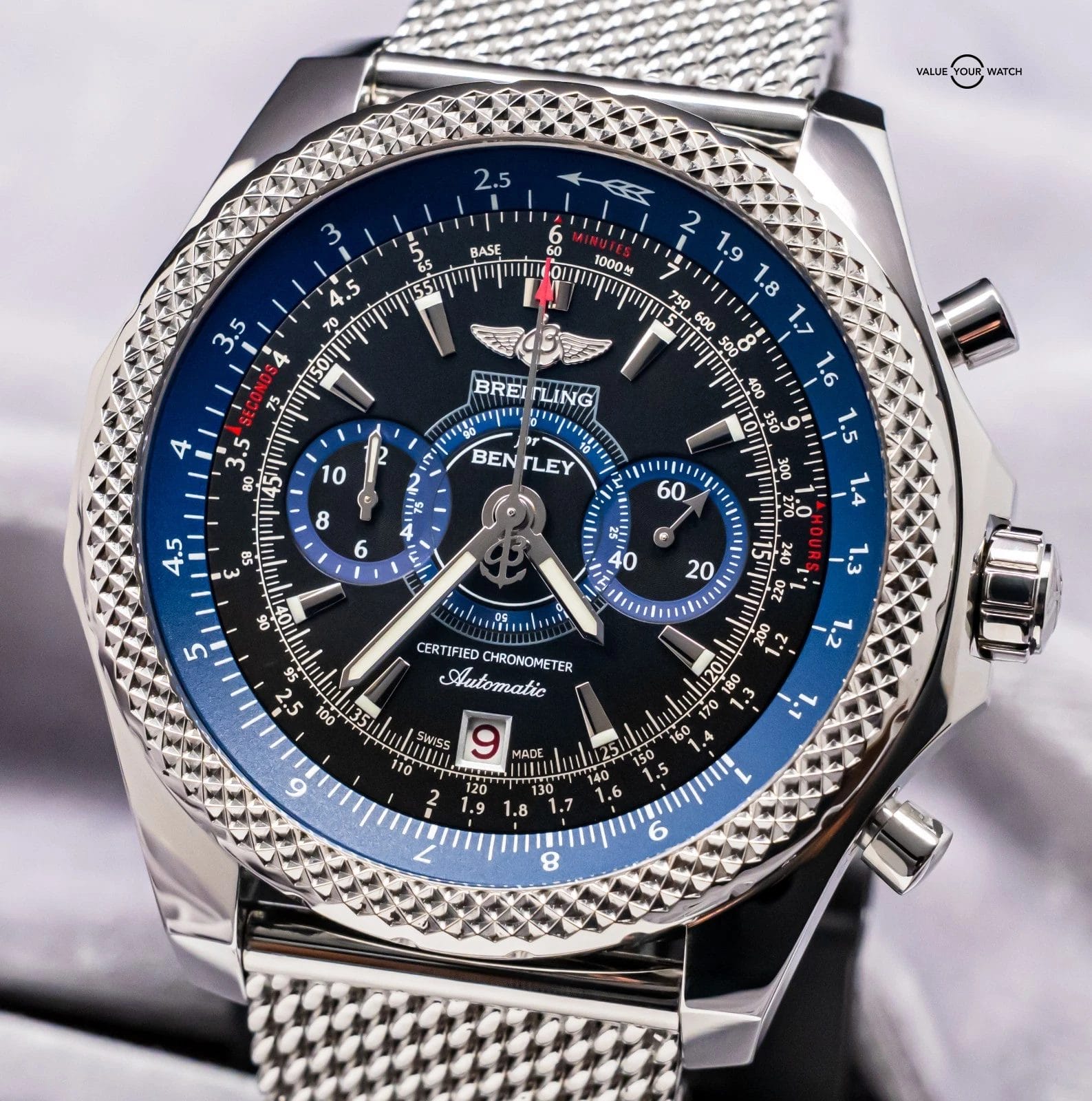 STRIKING Breitling Bentley Supersports Limited Edition of 1000 in Stainless Steel 49 mm with *RARE* Black & Blue Dial on Stainless Steel Breitling Mesh! Comes with original Breitling boxes and is a very rare find on the secondary market, the Dial is insanely cool in person. In general, the Bentley Supersports Limited Edition is not an easy find; in fact, at the time of listing, there is only Black & Blue Dial for sale globally. It is ready to be on wrist!