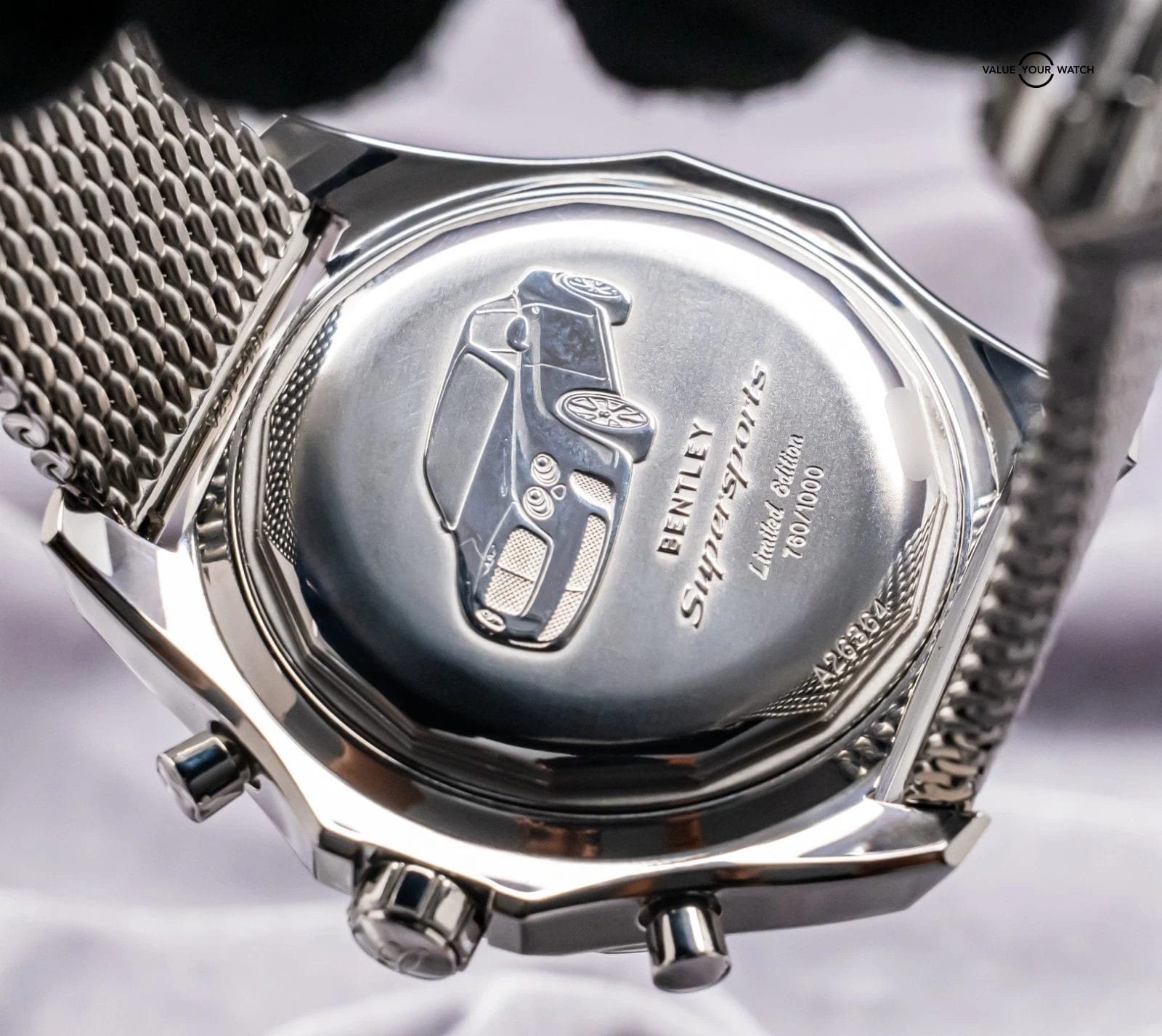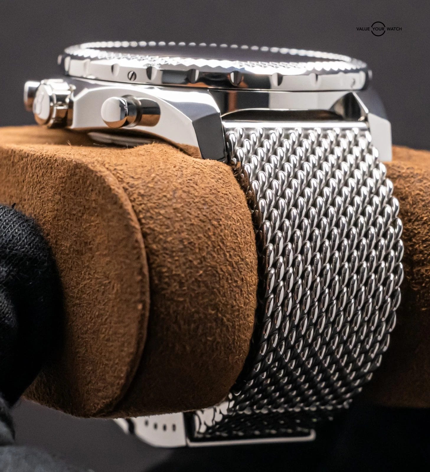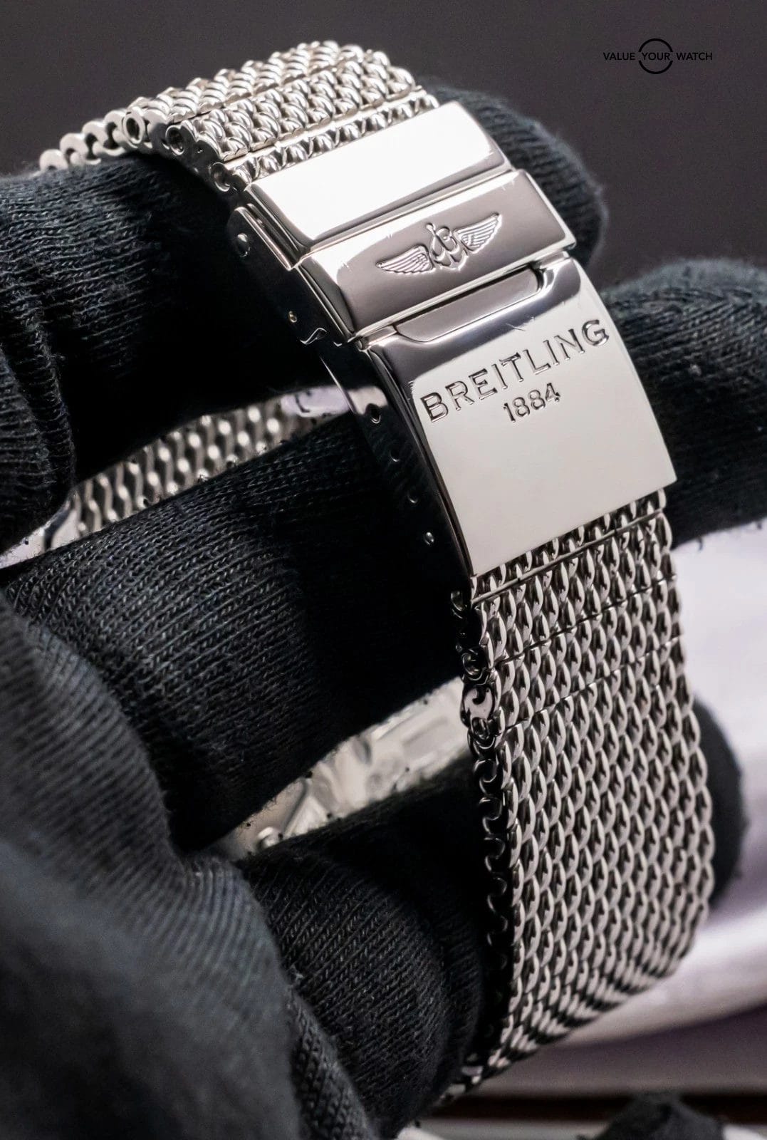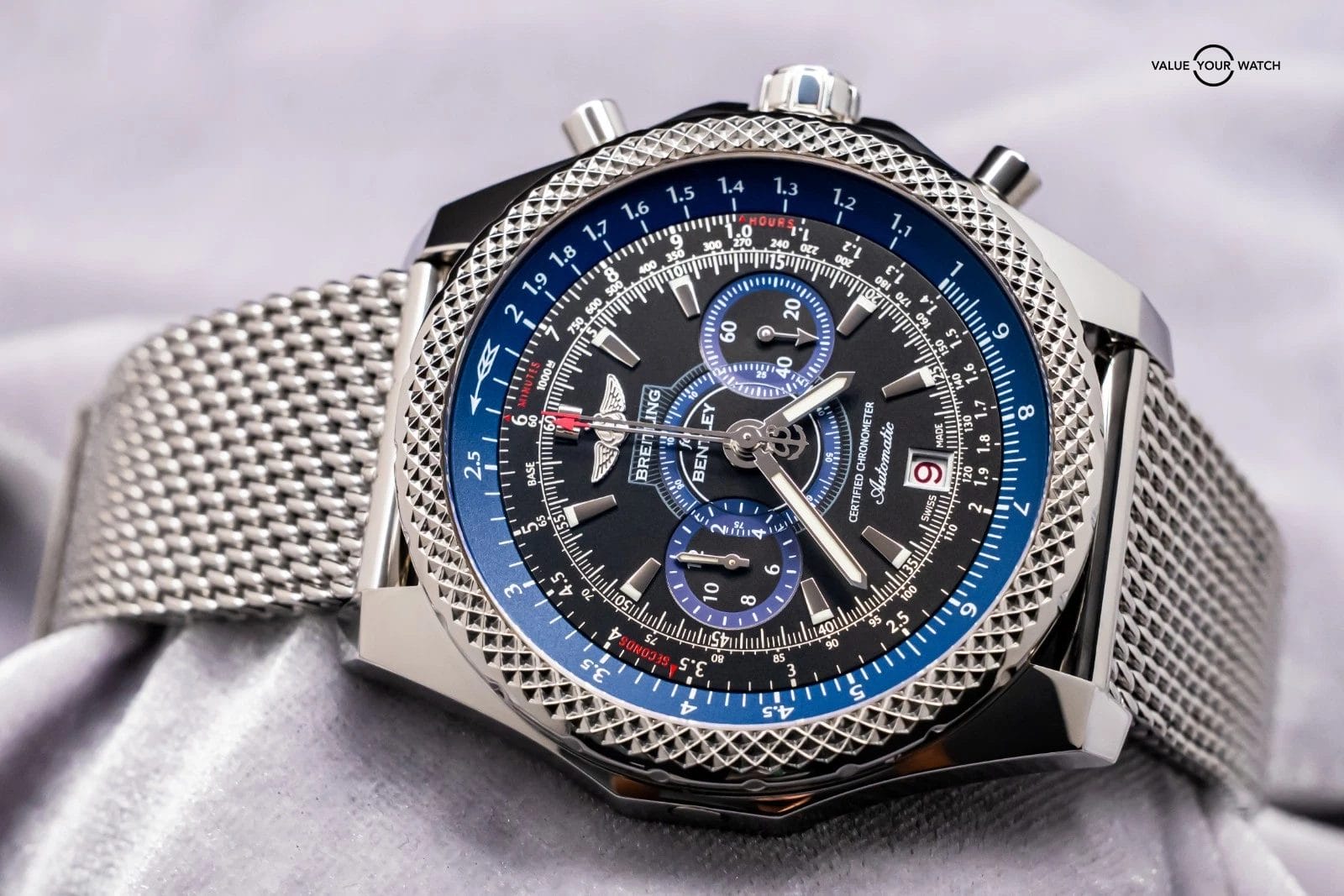 STRIKING Breitling Bentley Supersports Limited Edition of 1000 in Stainless Steel 49 mm with *RARE* Black & Blue Dial on Stainless Steel Breitling Mesh! Comes with original Breitling boxes and is a very rare find on the secondary market, the Dial is insanely cool in person. In general, the Bentley Supersports Limited Edition is not an easy find; in fact, at the time of listing, there is only Black & Blue Dial for sale globally. It is ready to be on wrist!