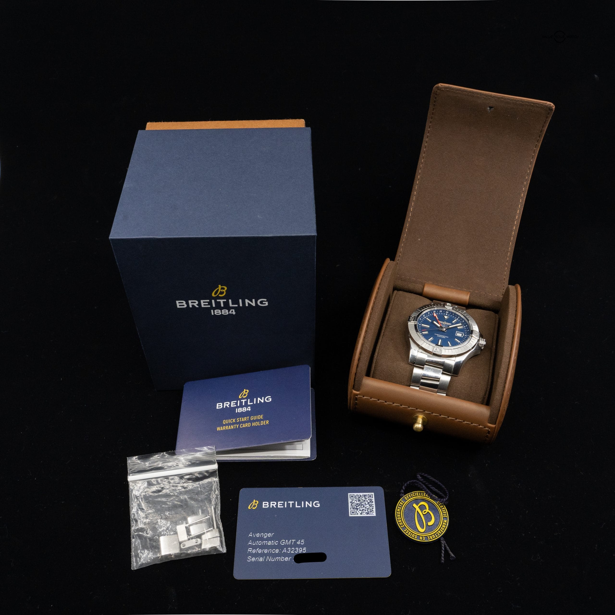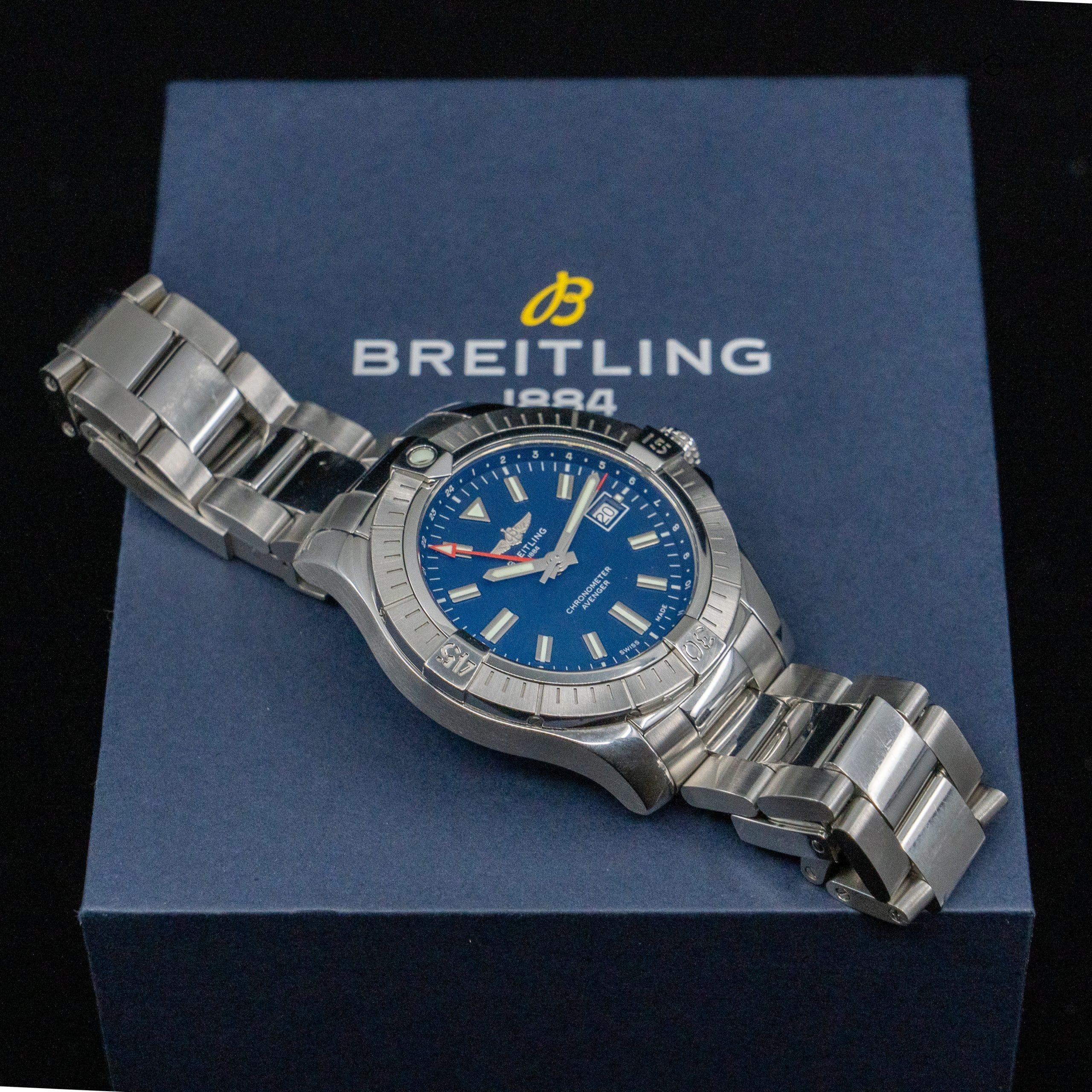 The Breitling Avenger Automatic GMT 45 was designed for airborne adventurers who regularly traverse multiple timezones. The red GMT hand contrasts beautifully against a blue dial, which is protected by a glare-proof cambered sapphire crystal.
