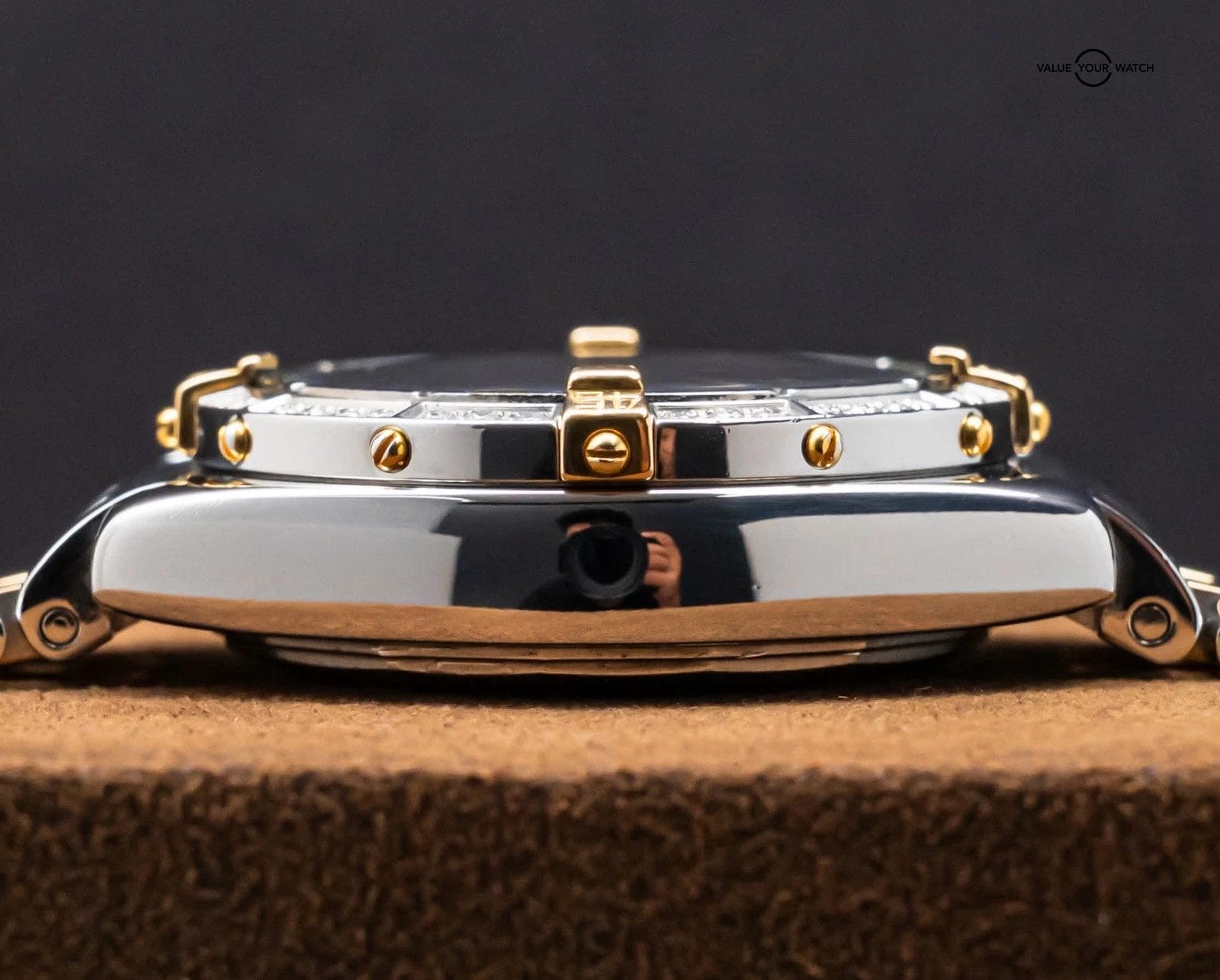 STUNNING Breitling Callisto in Two-Tone 18K Yellow Gold & Steel 34.4 mm with FACTORY Diamond Bezel and FACTORY Diamond-Set Motor of Pearl Dial on Matching Two-Tone 18K Yellow Gold & Steel Pilot Bracelet! Comes with modern Breitling box and is absolutely striking women’s piece at the price point. Ready to be on wrist!