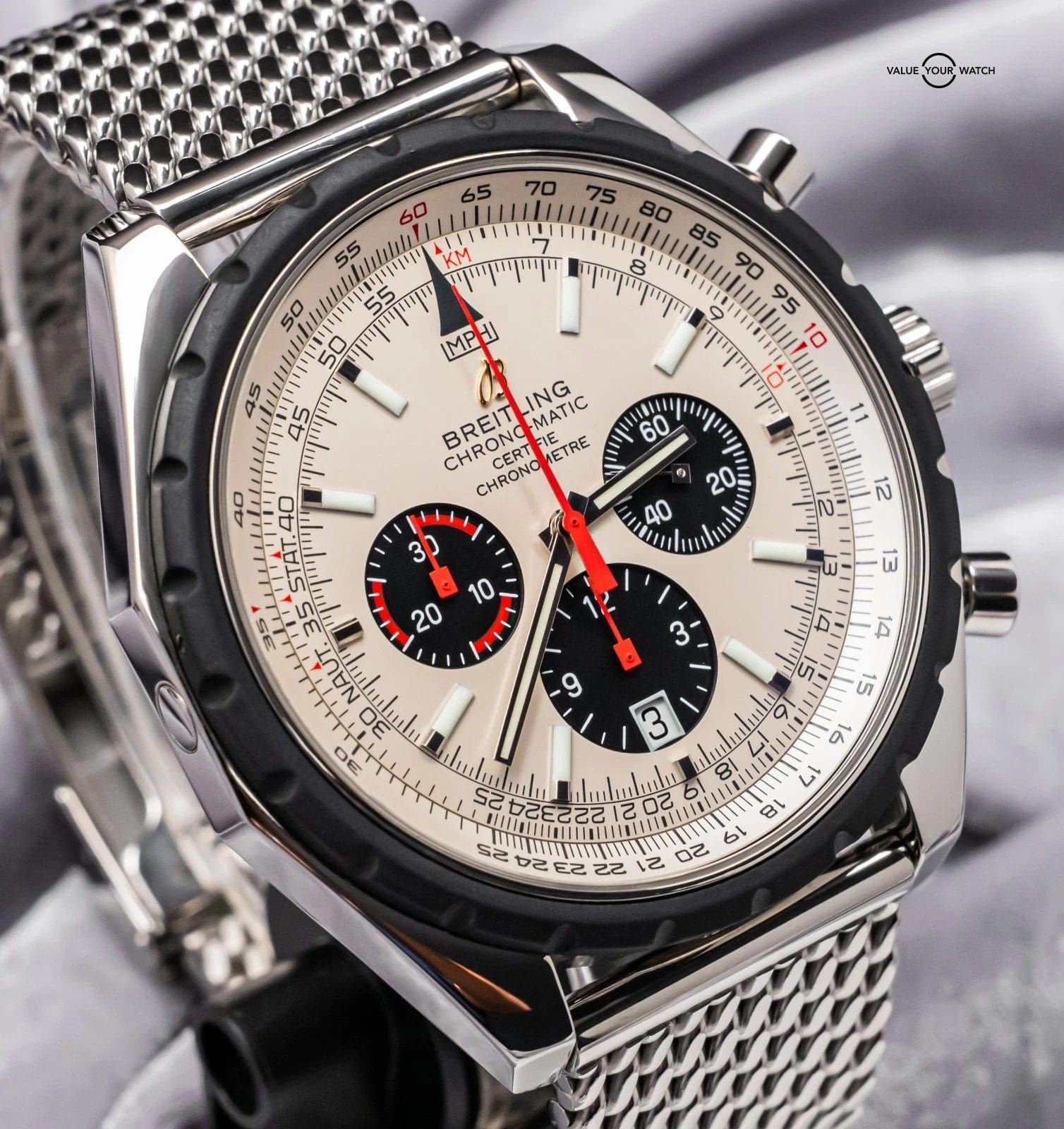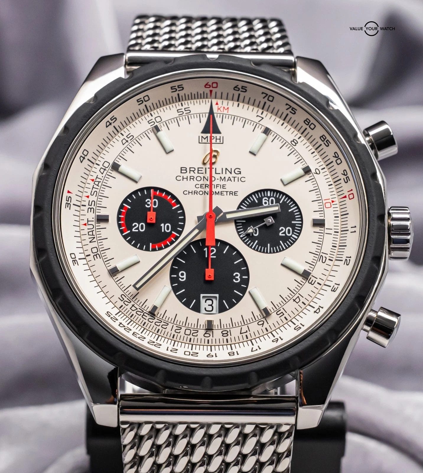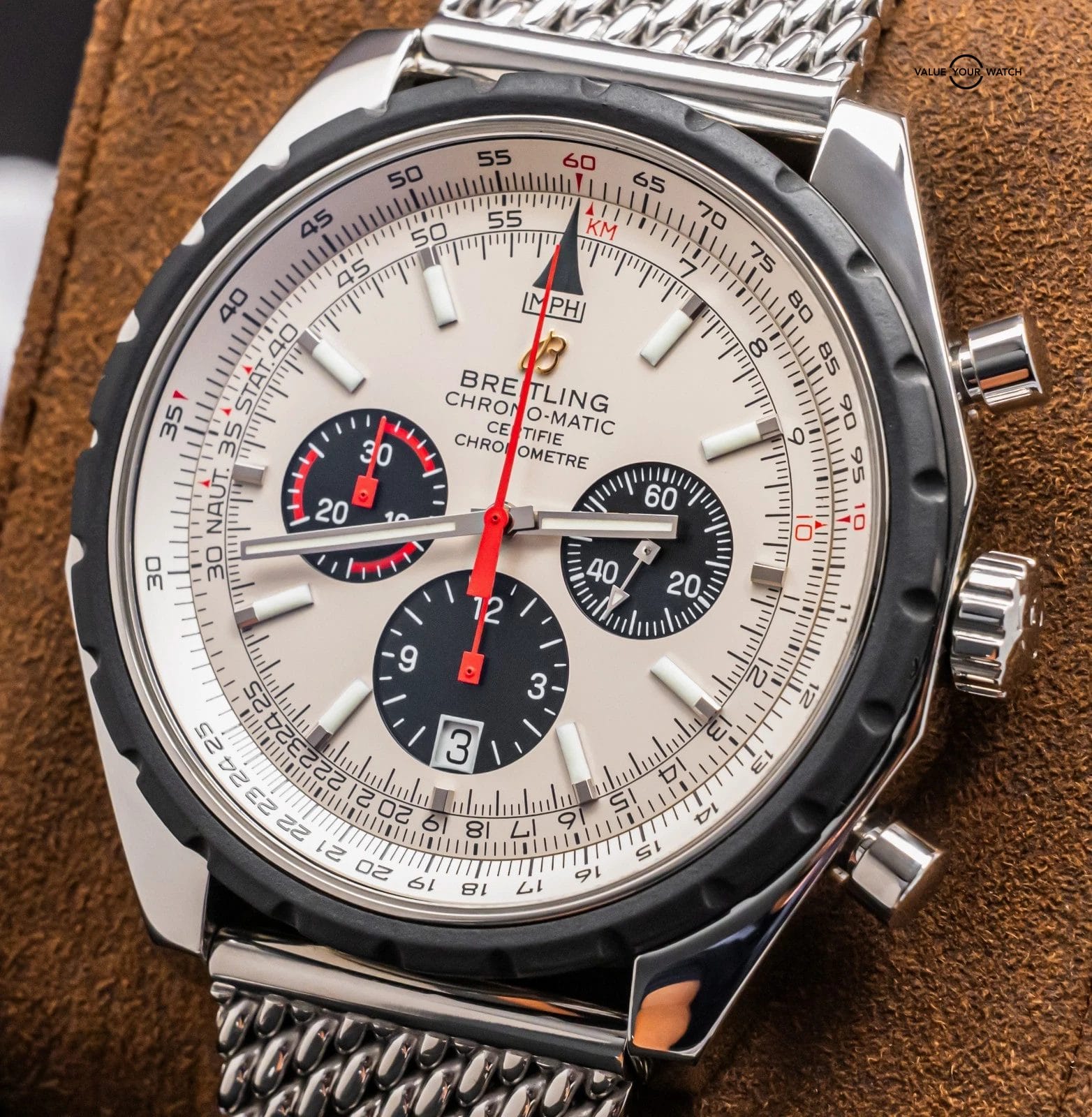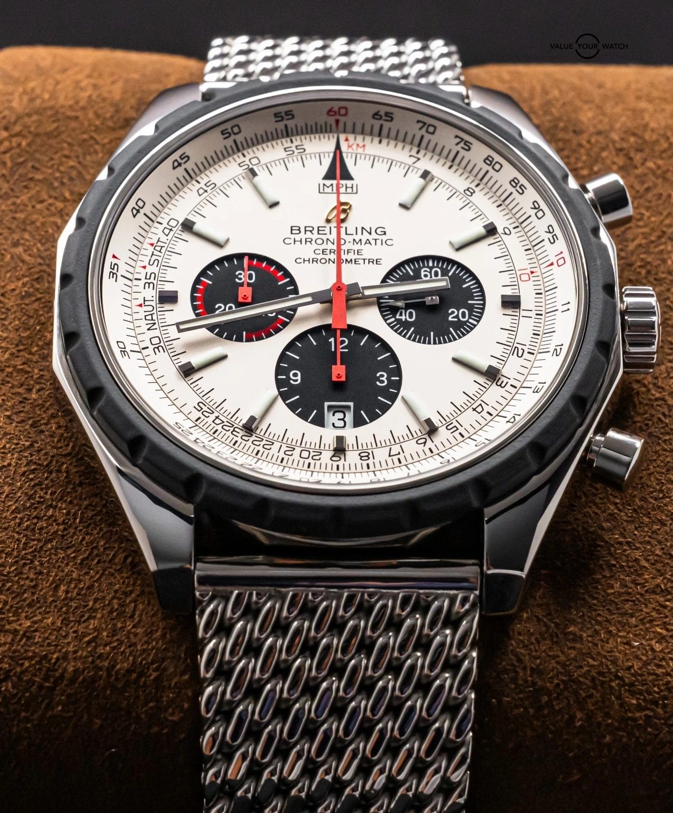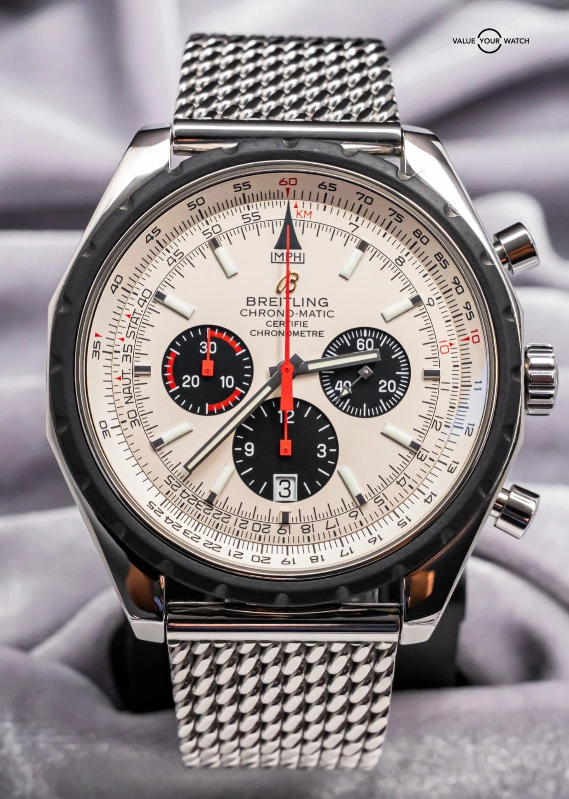 STRIKING Breitling Chrono-Matic 49 mm with Silver Dial on Mesh Steel Bracelet! Arrives with original Breitling boxes and is a relatively rare piece to find. I love the color combination and Mesh Bracelet. Stunning setup, timeless future classic!
