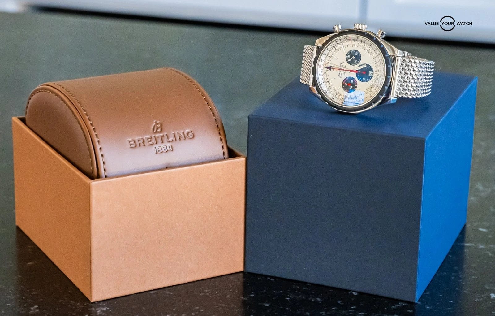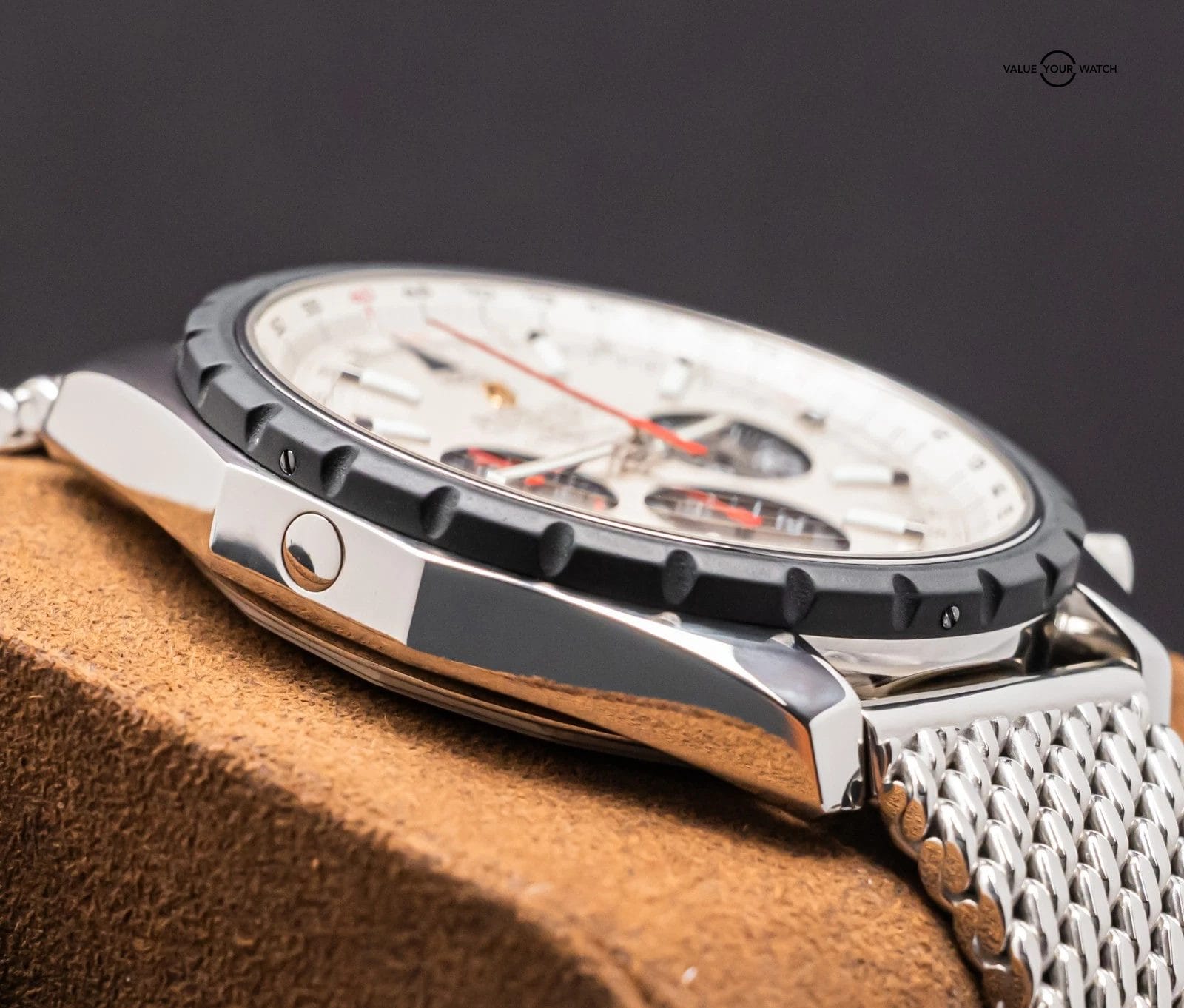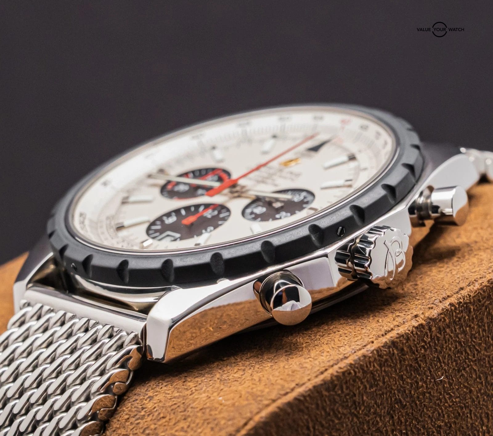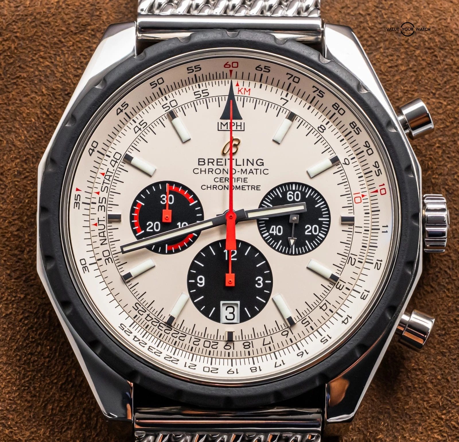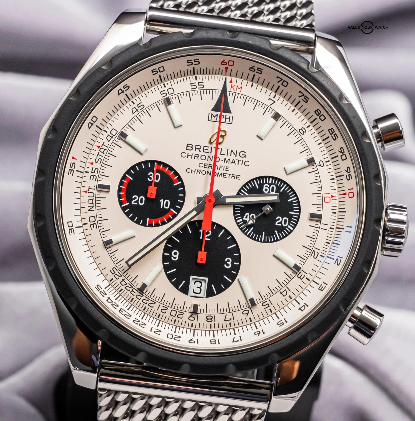 STRIKING Breitling Chrono-Matic 49 mm with Silver Dial on Mesh Steel Bracelet! Arrives with original Breitling boxes and is a relatively rare piece to find. I love the color combination and Mesh Bracelet. Stunning setup, timeless future classic!