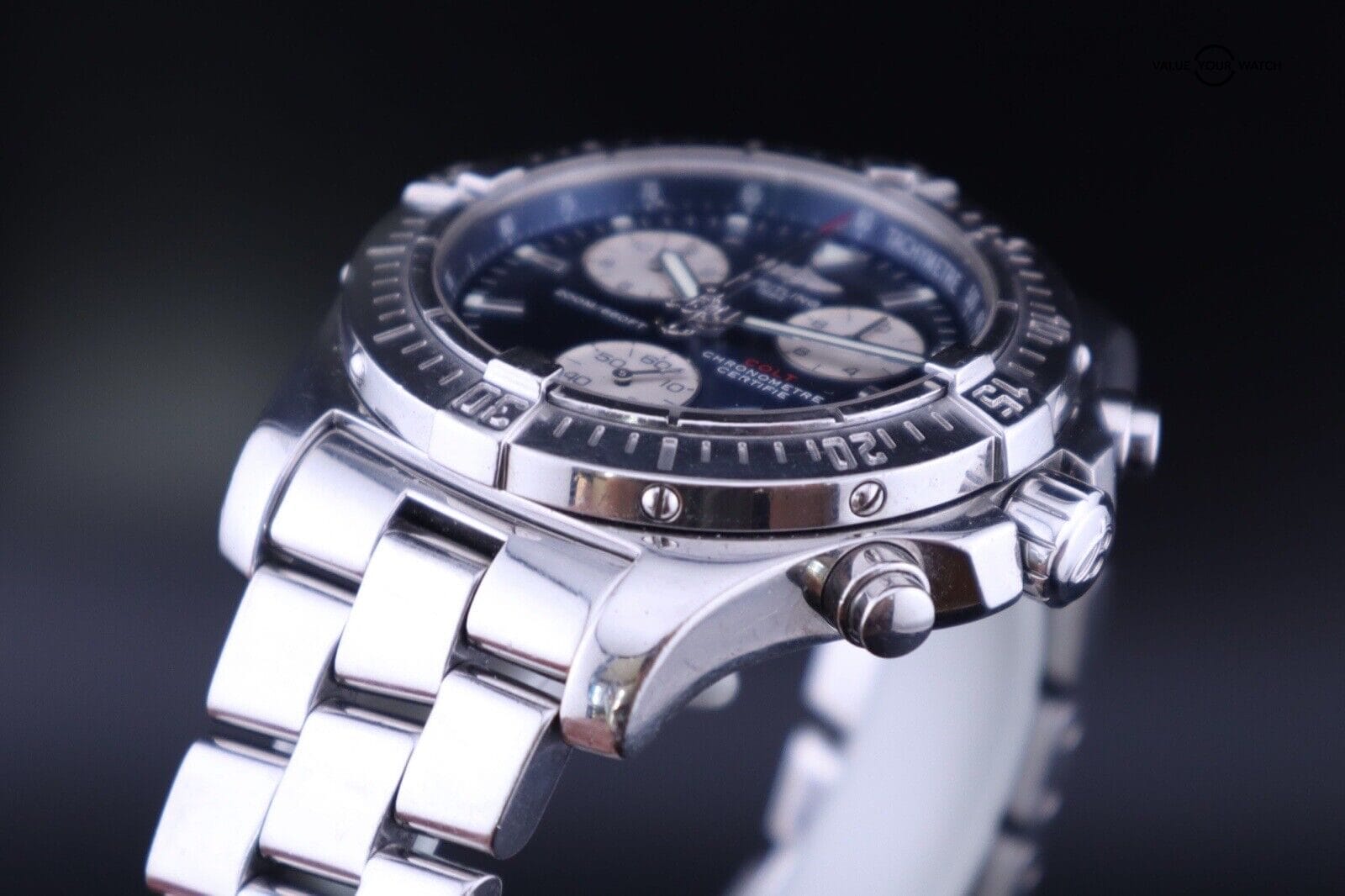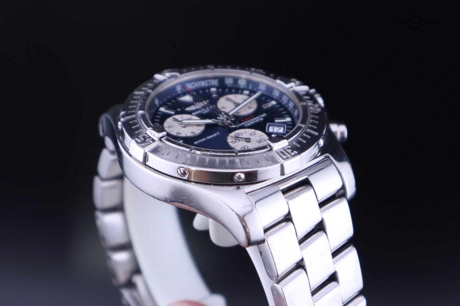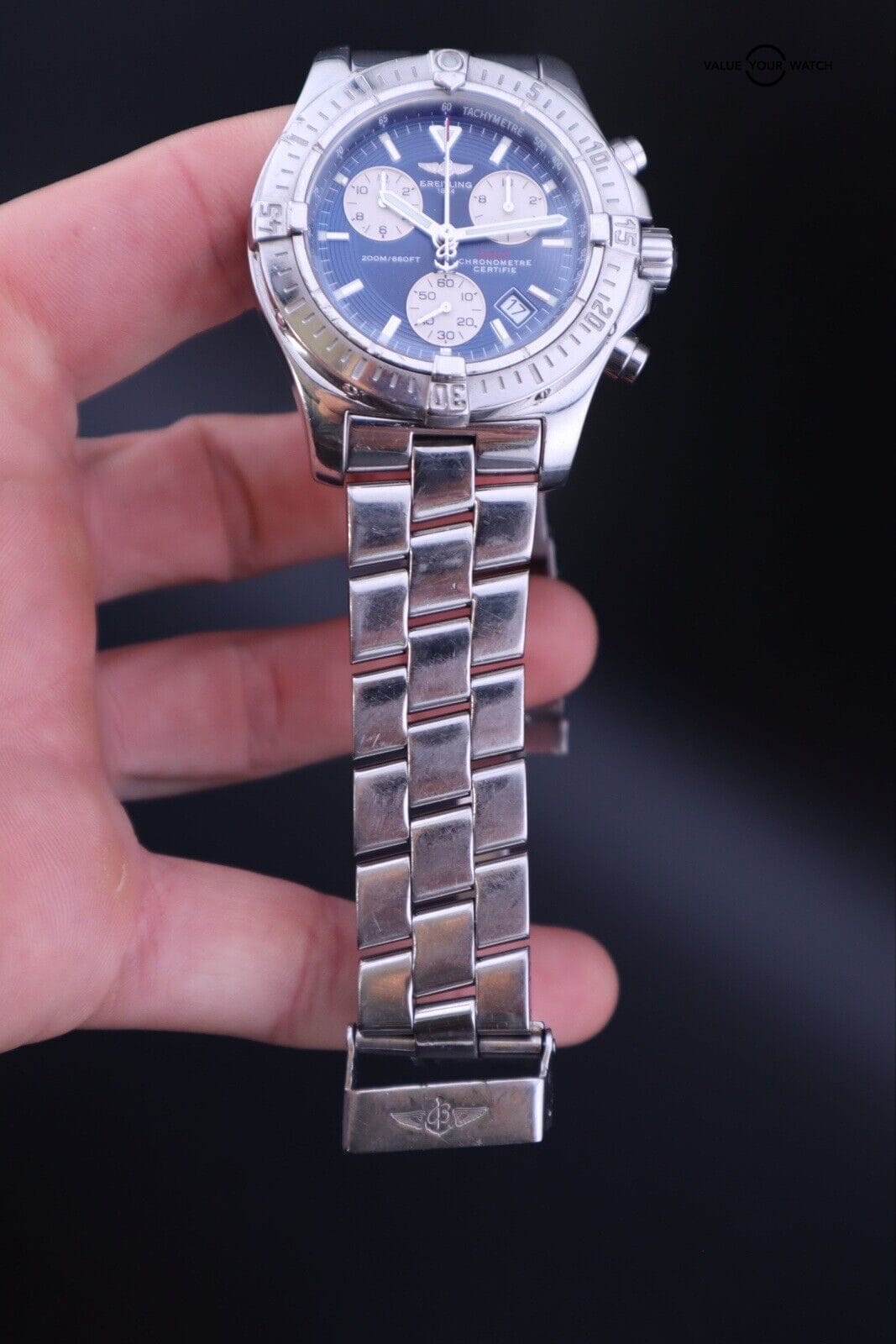 The Breitling Colt A73380 showcases a striking blue dial with large Arabic numerals and luminous hands, ensuring easy readability in low-light conditions. The stainless steel case measures 41.5mm in diameter, providing a comfortable fit on most wrists. It also houses a reliable quartz movement, offering precise timekeeping without the need for manual winding.
