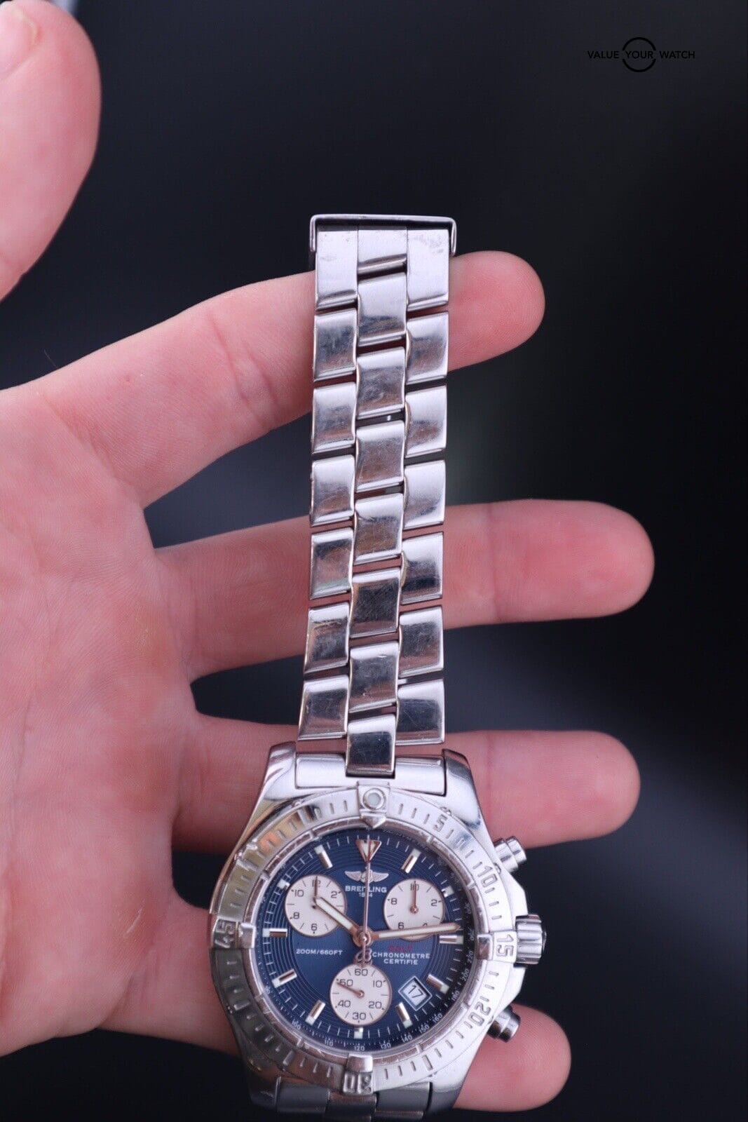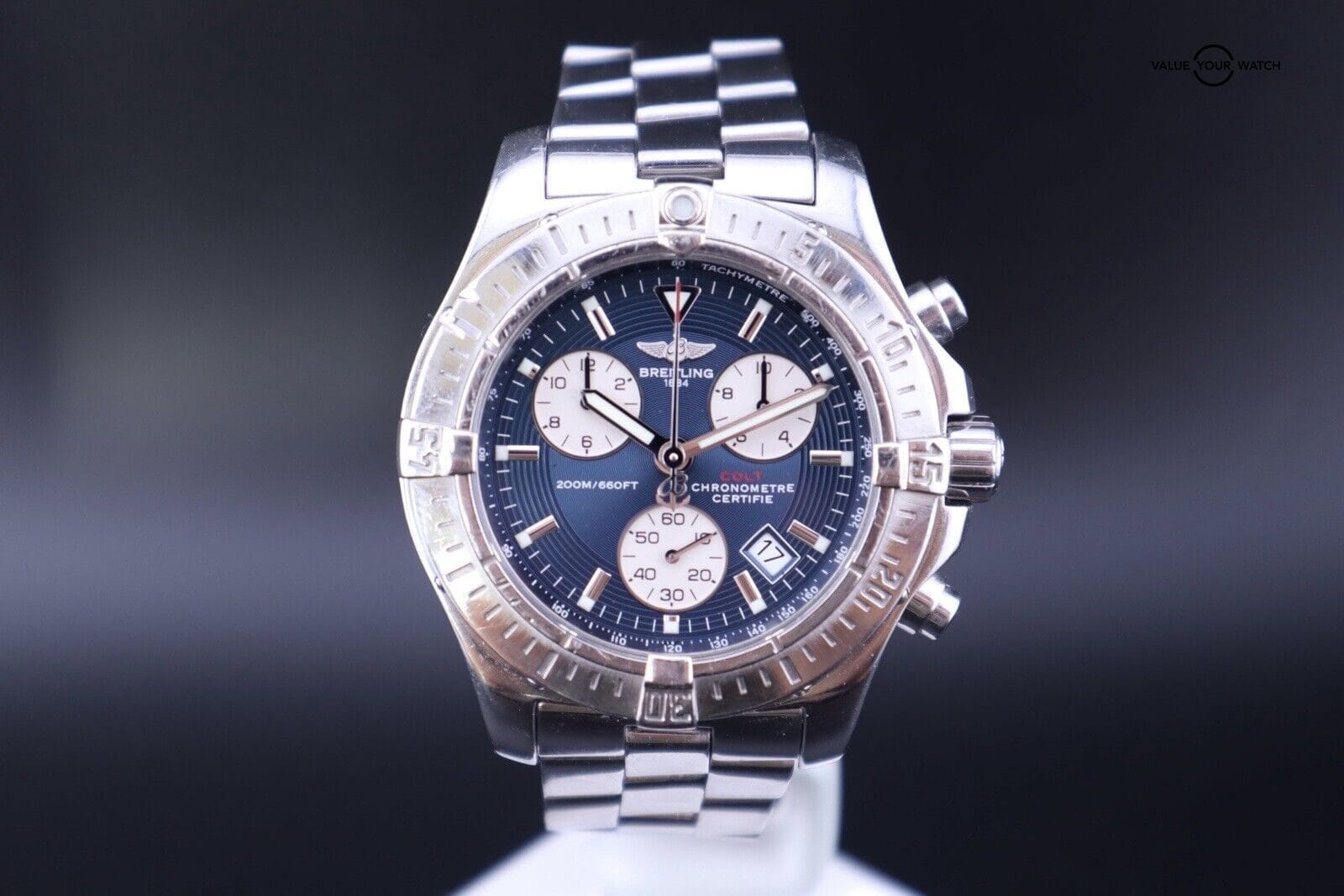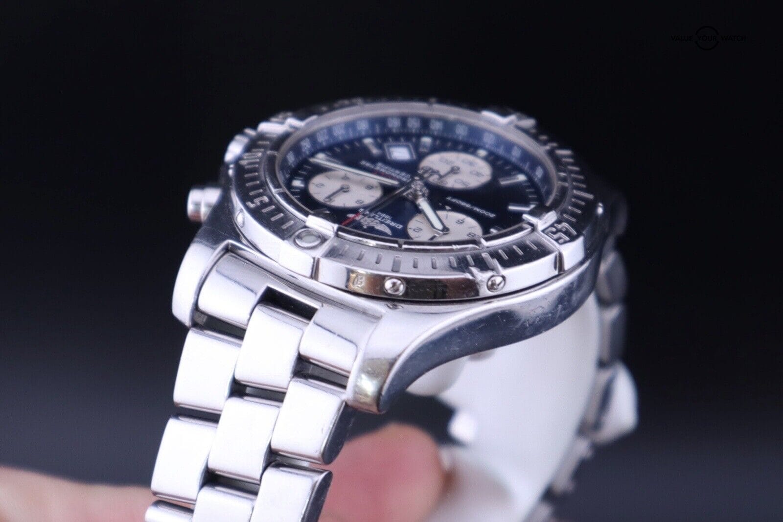 The Breitling Colt A73380 showcases a striking blue dial with large Arabic numerals and luminous hands, ensuring easy readability in low-light conditions. The stainless steel case measures 41.5mm in diameter, providing a comfortable fit on most wrists. It also houses a reliable quartz movement, offering precise timekeeping without the need for manual winding.