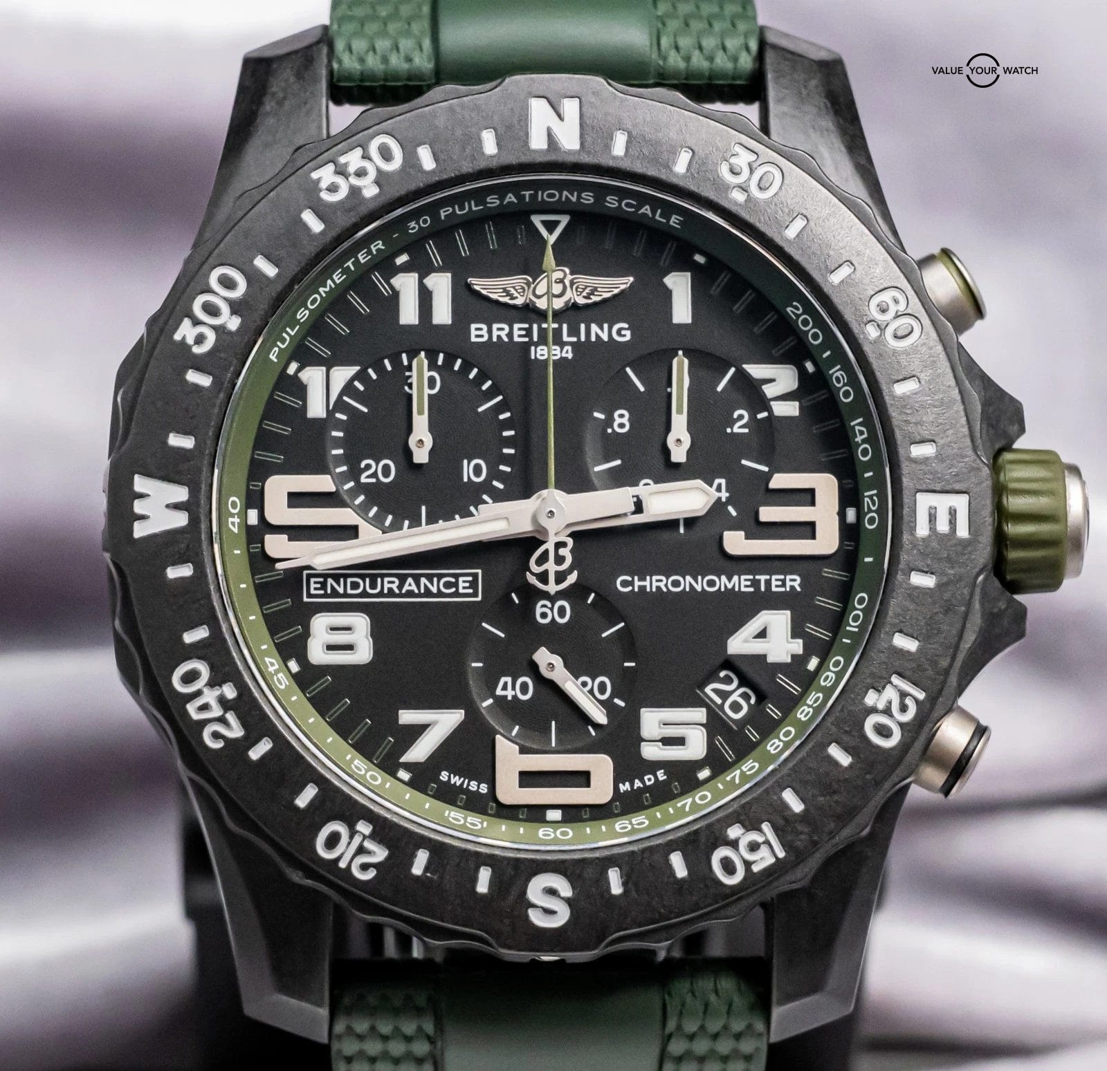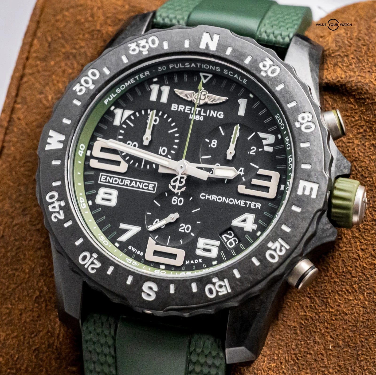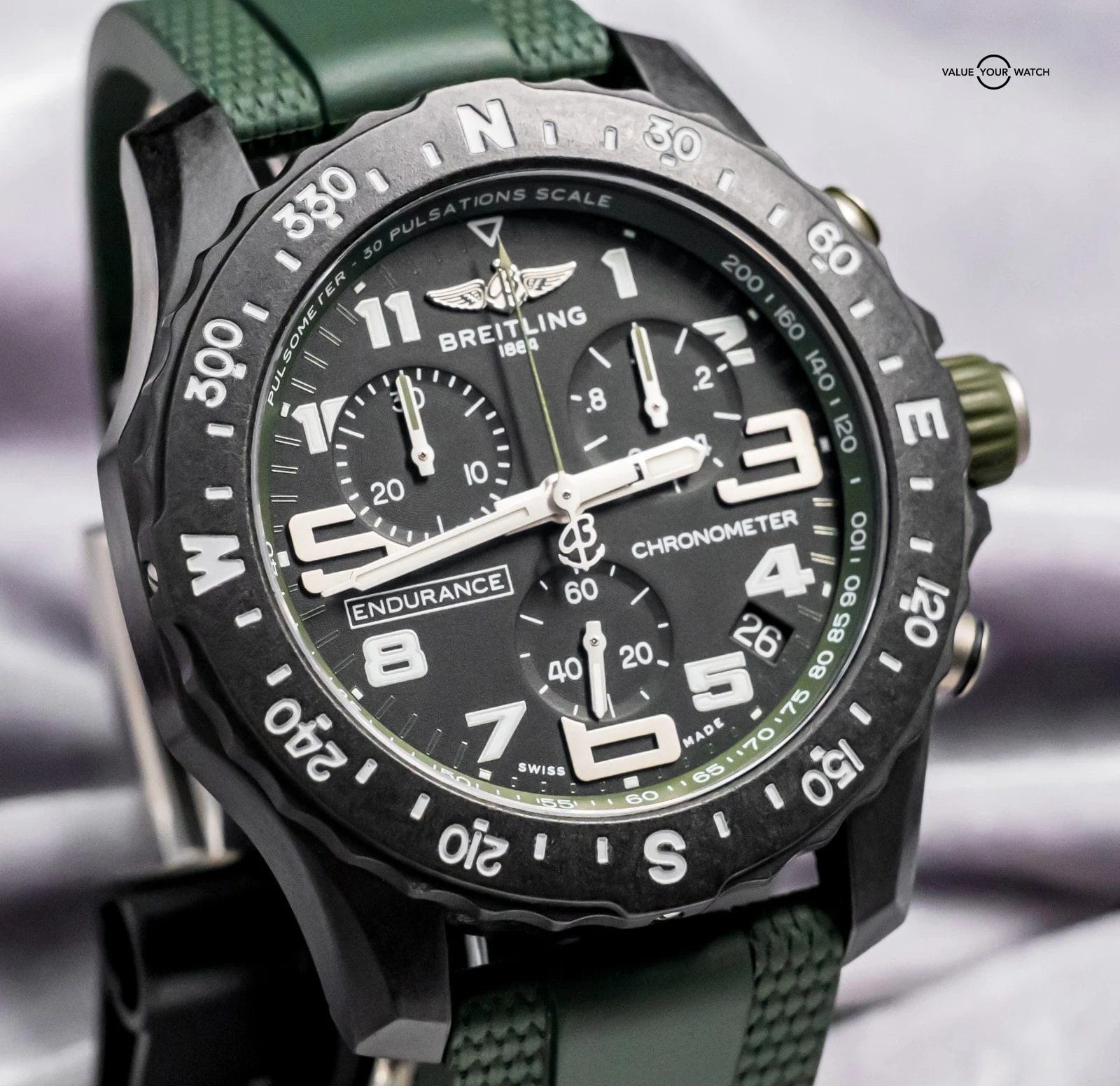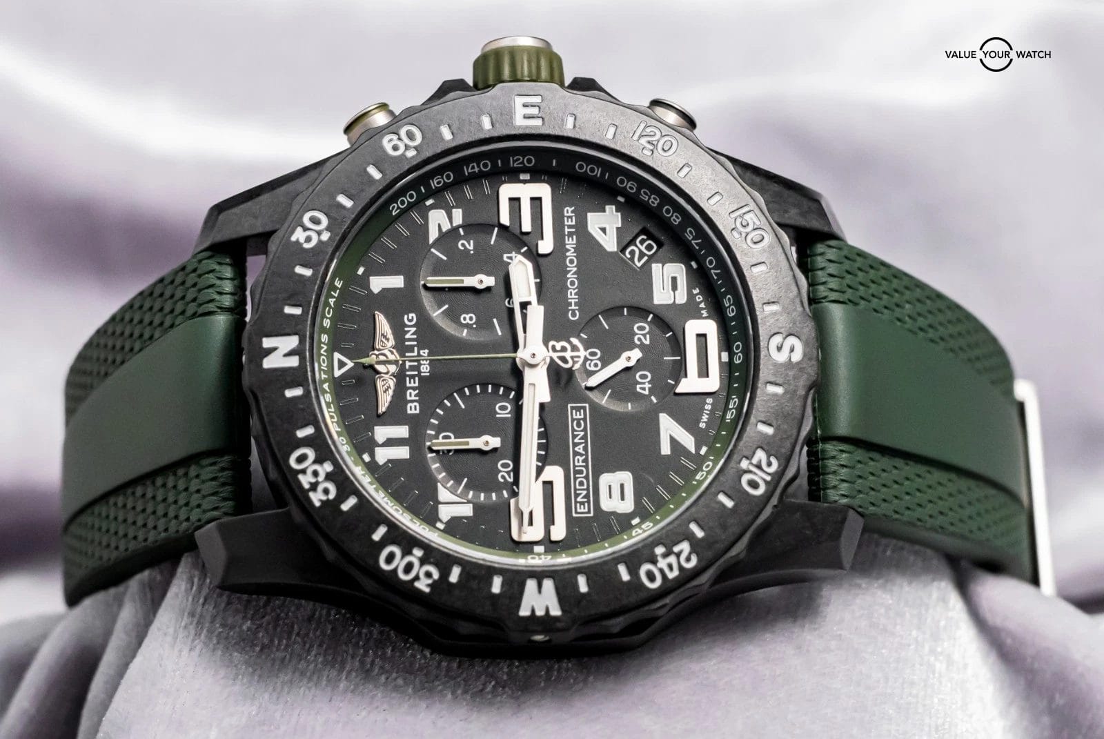 STUNNING Breitling Endurance Pro 44 mm with Black & Green Dial on Green Breitling Rubber & Deploy Clasp! Arrives as watch only and was originally purchased at a Breitling Authorized Dealer in April 2023. It was recently taken on trade by a local client and is powered by the Caliber 82 SuperQuartz Movement, reliable for everyday use and great for versatility. Keep in mind that most Endurances are on Tang, and my client had upgraded this piece to Deploy Clasp for easier use and increased comfort. If I was to personally wear an Endurance, I would immediately upgrade it to the deploy clasp like this one has. A lot of bang for the buck as a solid Breitling Chronometer!