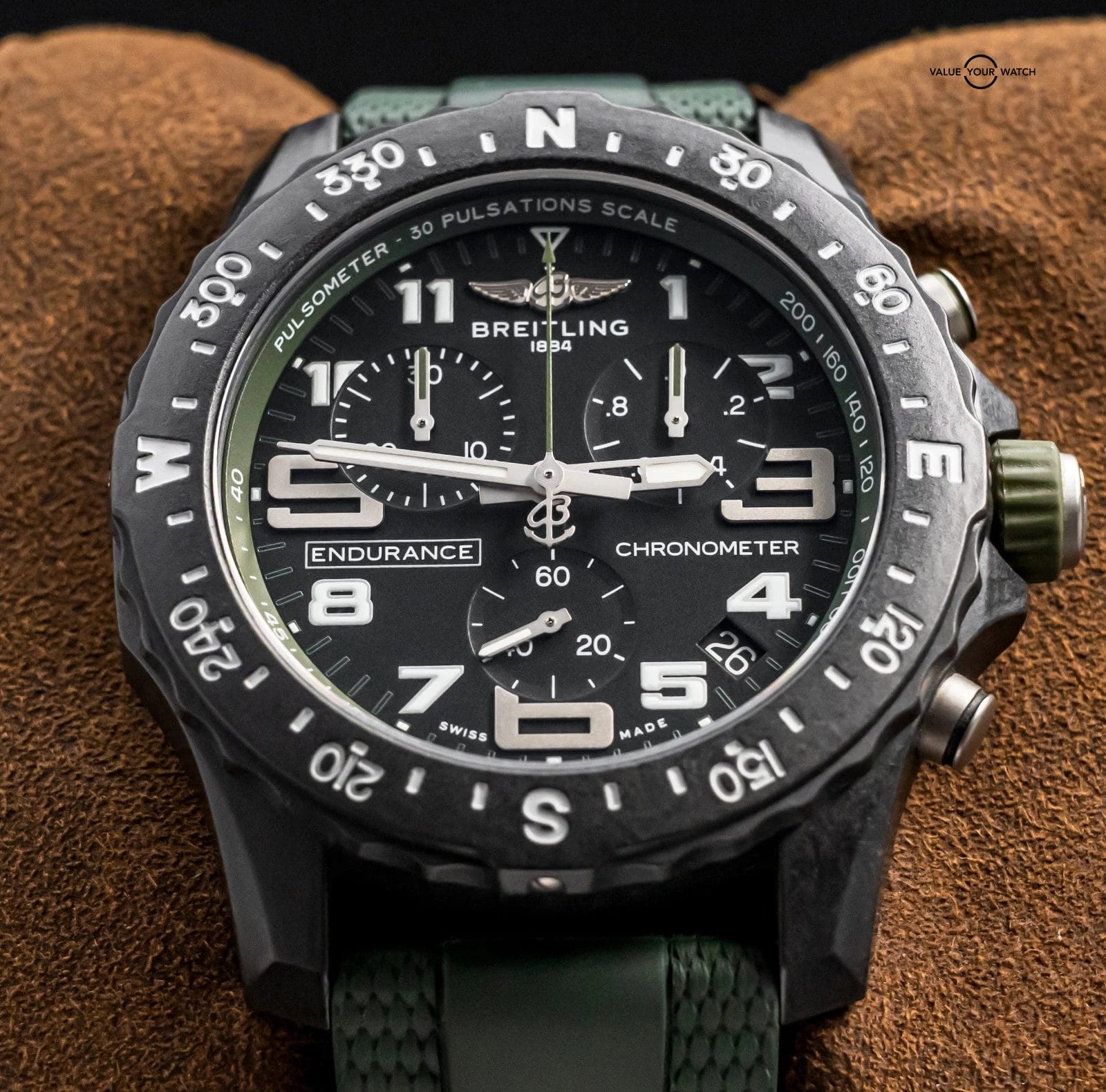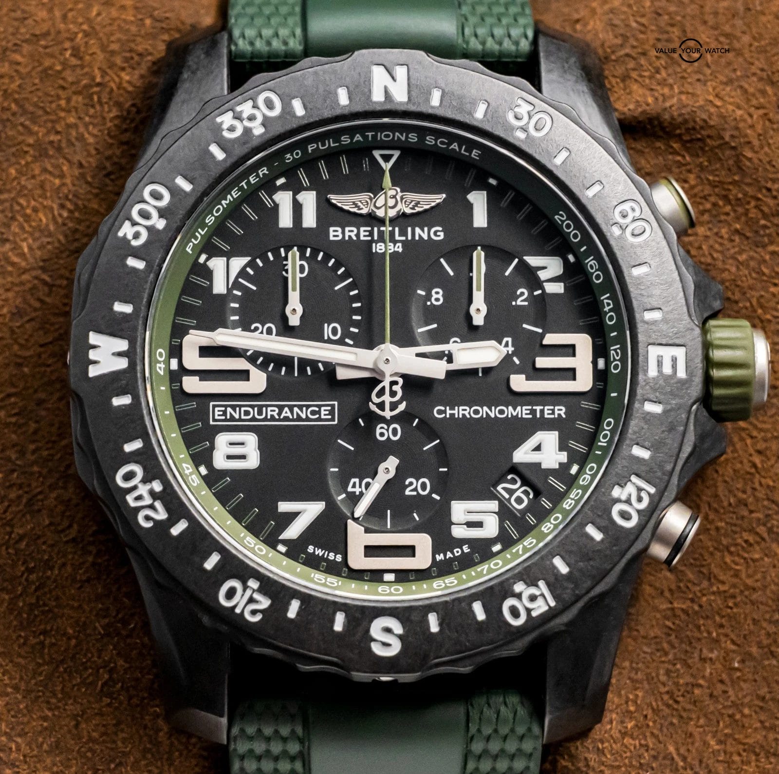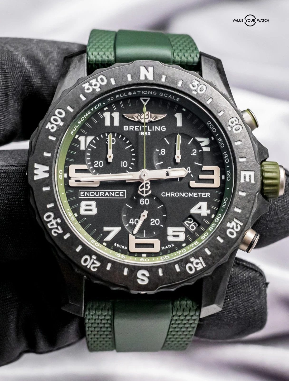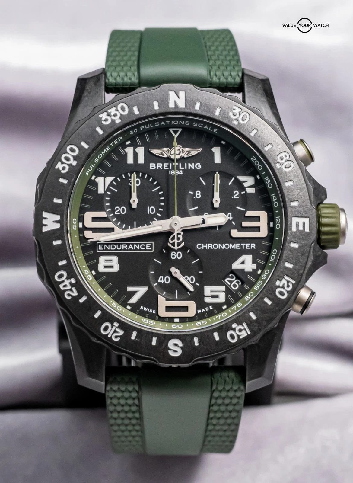 STUNNING Breitling Endurance Pro 44 mm with Black & Green Dial on Green Breitling Rubber & Deploy Clasp! Arrives as watch only and was originally purchased at a Breitling Authorized Dealer in April 2023. It was recently taken on trade by a local client and is powered by the Caliber 82 SuperQuartz Movement, reliable for everyday use and great for versatility. Keep in mind that most Endurances are on Tang, and my client had upgraded this piece to Deploy Clasp for easier use and increased comfort. If I was to personally wear an Endurance, I would immediately upgrade it to the deploy clasp like this one has. A lot of bang for the buck as a solid Breitling Chronometer!