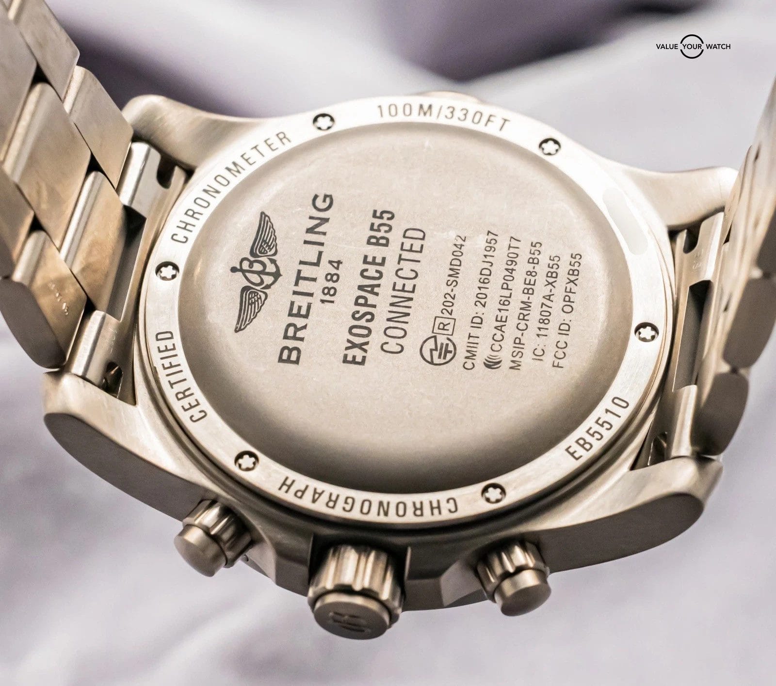 “In creating its first connected chronograph, Breitling places the smartphone in the service of the watch so as to enhance its functionality. The Exospace B55 houses an exclusive caliber equipped with a range of original functions tailor-made for pilots and yachtsman: an electronic tachymeter, a ”countdown/countup“ system, a “chrono flight” and “chrono regatta” device for recording flight and regatta times, respectively, while memorizing departure and arrival times. The user-friendliness of this model is enhanced by the simple and logical control mode, and two ultra-legible LCD screens with backlighting system that can be activated by pressing the crown or tilting the wrist. This futuristic, high-tech innovation features a titanium case with rider-tab bezel as well as a sturdy, sporty strap.”