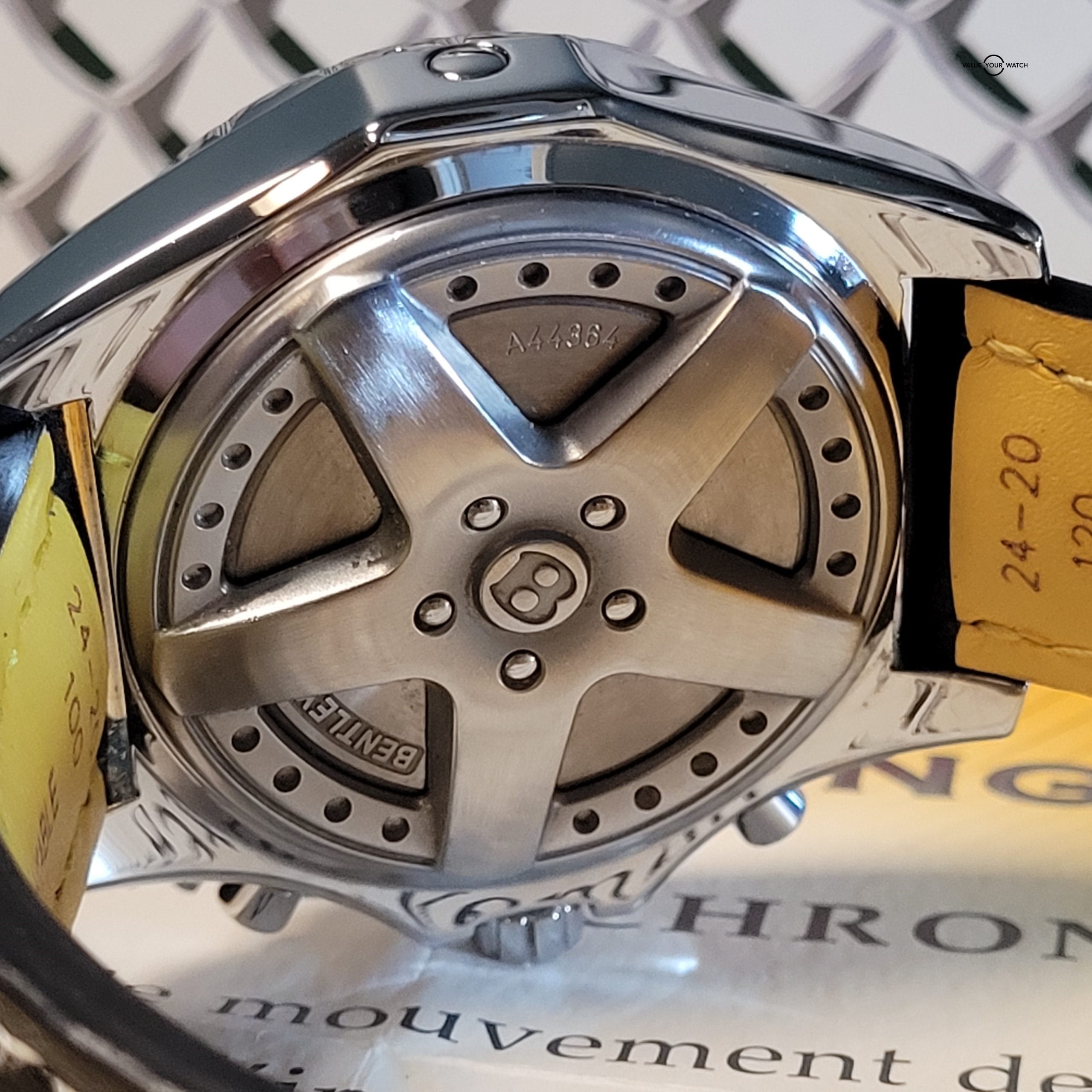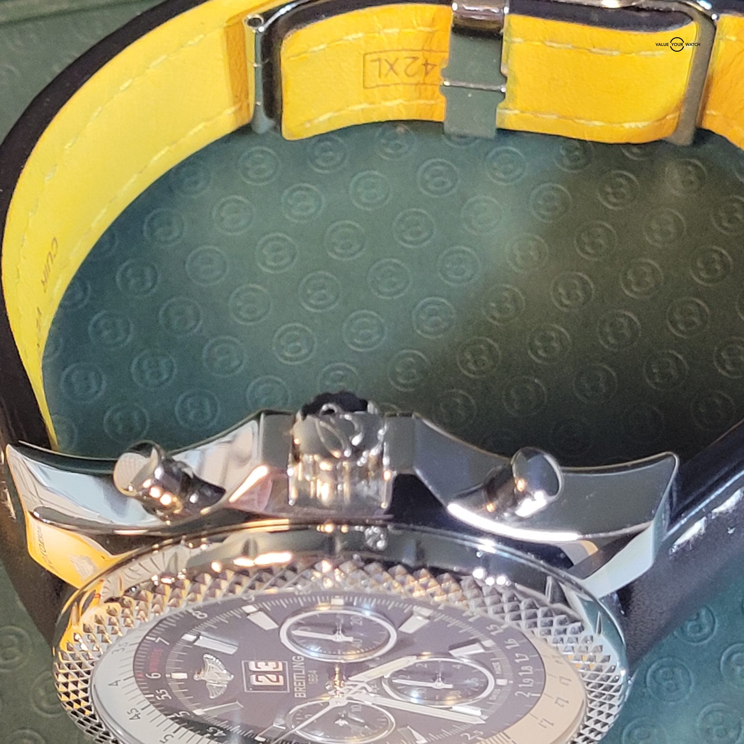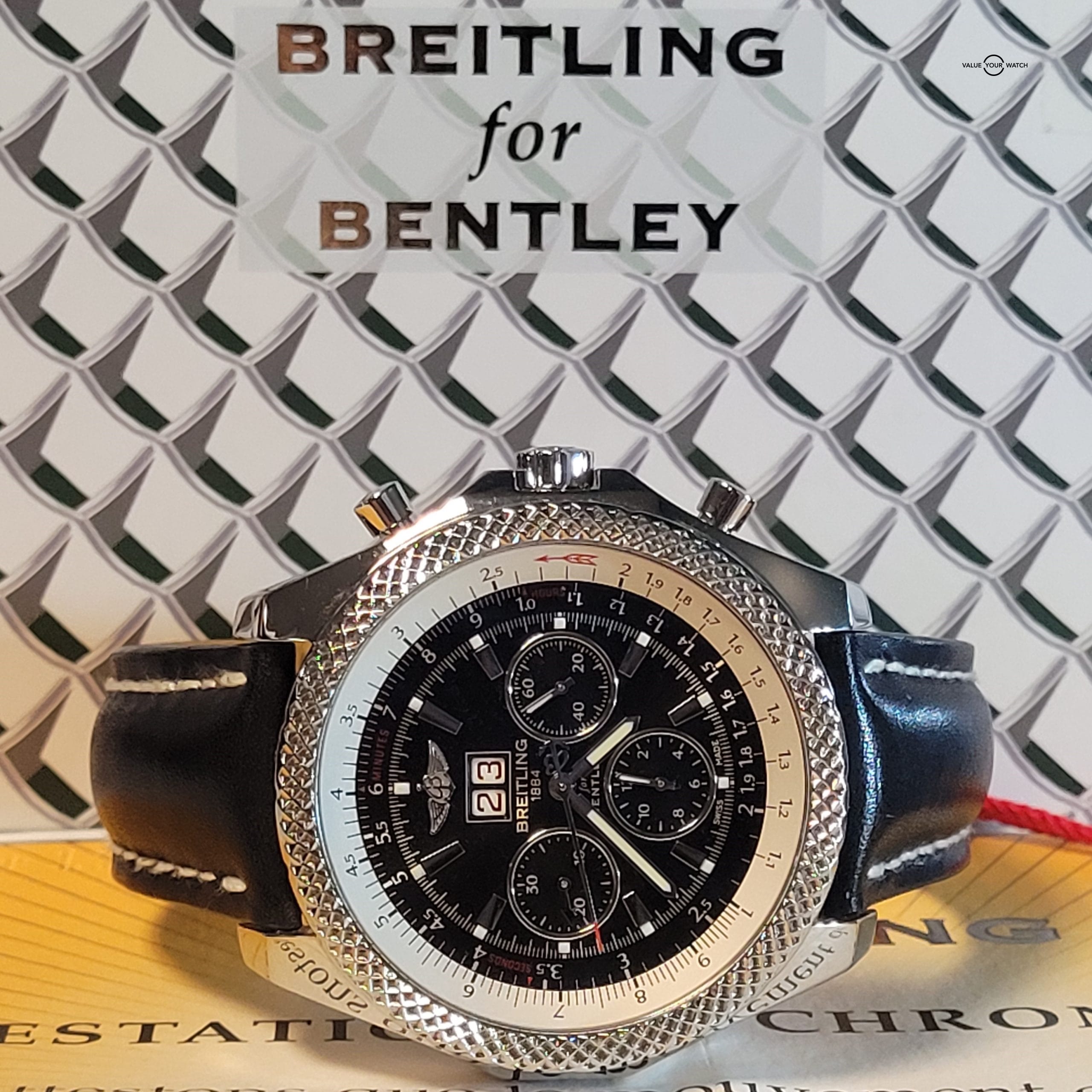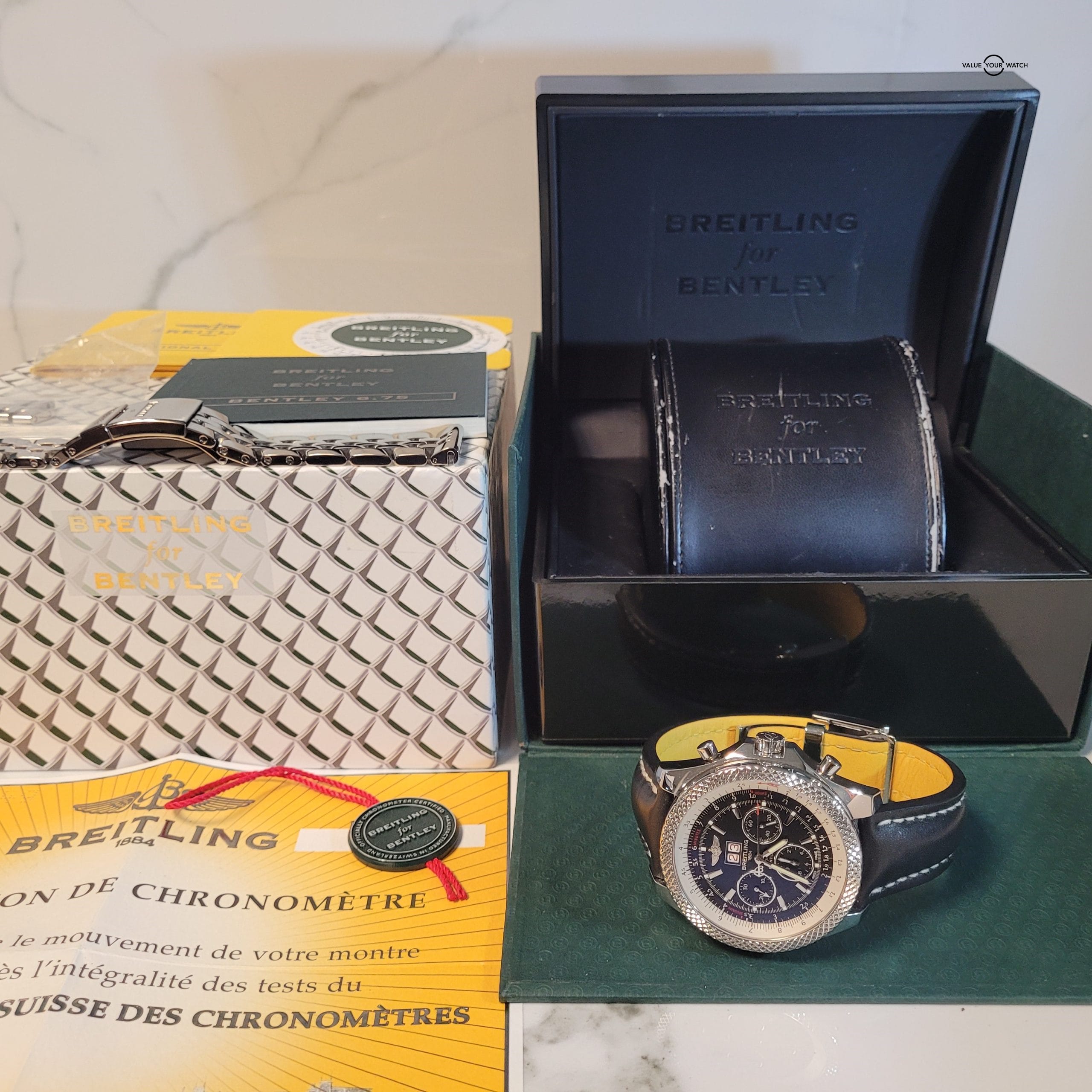 This stunning Breitling for Bentley-A44364, 49mm comes freshly serviced from Breitling with replacements of a new black dial with hour markers and luminous hands. It can be worn on the new Breitling leather strap or the polished full steel bracelet. It comes with an outer and inner box, warranty booklet, manual, certificate of authenticity, extra link, and hang tag