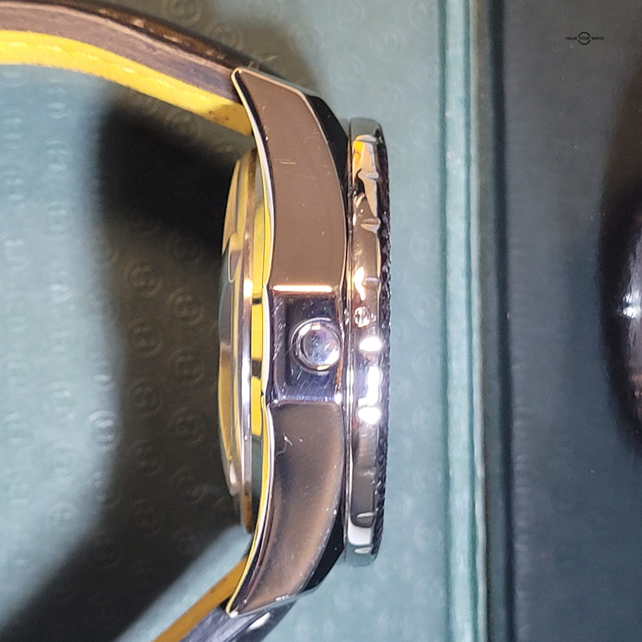It is in great condition with fee signs of wear. It has an automatic self-winding officially certified chronometer movement with three chronograph sub-dials displaying: 60 seconds, 30 minutes, and 12 hours. The movement has a power reserve of 42 hours. The stainless-steel bidirectional bezel encompasses the screw locked crown and scratch resistant sapphire crystal. The bracelet and leather deployment clasp band fits up to an 8 1/4″ wrist. It is water resistant up to 100m.
