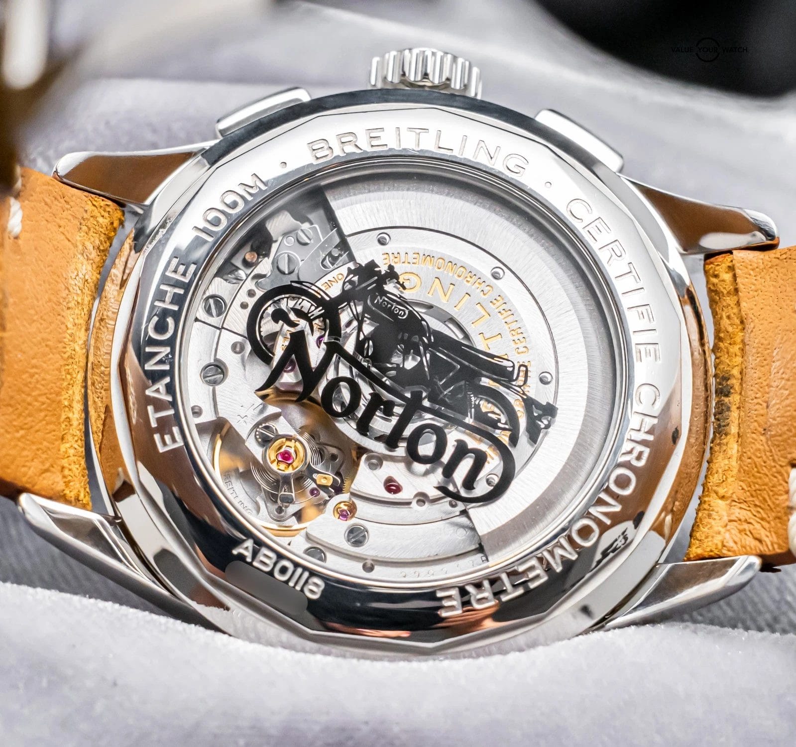 “The Breitling Premier B01 Chronograph 42 Norton Edition celebrates Breitling’s partnership with epic British motorcycle manufacturer, Norton. Cool, charismatic and contoured, this chronograph reflects the innovative and adventurous streak in both brands. The distinctive Norton logo is engraved on a plate on the left side of the case, and the transparent caseback features an inscription of the Norton motorcycle and logo.”