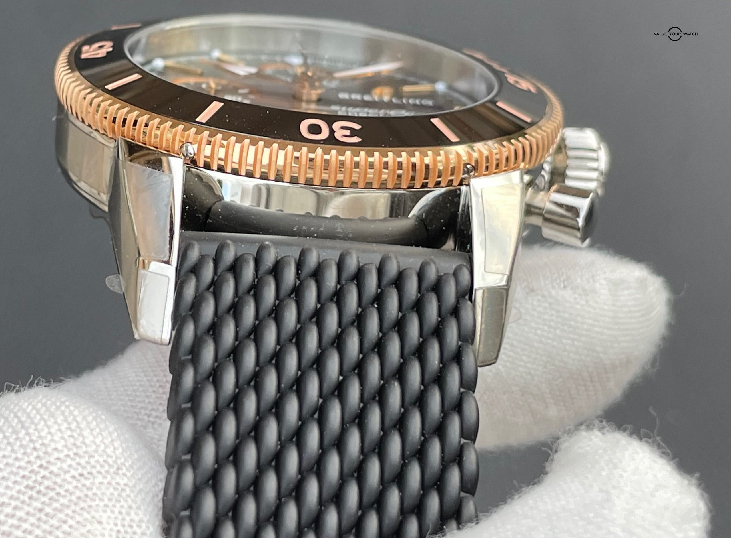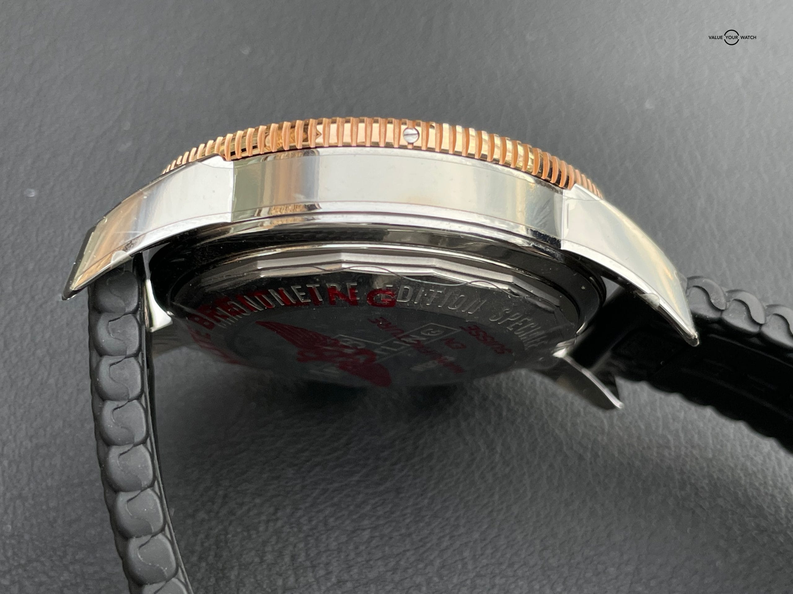 This beautiful piece is an amazing combination of stainless steel and 18K red gold with a black dial. Still new in the box, it still has protective plastic stickers on the back and the lugs of the watch. Comes with a box, card/booklets, hang tag and watch. The band has been sized for a 7” wrist by the AD but a new un-sized strap is included as well so you can have it custom sized as needed. Still has protective plastic on case, buckle has very light hairline wear from handling that will polish out if the owner wishes to do so.