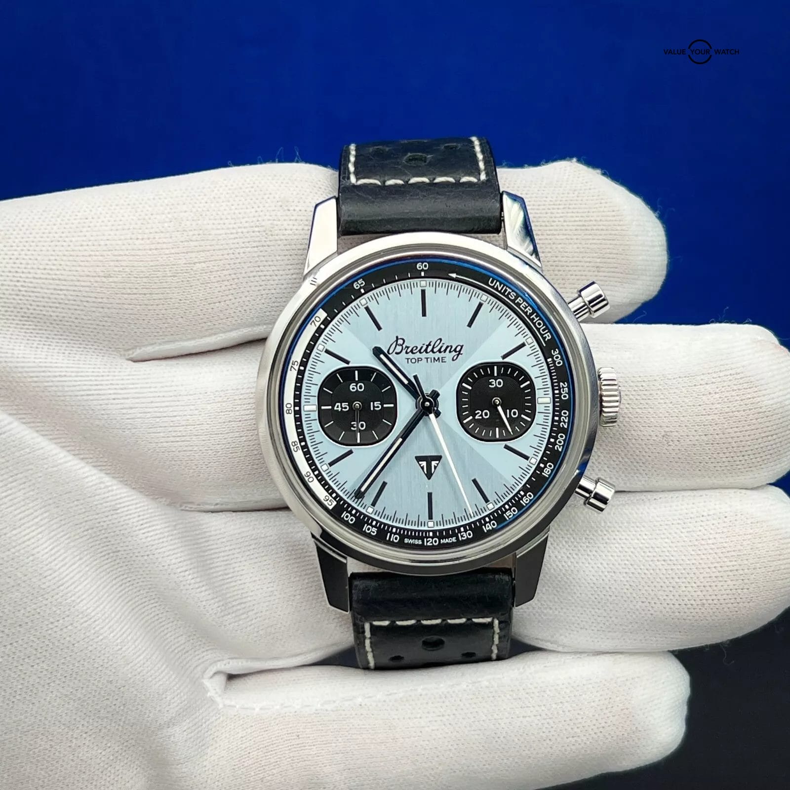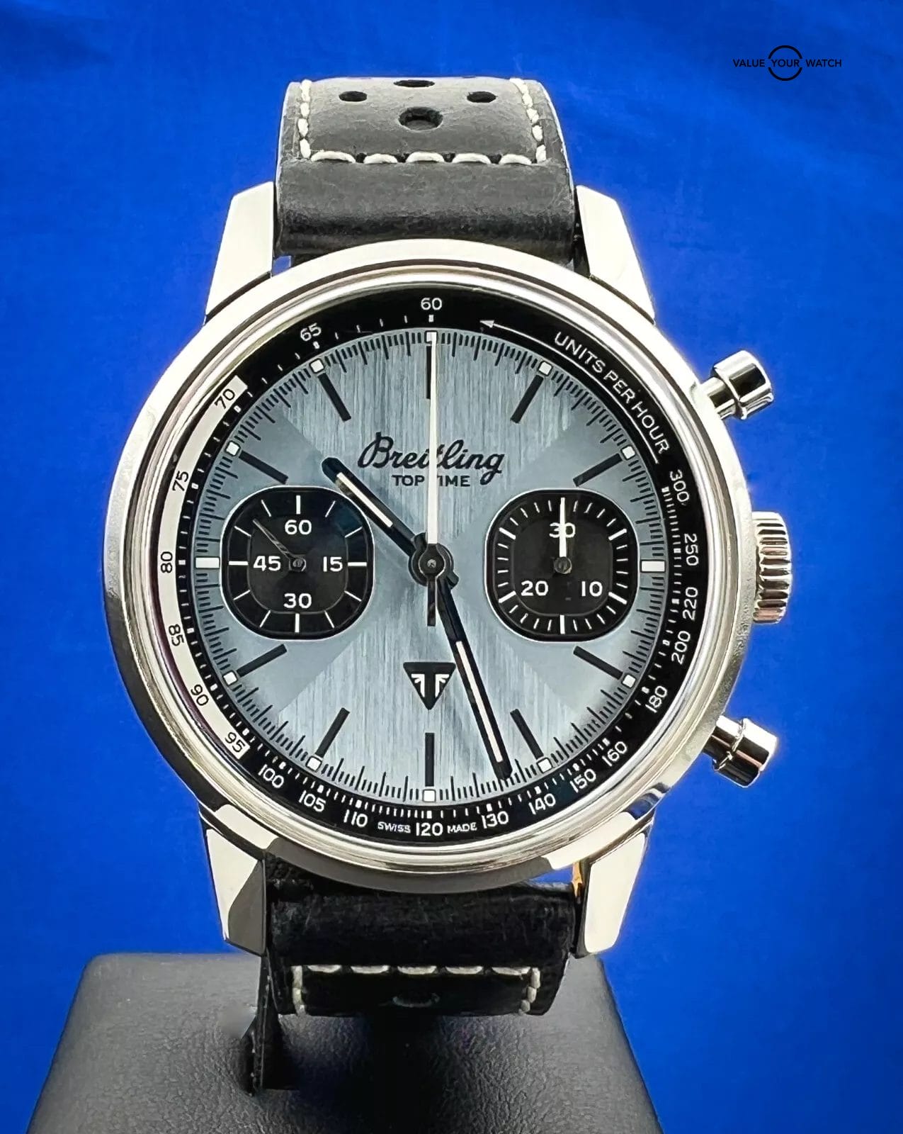 The stunning Breitling “Top Time Triumph” Ice Blue A23311121C1X1 men’s watch that boasts a smooth silver bezel, linen dial pattern, and baton indexes. The watch is Swiss made and has a 27-jewel mechanical movement that is self-winding with a power reserve indicator, making it incredibly reliable.