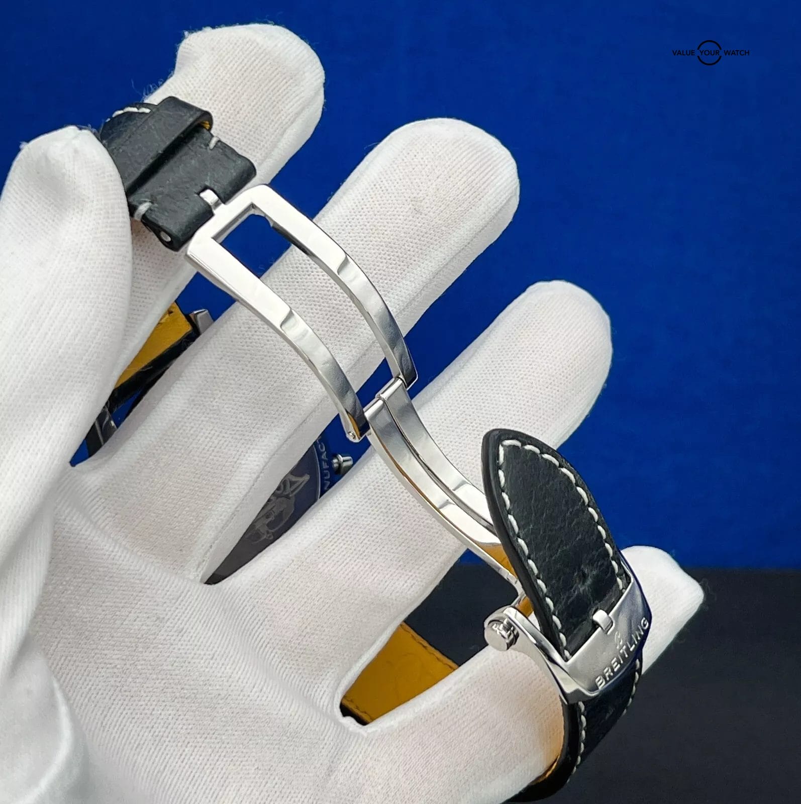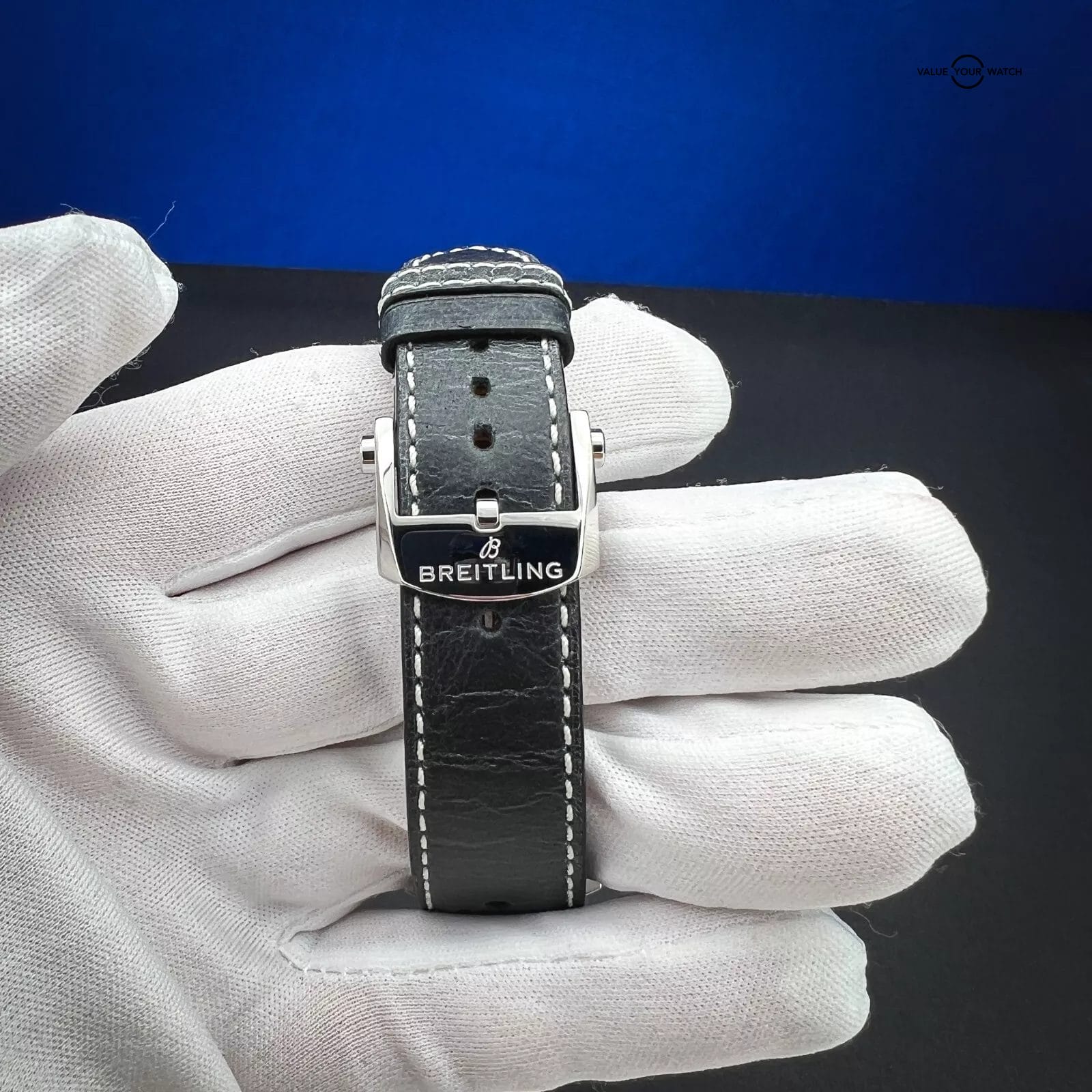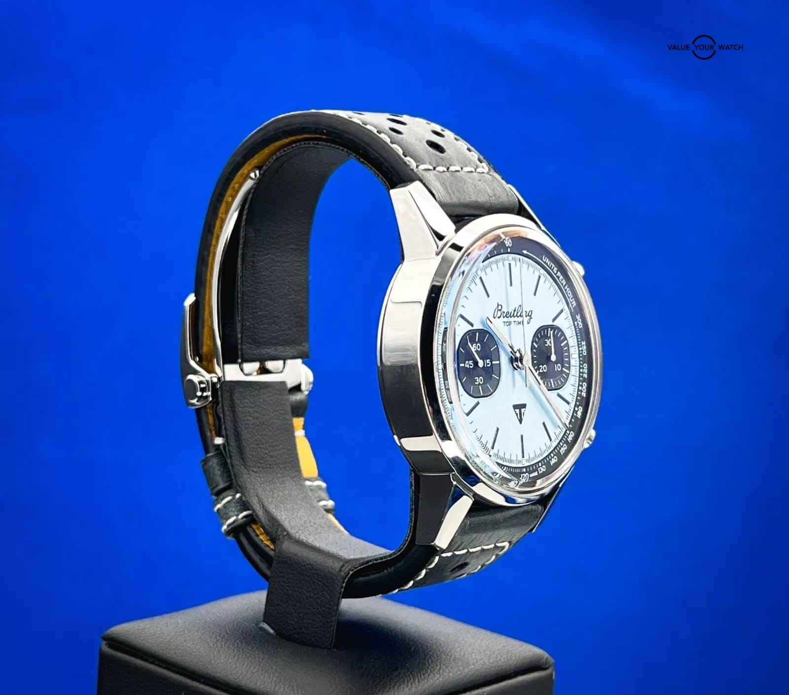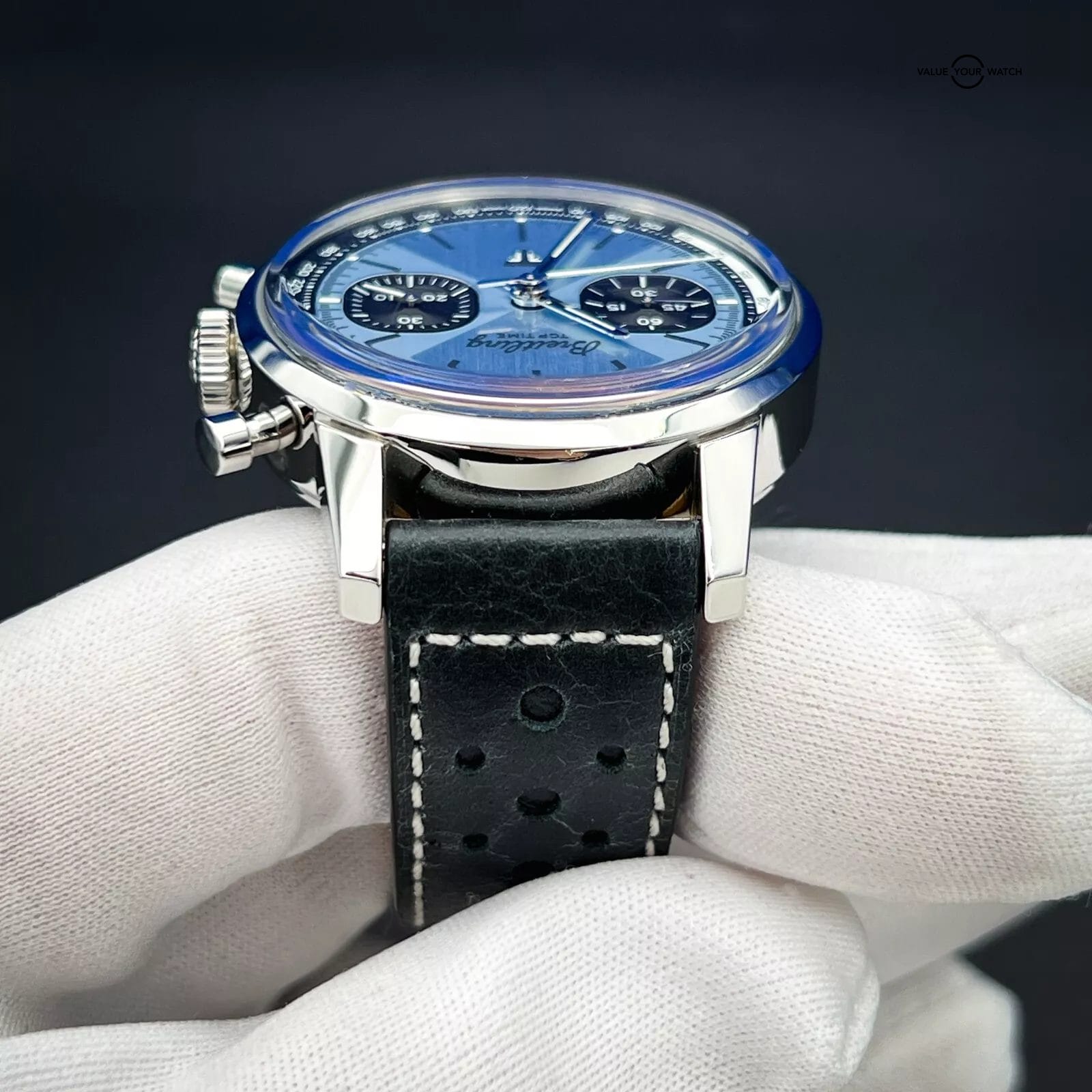 It features a 12-hour dial, sapphire crystal, push/pull crown, and chronograph function, all housed in a 41mm stainless steel case with a solid caseback. The two-piece black leather strap with a fold clasp closure completes the classic yet modern look of this watch. With water resistance of up to 30 meters (3 ATM), this Breitling is perfect for any occasion. The ice blue dial is stunning to say the least.