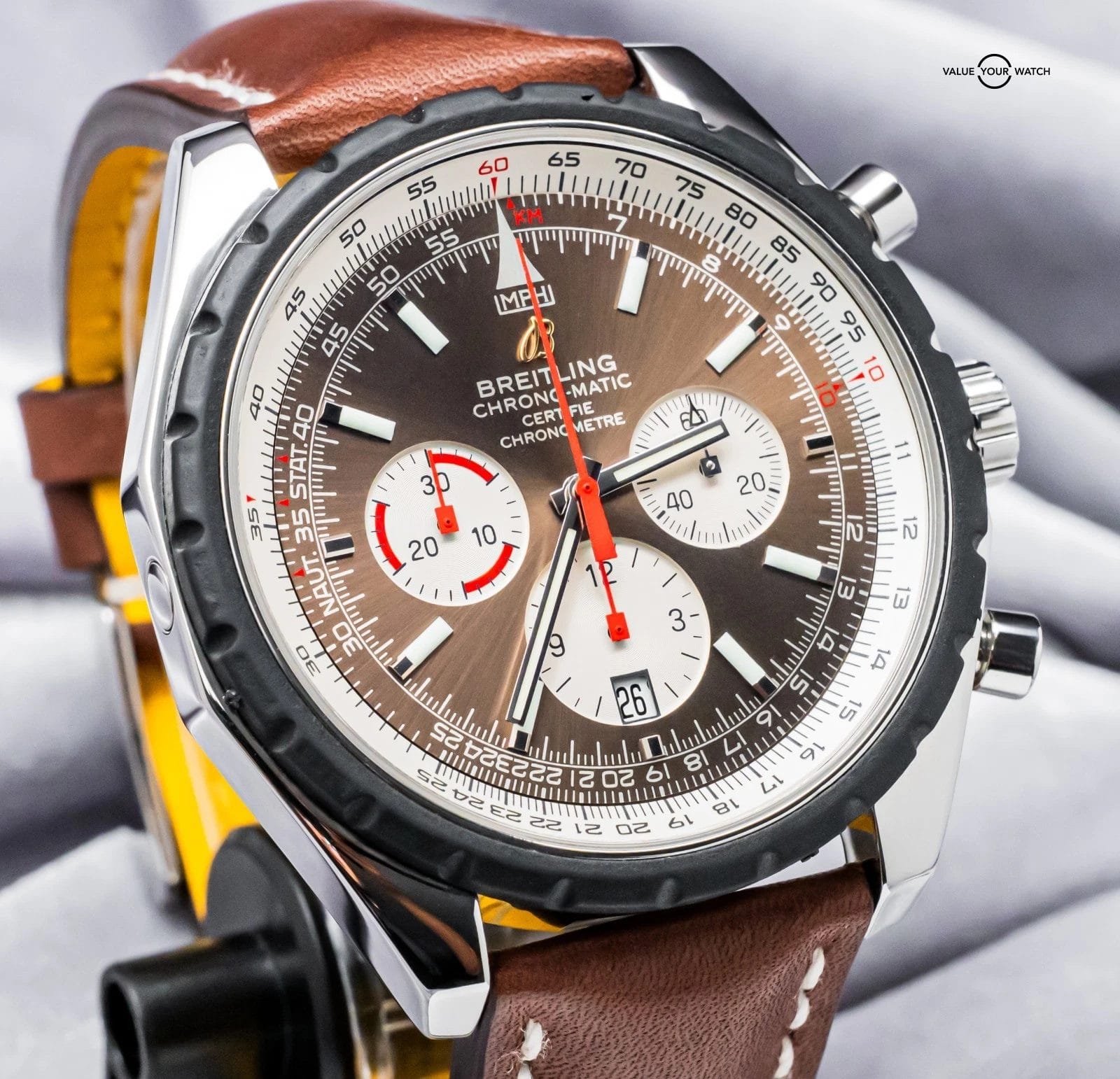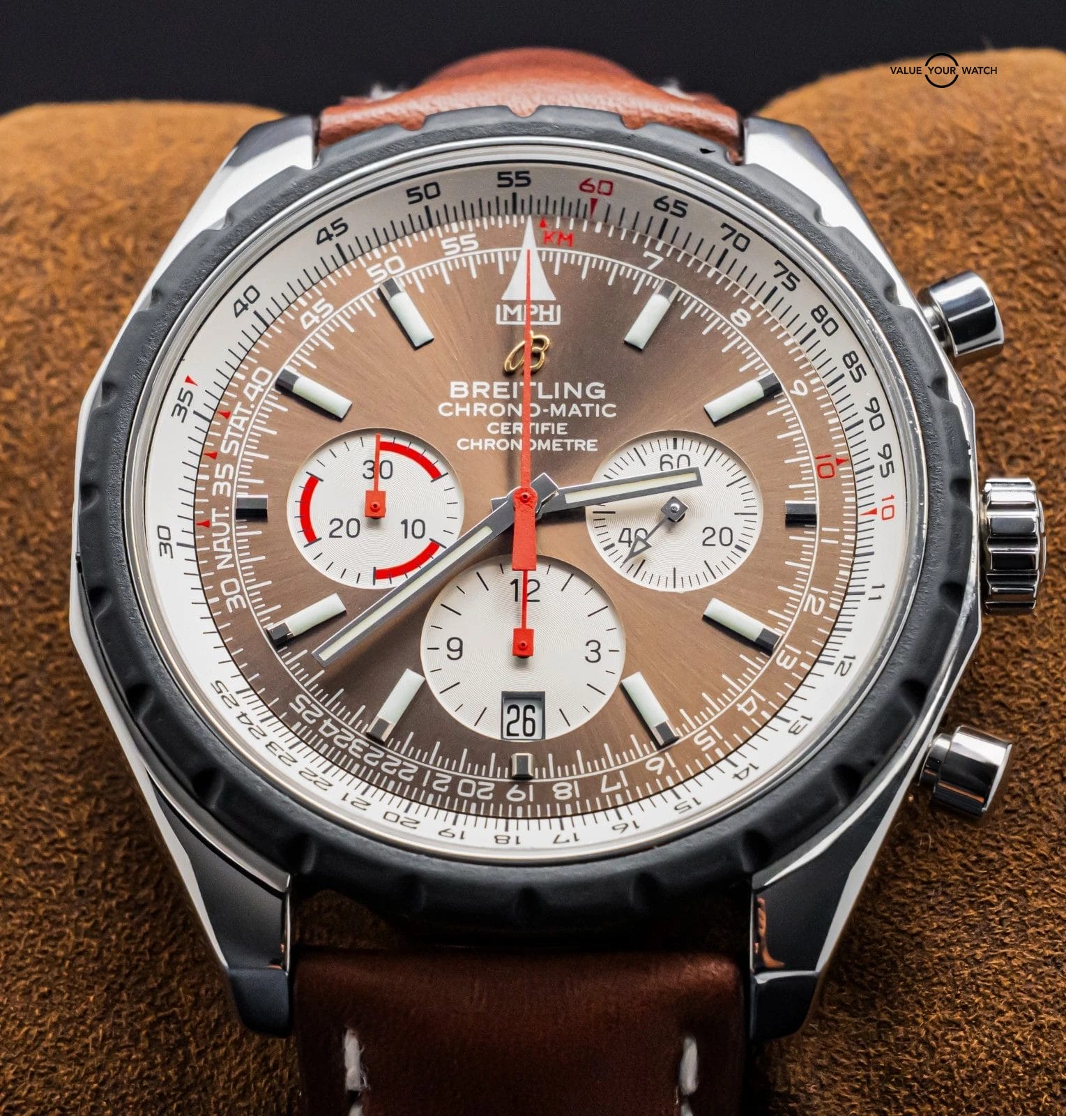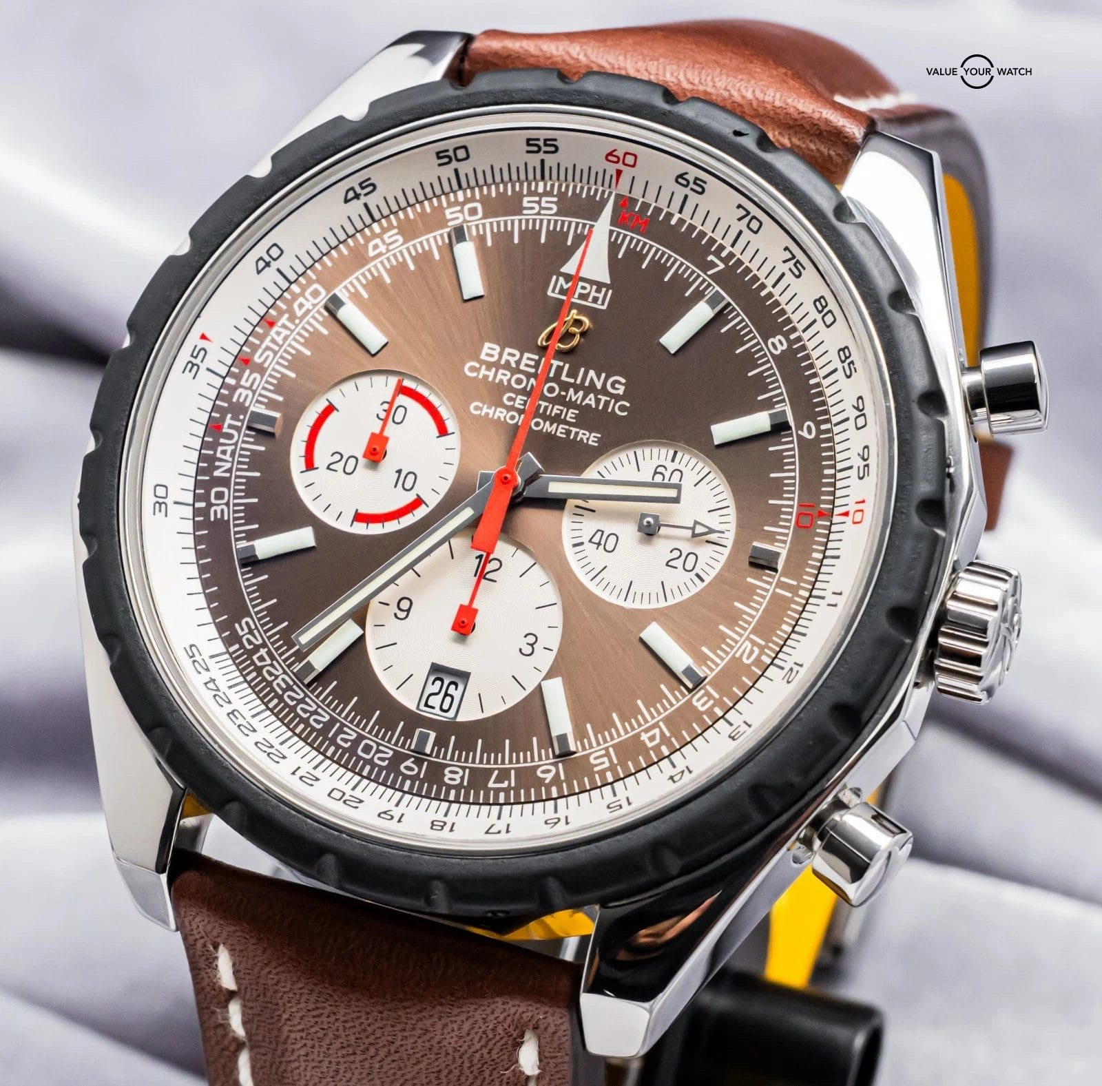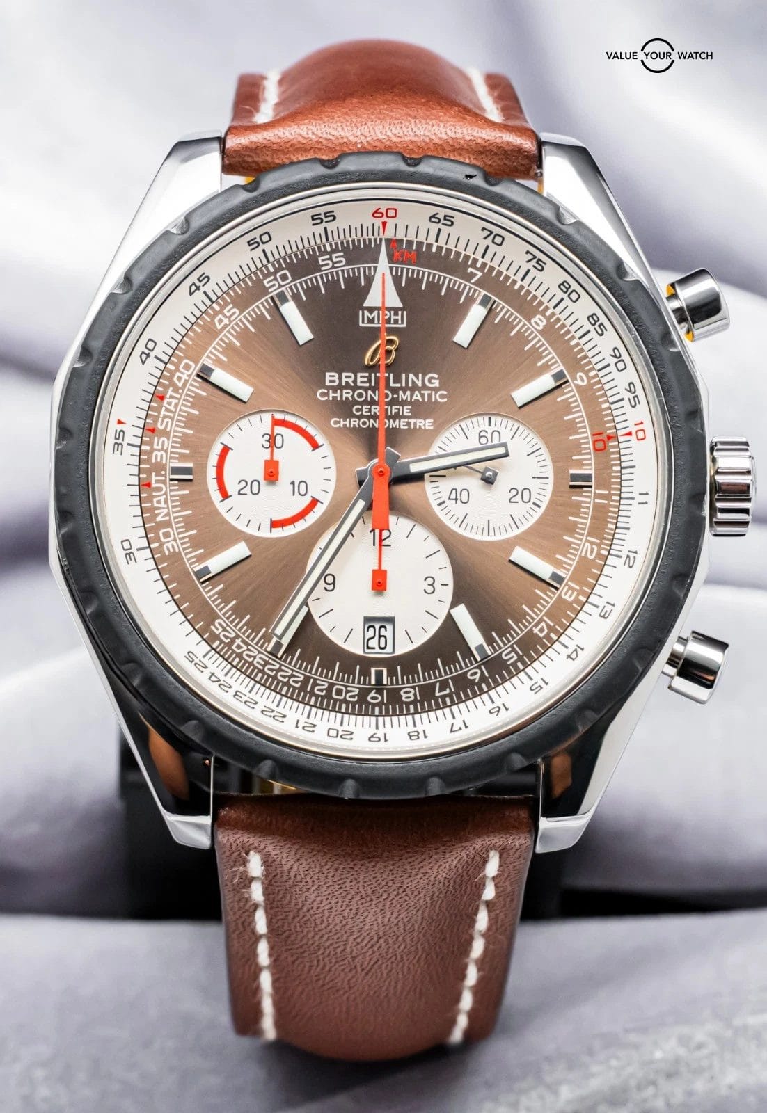STRIKING Breitling Chrono-Matic 49 mm with Brown Dial on BRAND NEW UNWORN Brown Breitling Leather! Arrives with original Breitling boxes and is a relatively rare piece to find with the Brown Dial; as we list, it is the only one for sale in the country. This piece was FULLY SERVICED at Breitling in November 2025, a huge value-add. Have peace of mind, this piece is WARRANTIED through Breitling until November 2026!