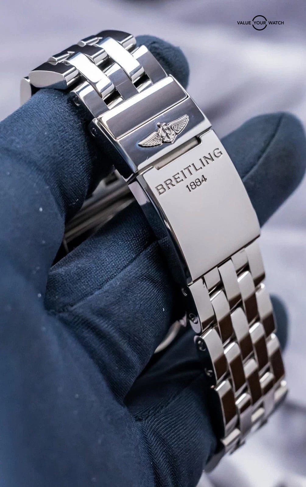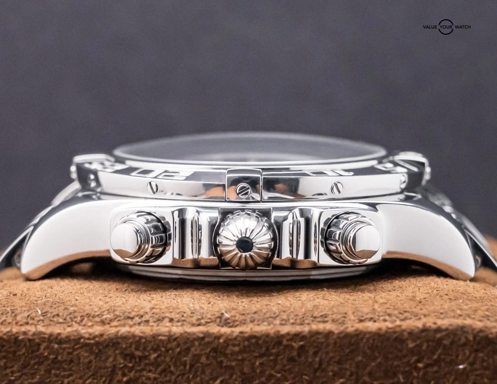 STUNNING Breitling Chronomat 44 B01 with Black Roman Numeral Dial on Stainless Steel Pilot Bracelet! Arrives with original Breitling boxes and was FULLY SERVICED in April 2025, a very nice value-add. This particular Chronomat 44’s finish is fully polished throughout the case, bezel, and bracelet, giving it that quintessential Breitling look. Powered by the In-House B01 Movement!