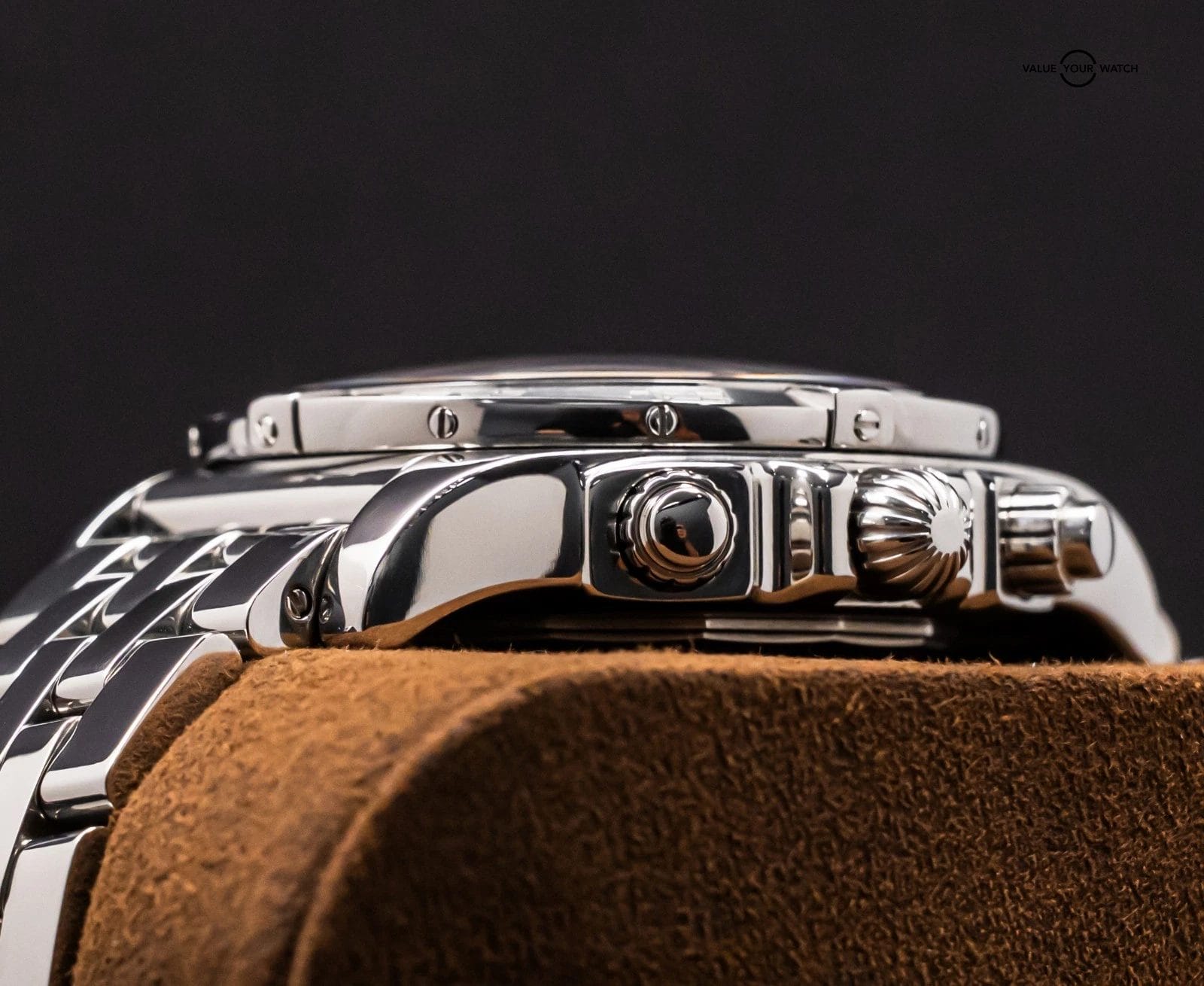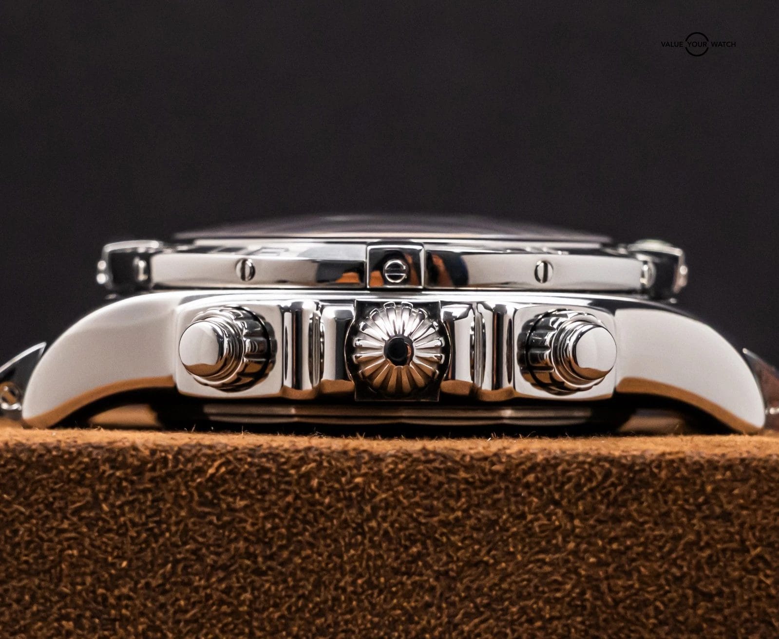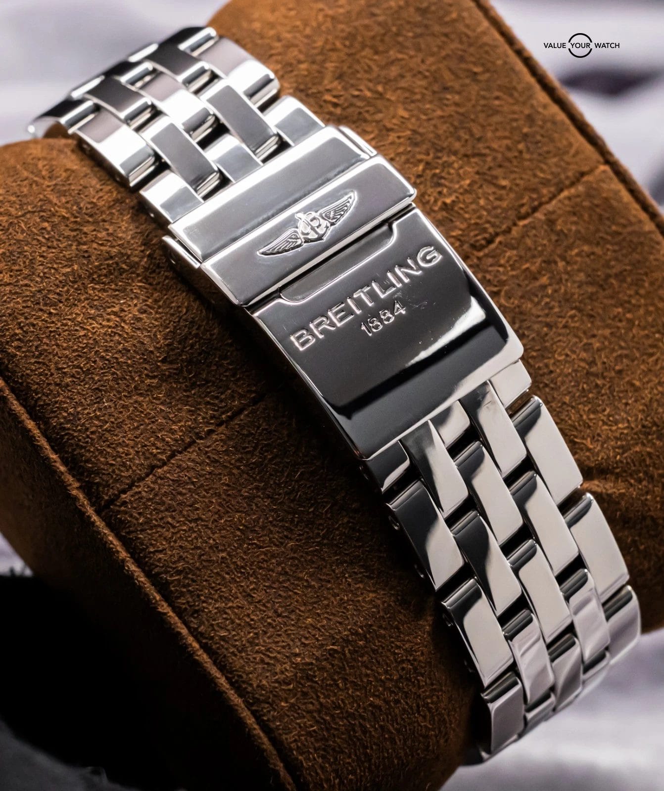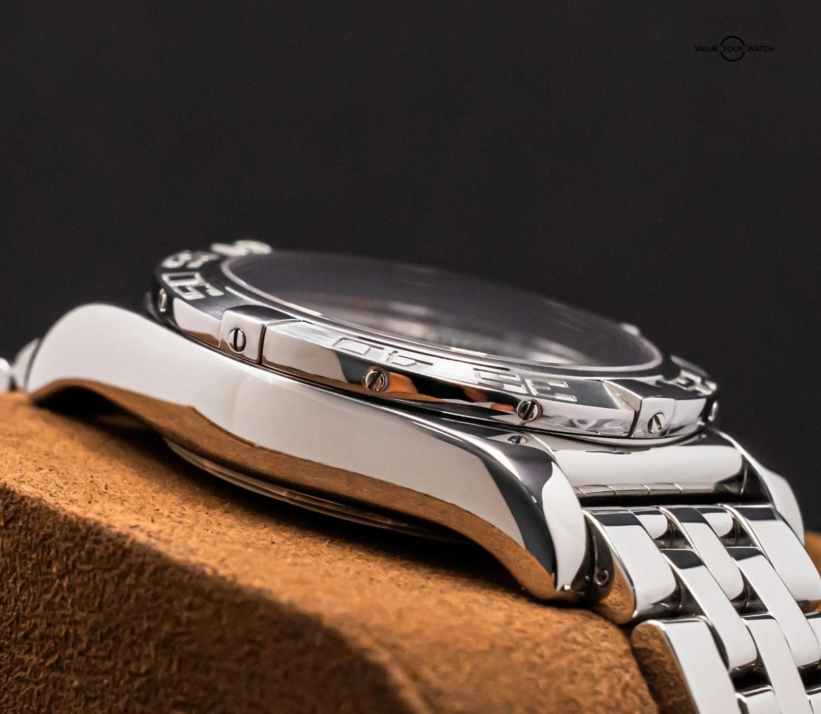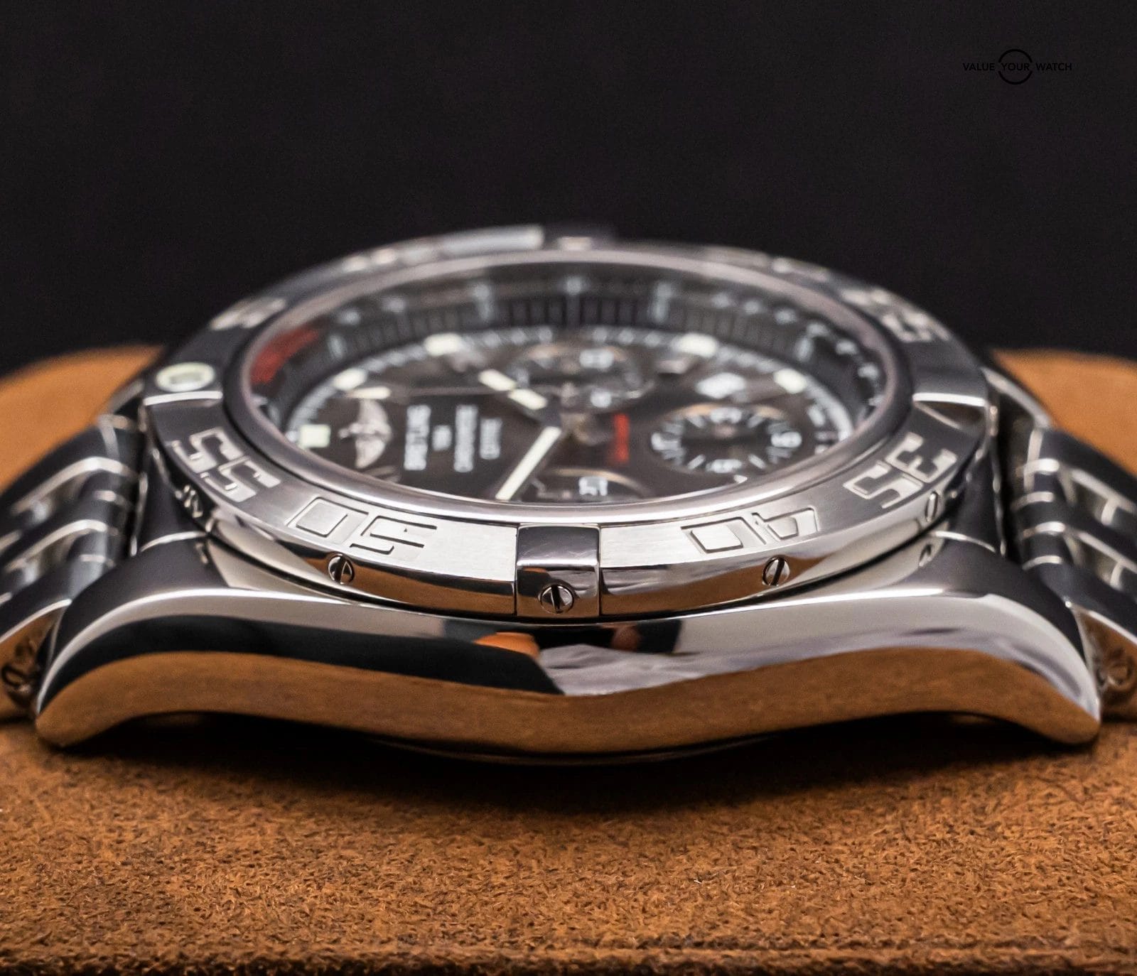STRIKING Breitling Chronomat 44 with Tungsten Gray Dial on Stainless Steel Pilot Bracelet! Comes with the original Breitling boxes and was SERVICED at my watchmaker in November 2025, a huge value-add. The dial is commonly referred to as black, but I think it’s a mix between black & gray, being slightly darker than gray, but certainly not as light as the blackeye gray dial. Sometimes, they are even referred to as dark grey dials or “carbon black” dials, flip a coin on whether it’s black or dark gray. I think “Tungsten Gray” is the closest. These are very hard to find, not common at all. I like them because of the duality in the dials and how unique they are!