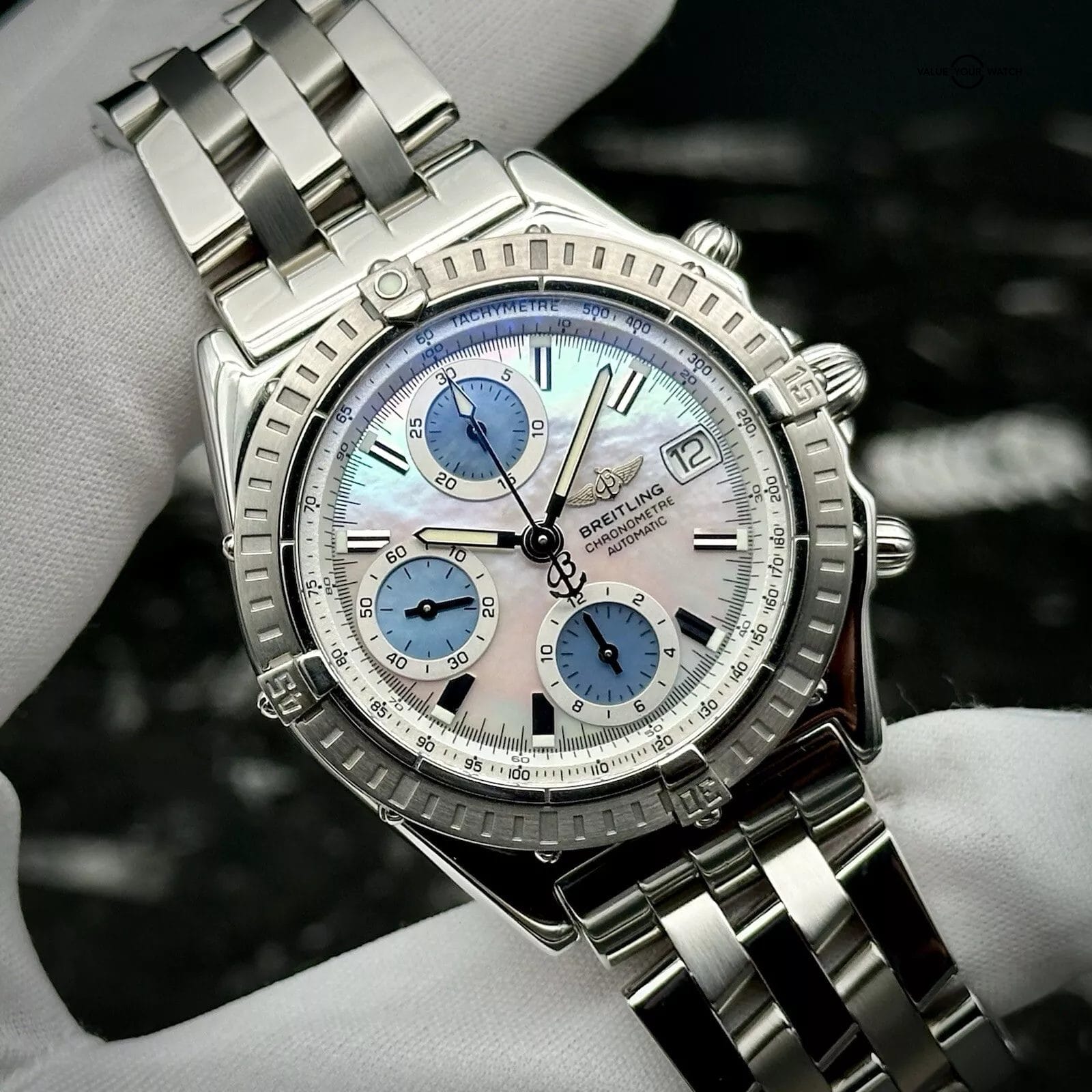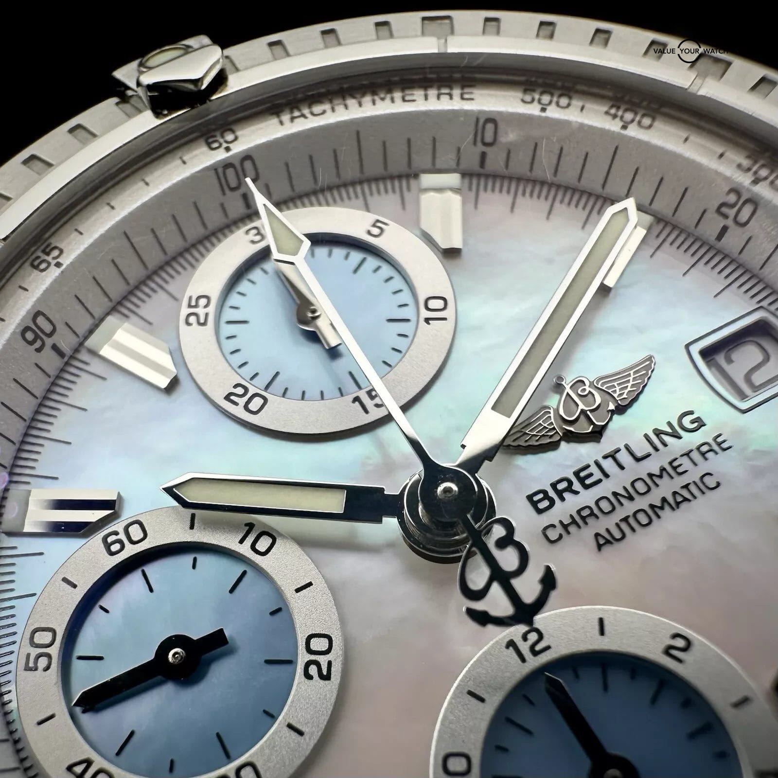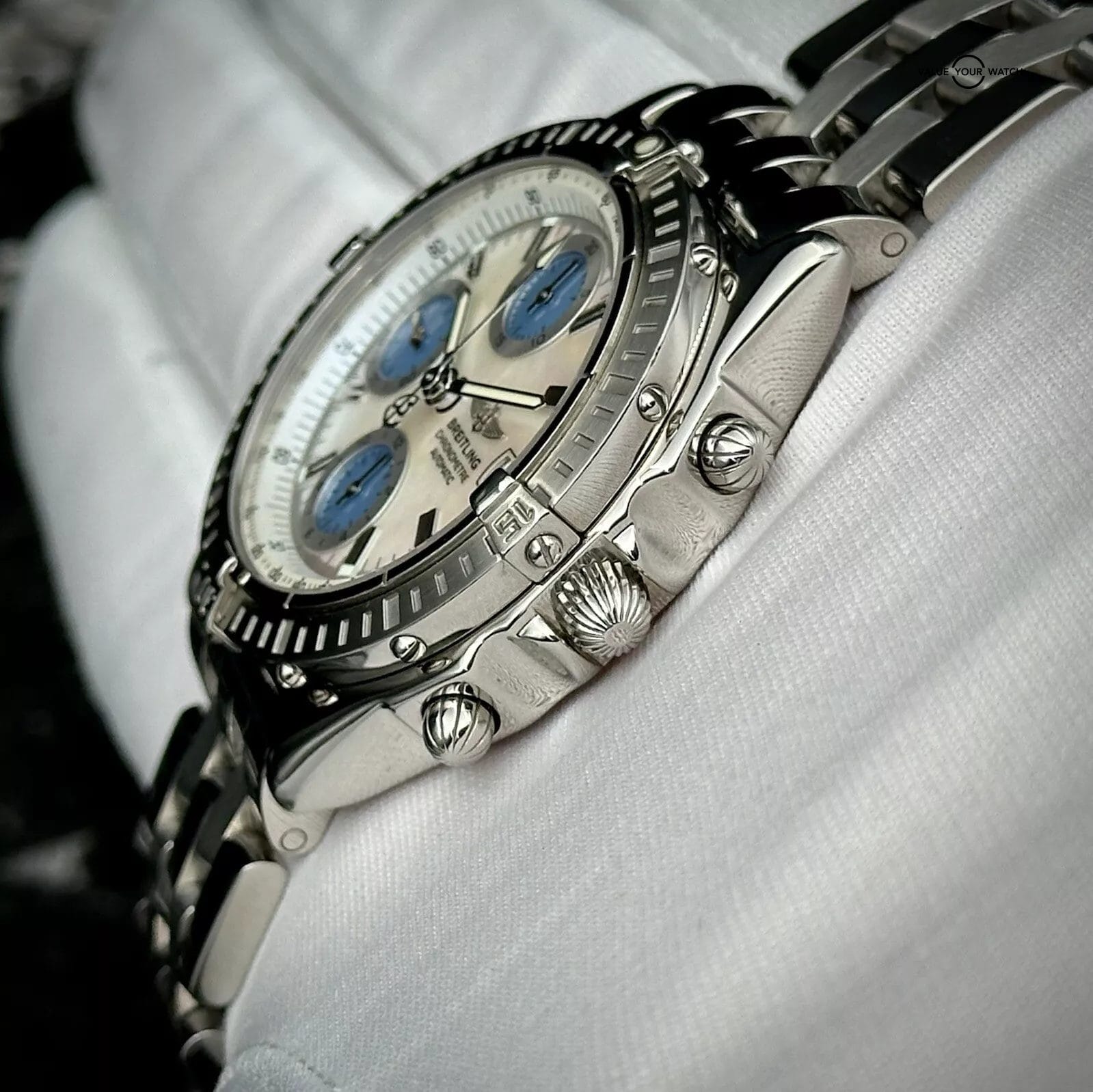 If you’re looking for a rare and unique piece at a very reasonable price, this is a great option. It’s a limited edition run of 300 watches made exclusively for the Japanese market. This one is the only example currently available outside of Japan. In the shade it has a textured white dial with blue subdials, but in the sunlight the mother or pearl turns into a bright pop of color on your wrist.