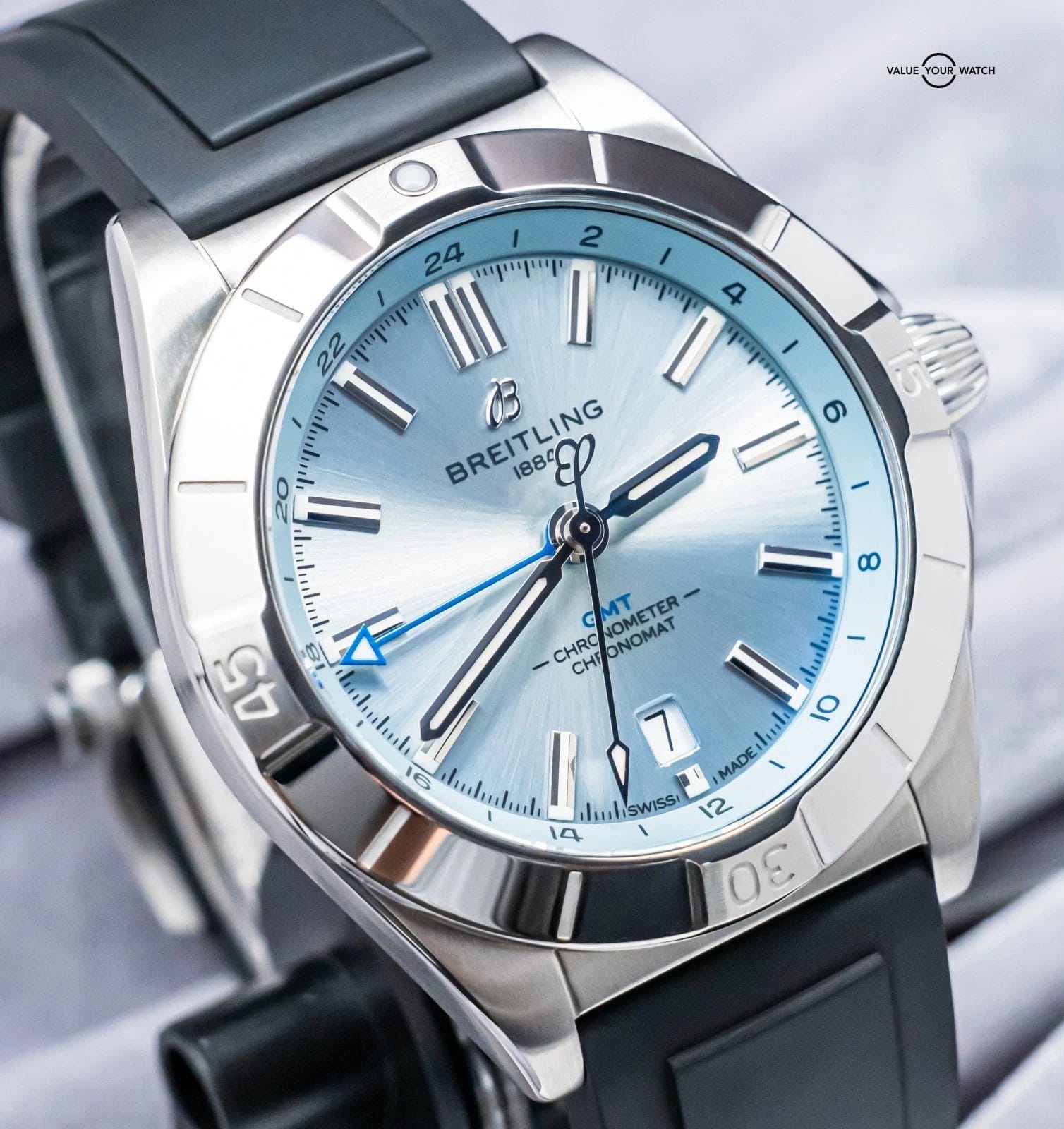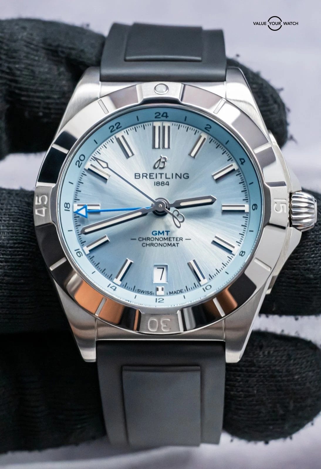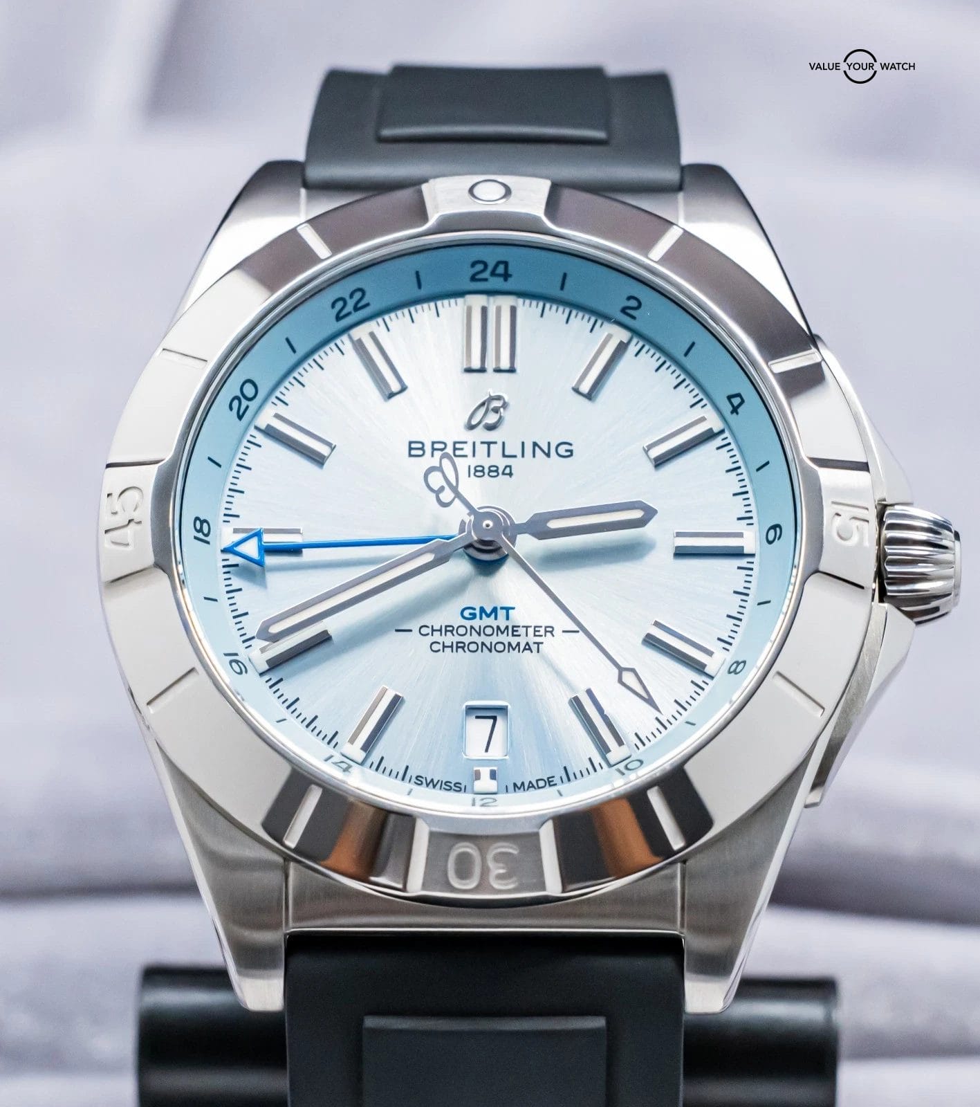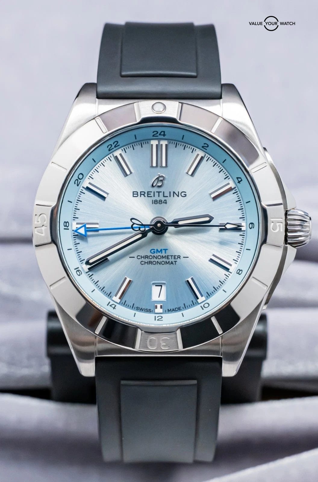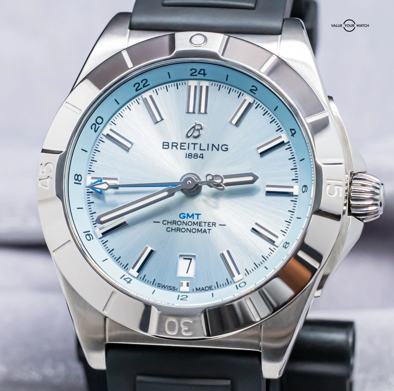 STUNNING Breitling Chronomat Automatic GMT 40 mm in Stainless Steel with Platinum Bezel and Ice Blue Dial on Black Breitling Rubber Strap & Deploy Clasp! Arrives as a complete set with original Breitling boxes & papers including the international warranty card. Originally purchased from a Breitling Authorized Dealer in February 2024 and is WARRANTIED through Breitling until February 2026, a huge value-add!