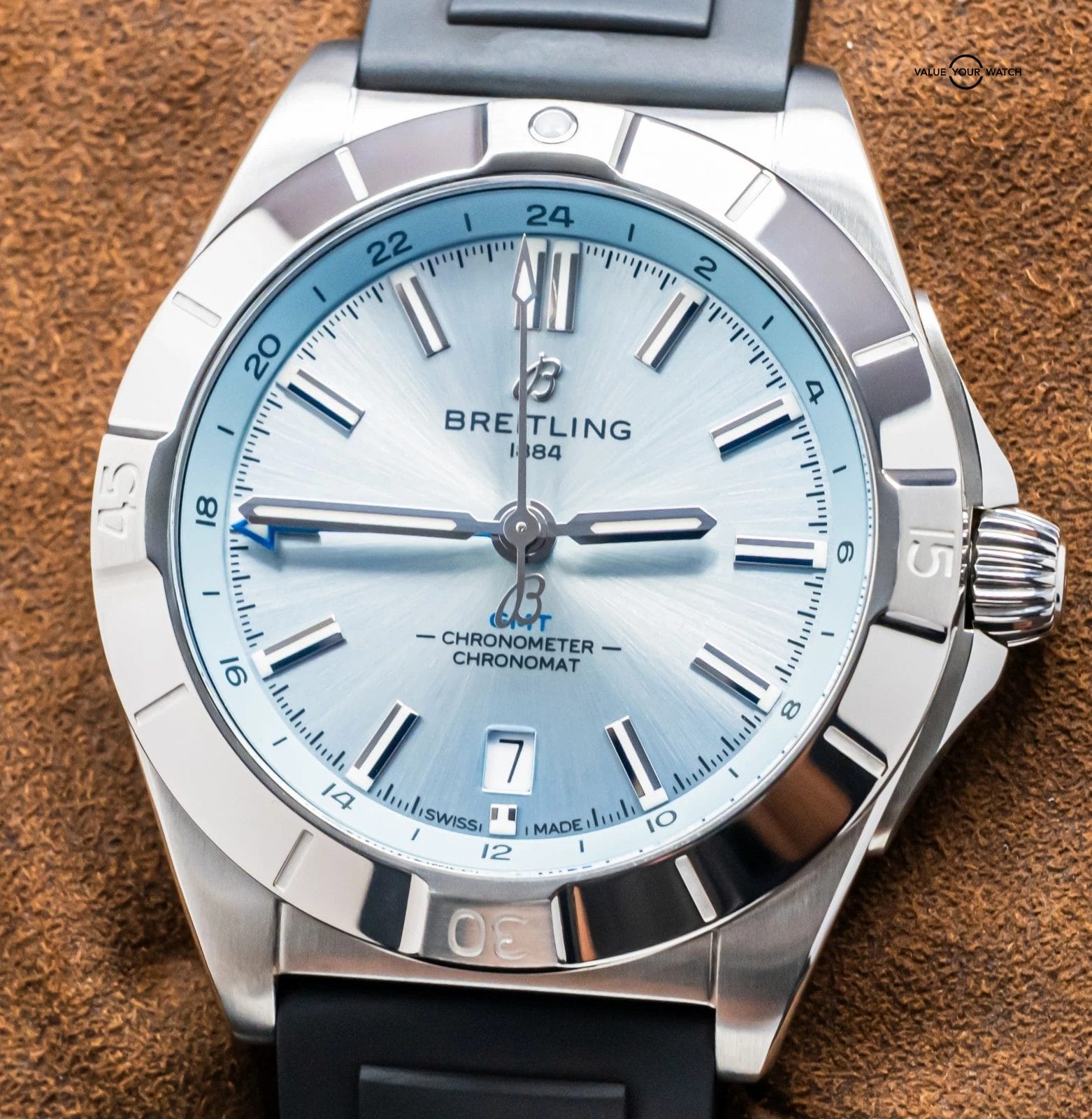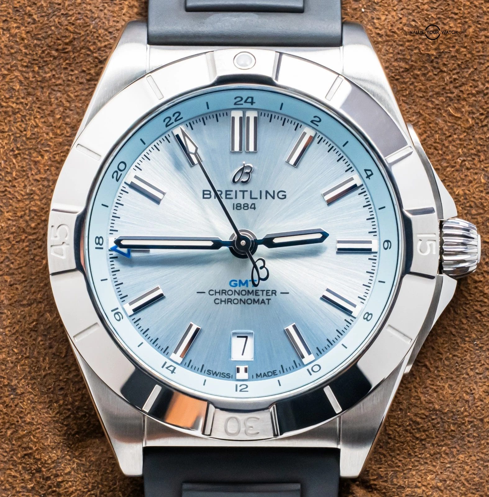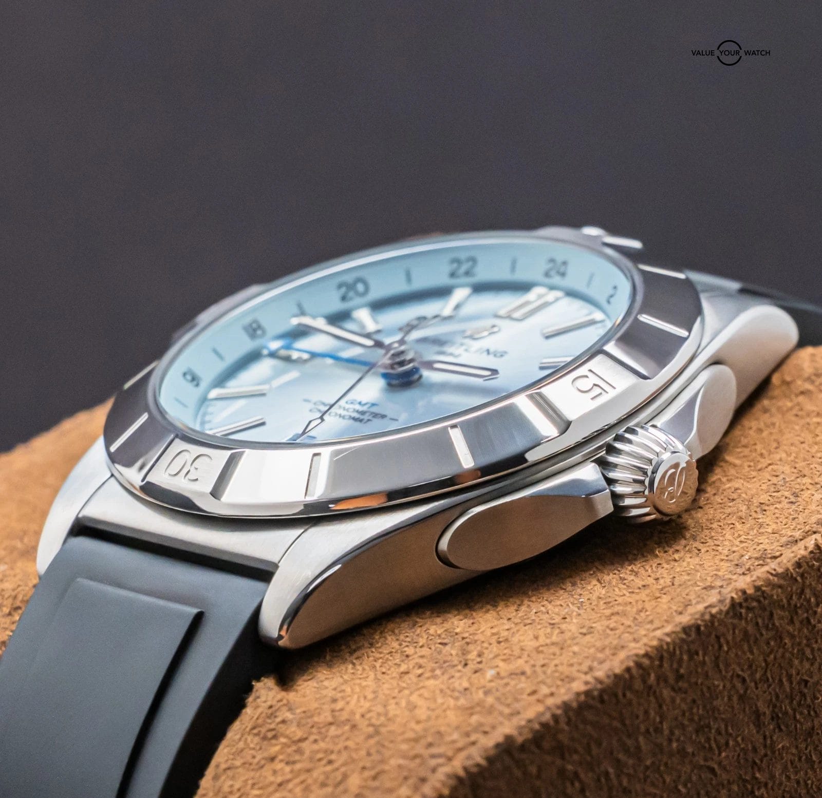 The watch is in a great condition with only very minor wear, nothing notable. Keeping great time when tested on our timegrapher! Do excuse dust/lint in the pictures from the photography process. This model has only been out for a few years; there are very few on the secondary market, and even with our heavy specialty in Breitling, this is the first Chronomat Automatic GMT 40 we have owned with the Ice Blue. Super clean look and a very versatile all around piece, tons of bang for your buck with the Chronomat Automatic GMT 40!
