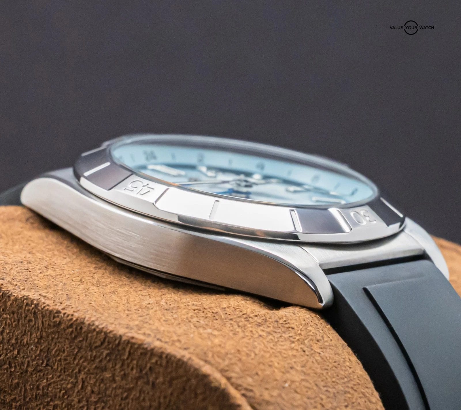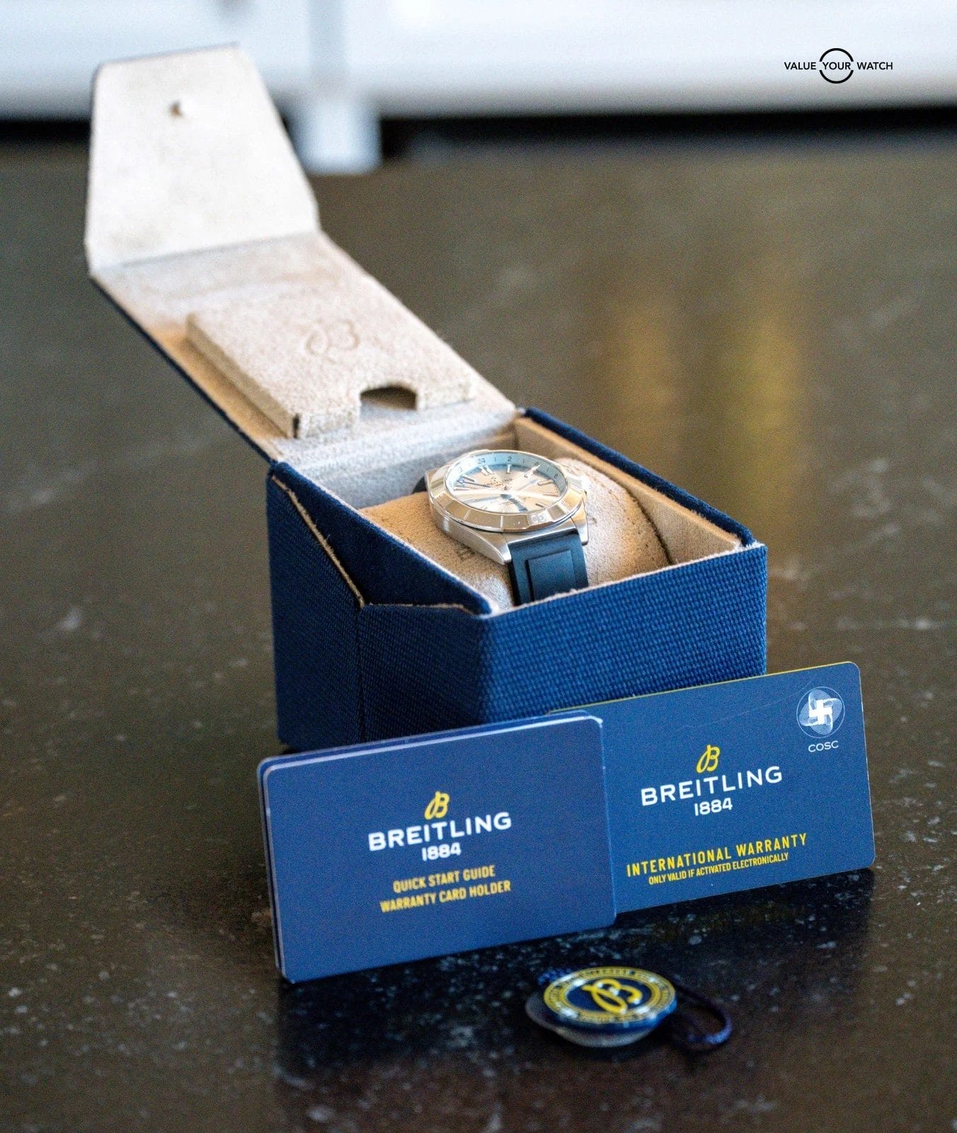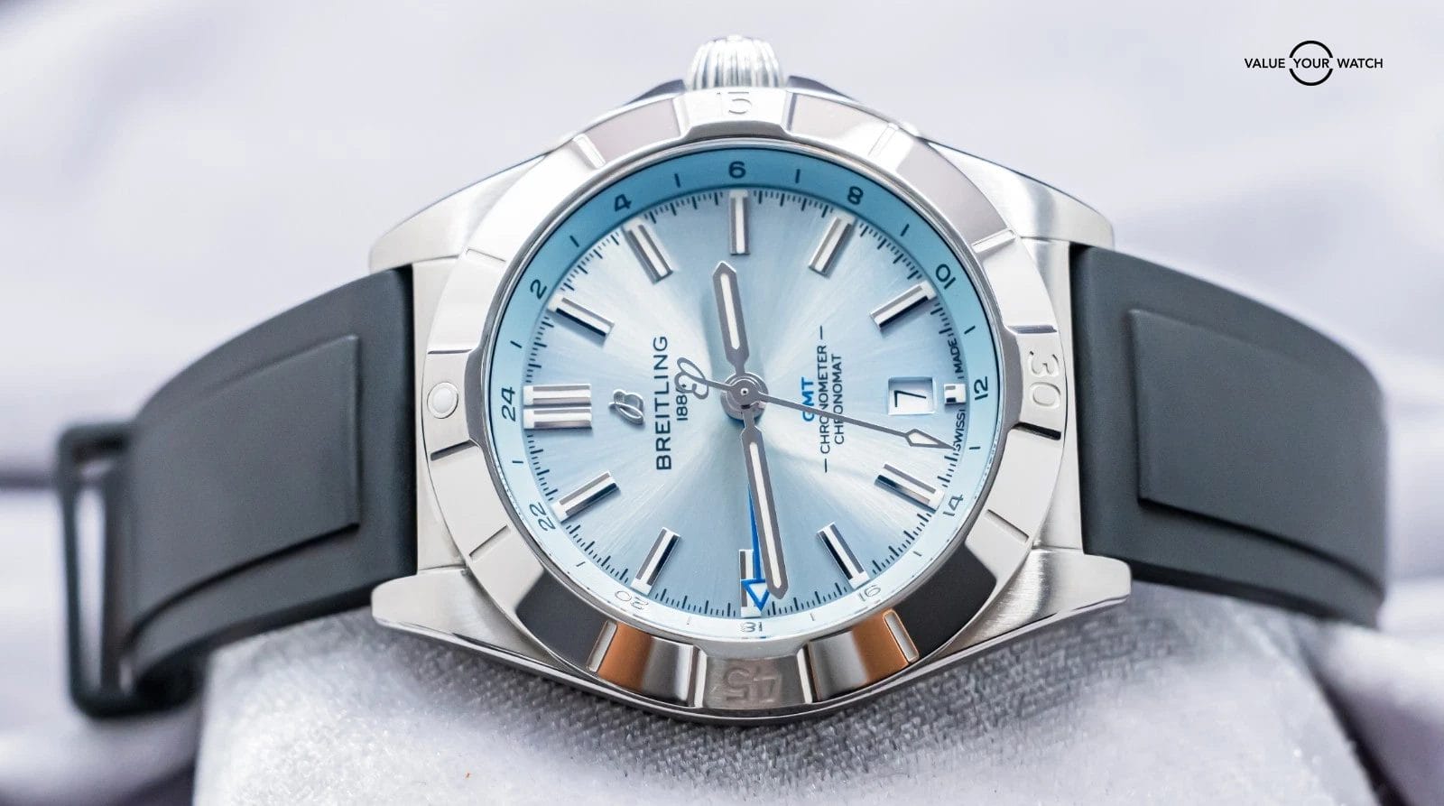 The watch is in a great condition with only very minor wear, nothing notable. Keeping great time when tested on our timegrapher! Do excuse dust/lint in the pictures from the photography process. This model has only been out for a few years; there are very few on the secondary market, and even with our heavy specialty in Breitling, this is the first Chronomat Automatic GMT 40 we have owned with the Ice Blue. Super clean look and a very versatile all around piece, tons of bang for your buck with the Chronomat Automatic GMT 40!