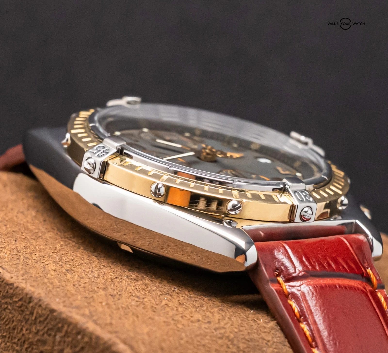 STUNNING Breitling Chronomat Vitesse 41mm with Black Dial and Yellow Gold Bezel on Custom Brown Leather Strap & Breitling Deploy Clasp! Arrives as watch only and is a ton of watch for the money on the secondary market. This exact Yellow Gold & Black Dial with Numerals is a relatively rare combination, striking on wrist. This exact Chronomat is vintage with likely late 1990s manufacture. Ready to be on wrist!