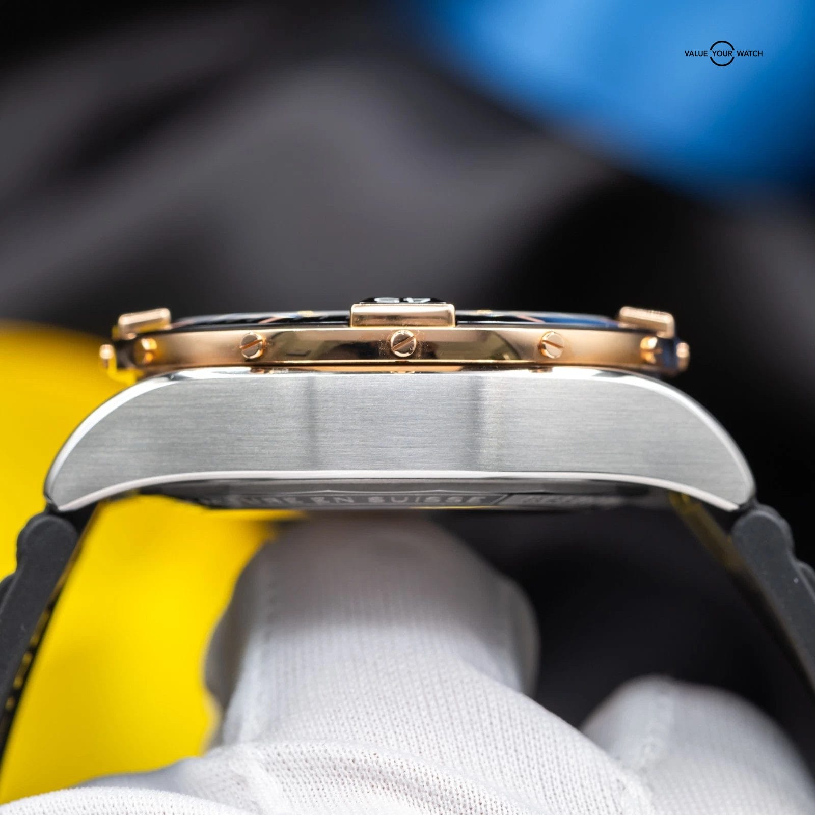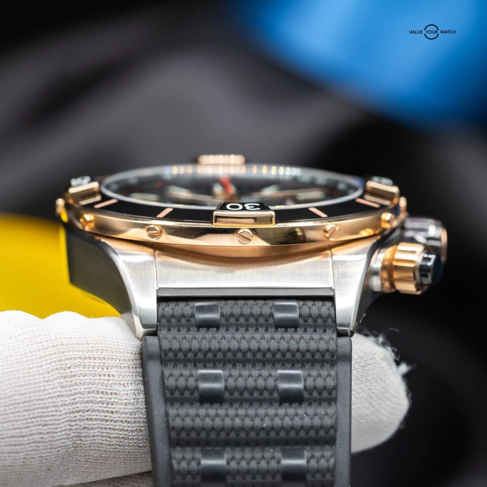 • Bezel: Unidirectional Rotating Bezel with Signature Rider Tabs (Rose Gold Accents)