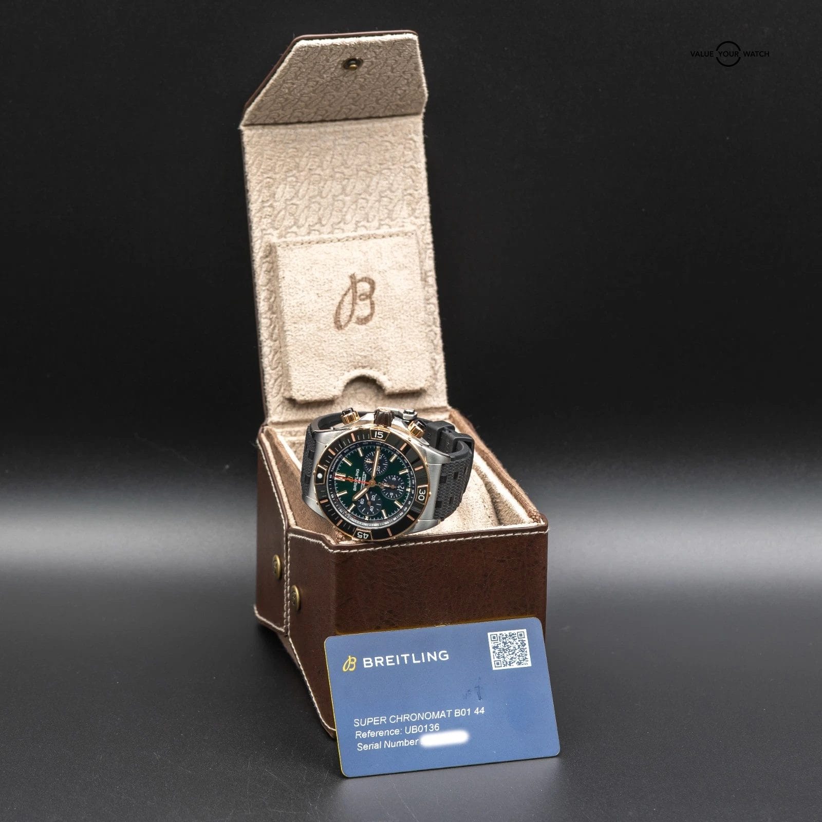 The Breitling Super Chronomat B01 44 UB0136251L1S1 delivers unmistakable wrist presence. Its intense emerald green dial is rich, vibrant, and unlike anything else on the market—shifting in tone as light hits its surface. Framed by a stainless-steel case with rose gold bezel, hands, hour markers, accents and pushers, this Chronomat blends sport and luxury with confidence. The side profile is striking, showcasing Breitling’s robust case architecture and signature rider-tab bezel design. Paired with the iconic rubber “Rouleaux”-inspired strap, the color combination and metal contrast create a look that commands attention without excess. Under Breitling warranty until 11/27/2031, this example delivers striking visual presence along with long-term peace of mind.